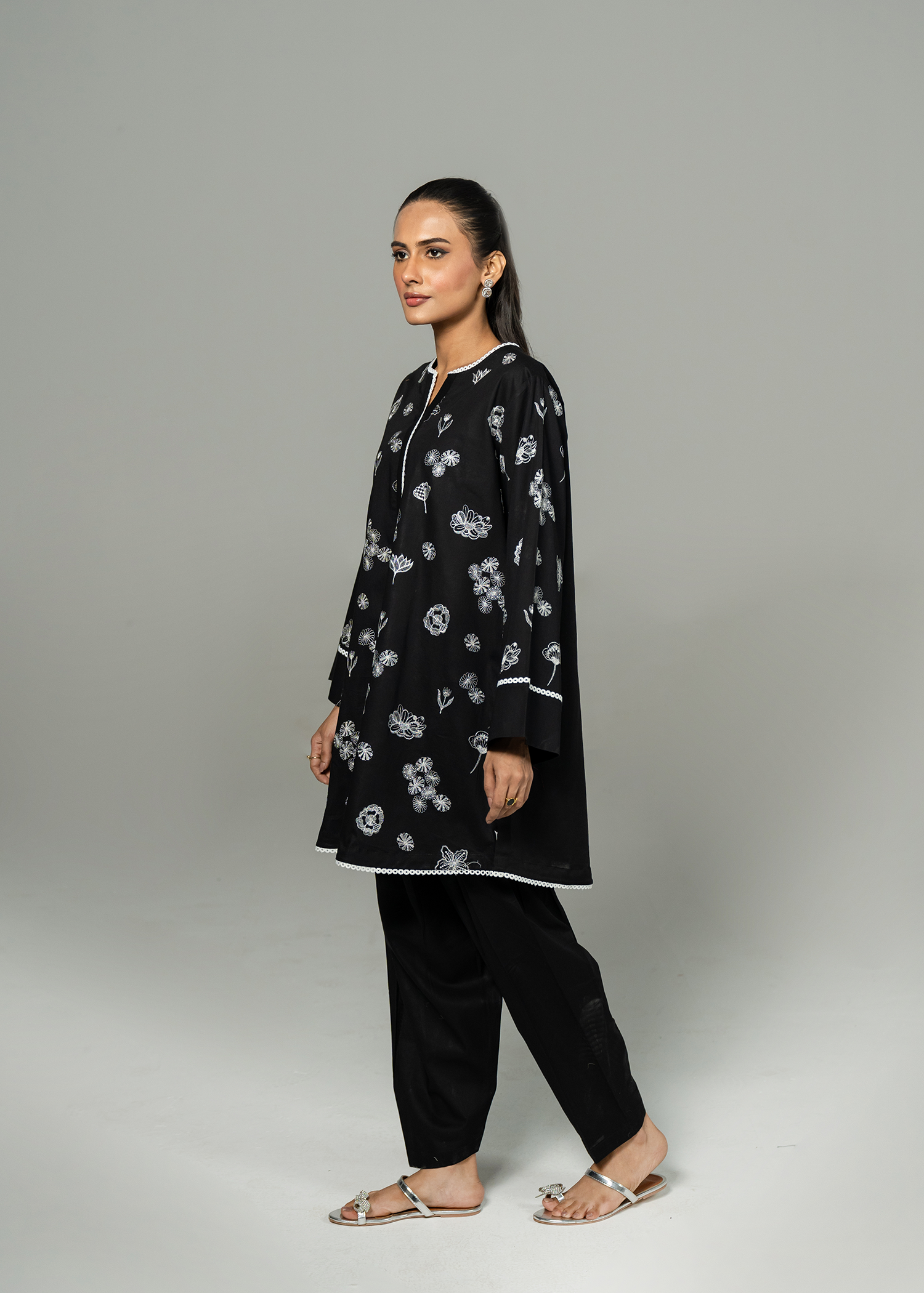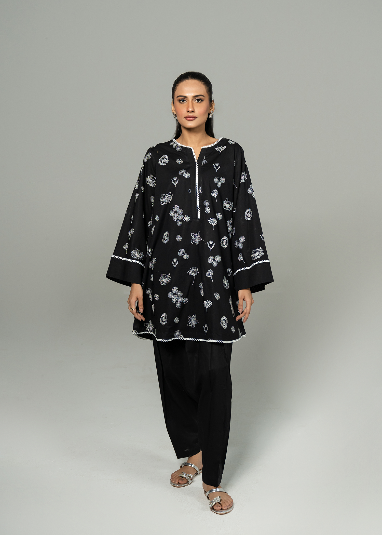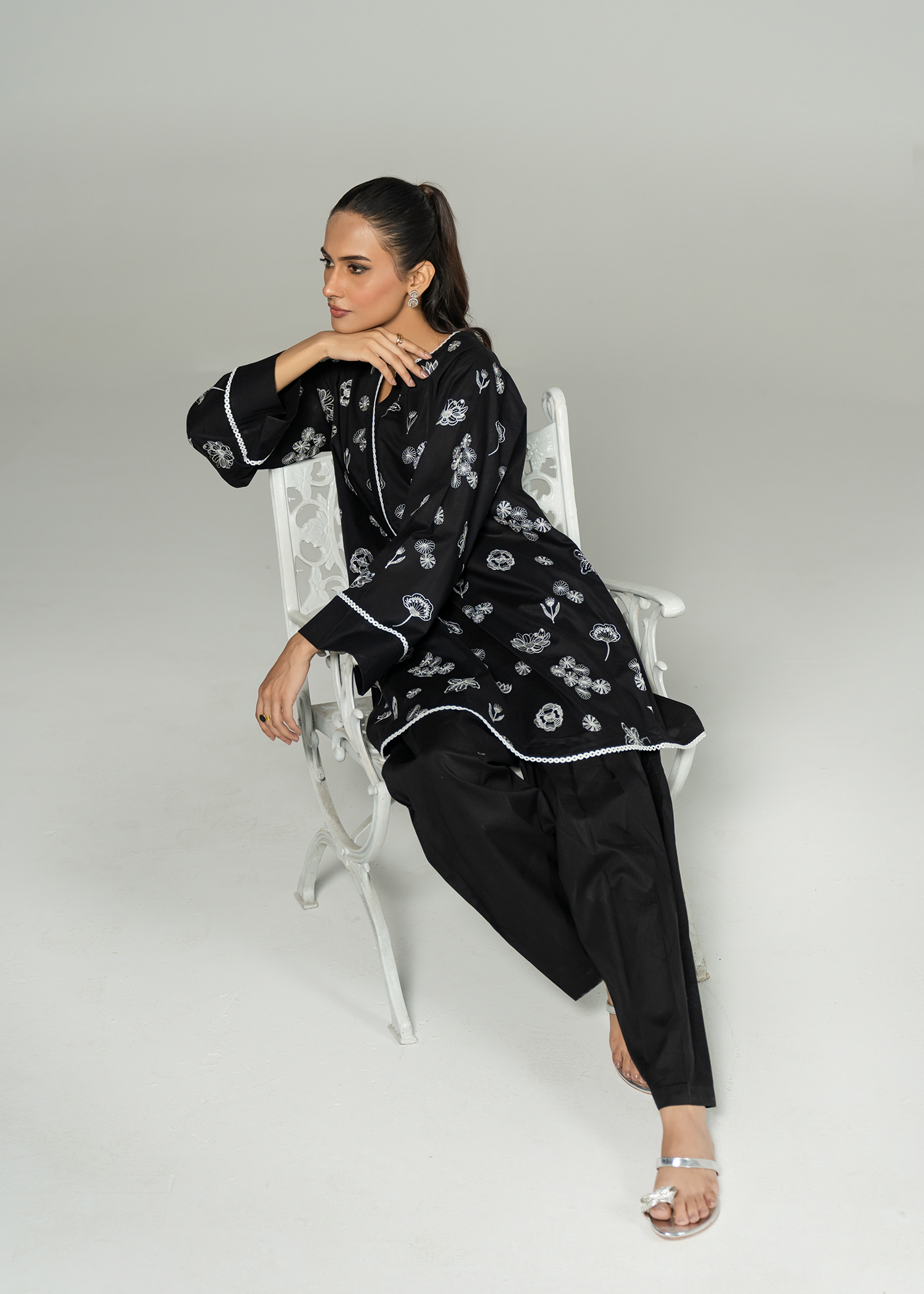 Black short kurta paired with a smart-fit shalwar, featuring striking white-on-black monochrome embroidery. The design incorporates a mix of intricate stitches, adding depth and detail to this bold, modern look.