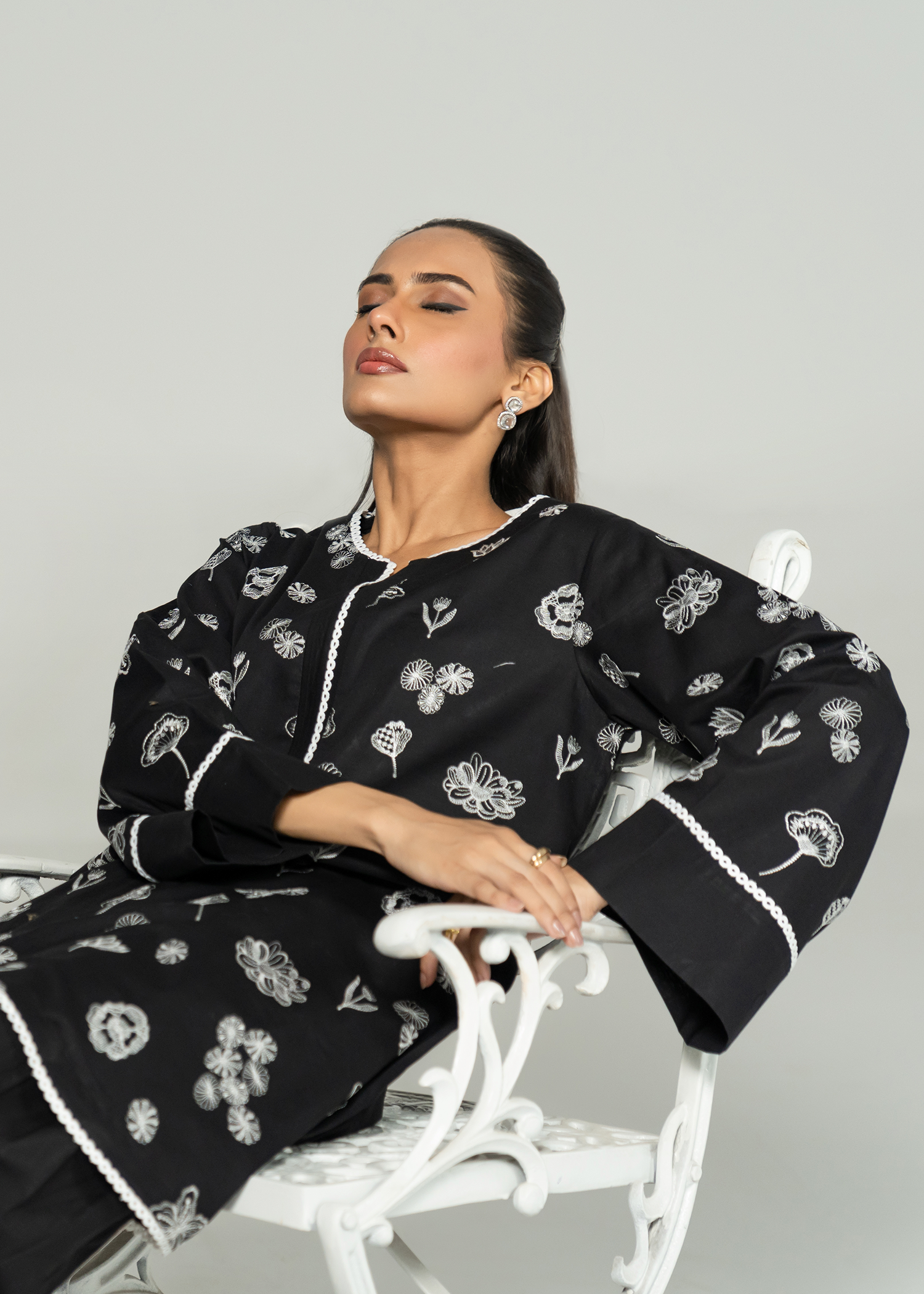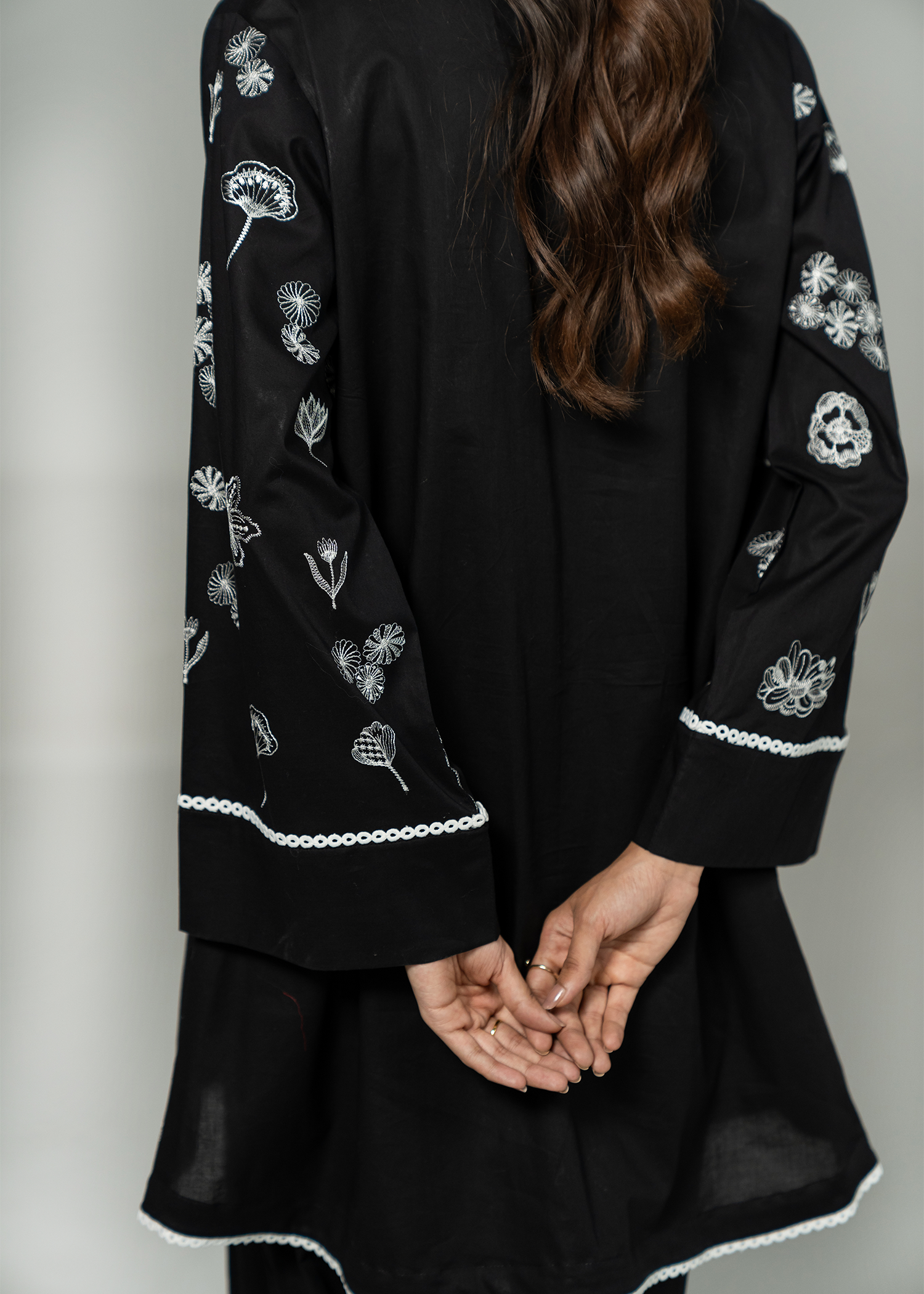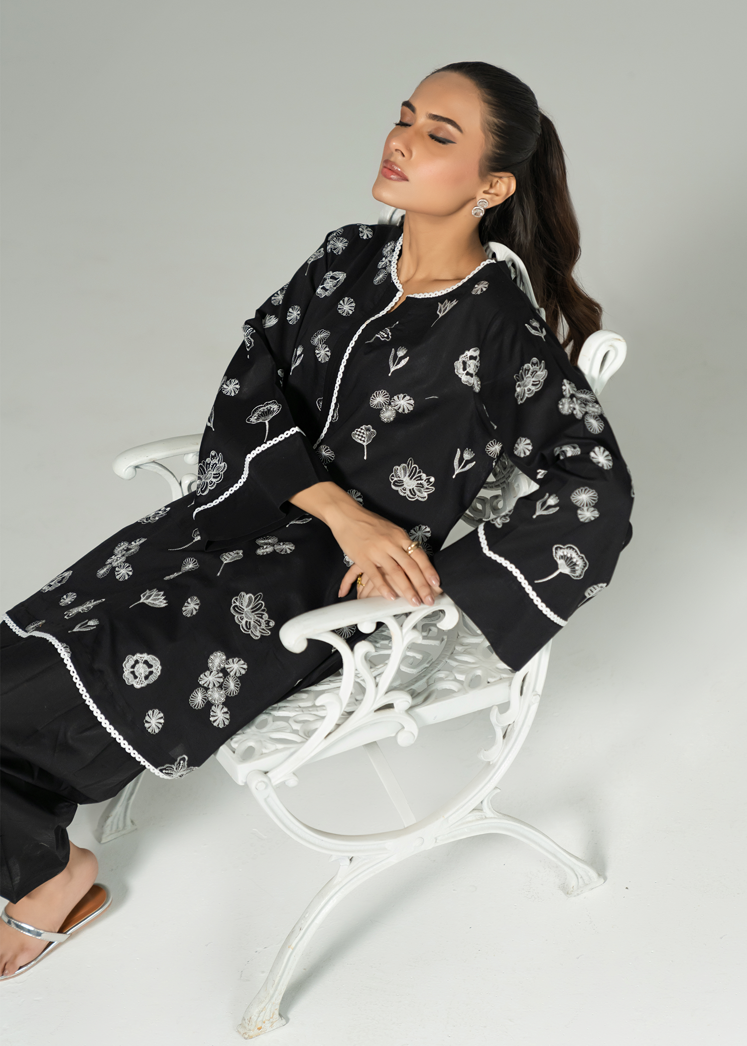 Black short kurta paired with a smart-fit shalwar, featuring striking white-on-black monochrome embroidery. The design incorporates a mix of intricate stitches, adding depth and detail to this bold, modern look.