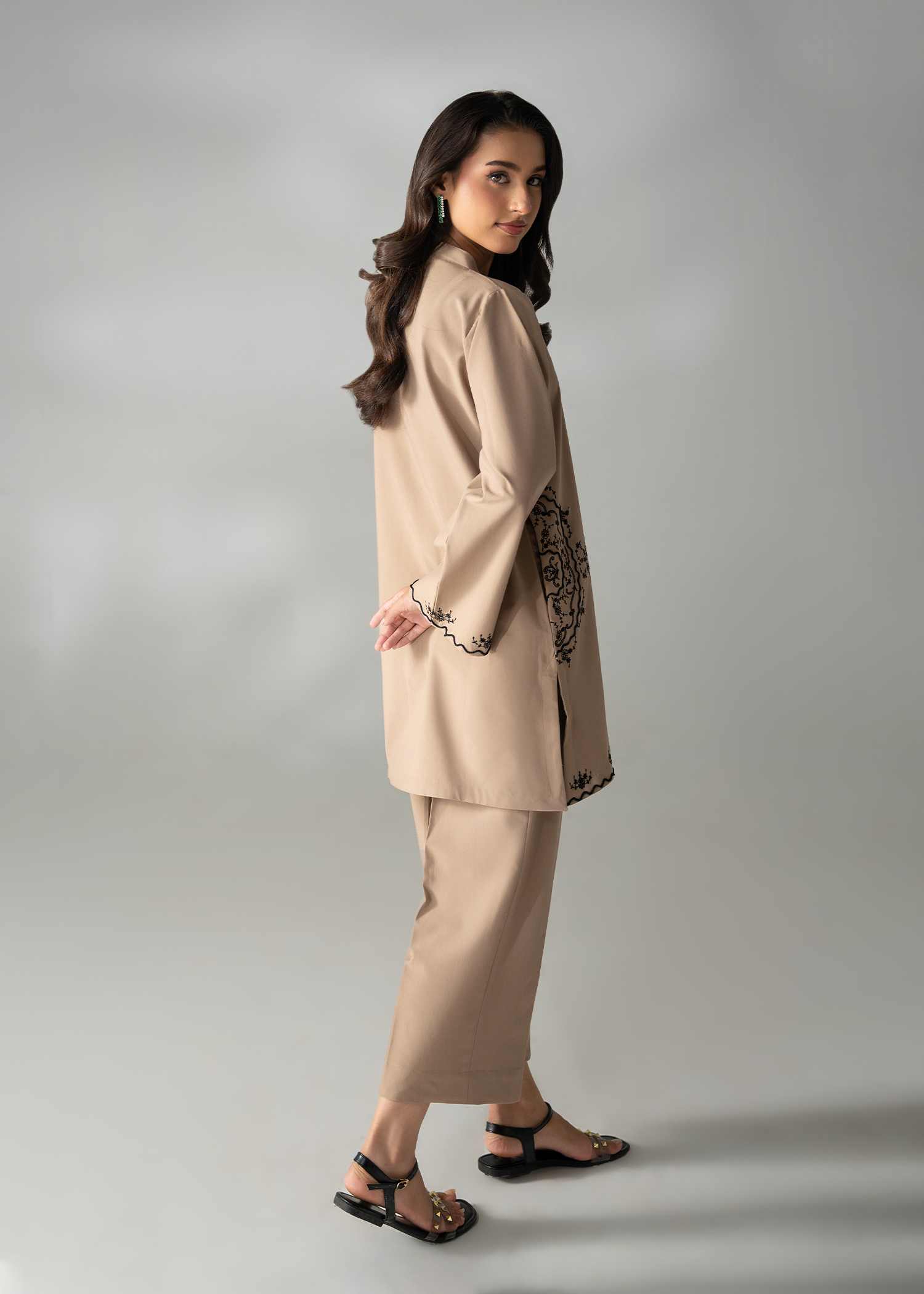 Elegant two-piece co-ord set with black 3D-effect dori embroidery in floral and wavy patterns on the front and sleeves. Features embroidered side pockets for subtle detail. Perfect for casual yet sophisticated style.