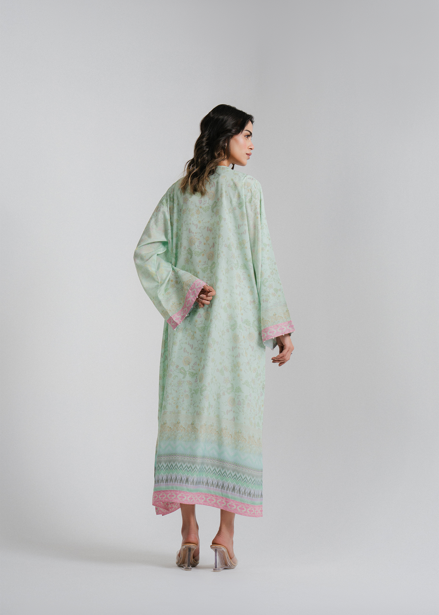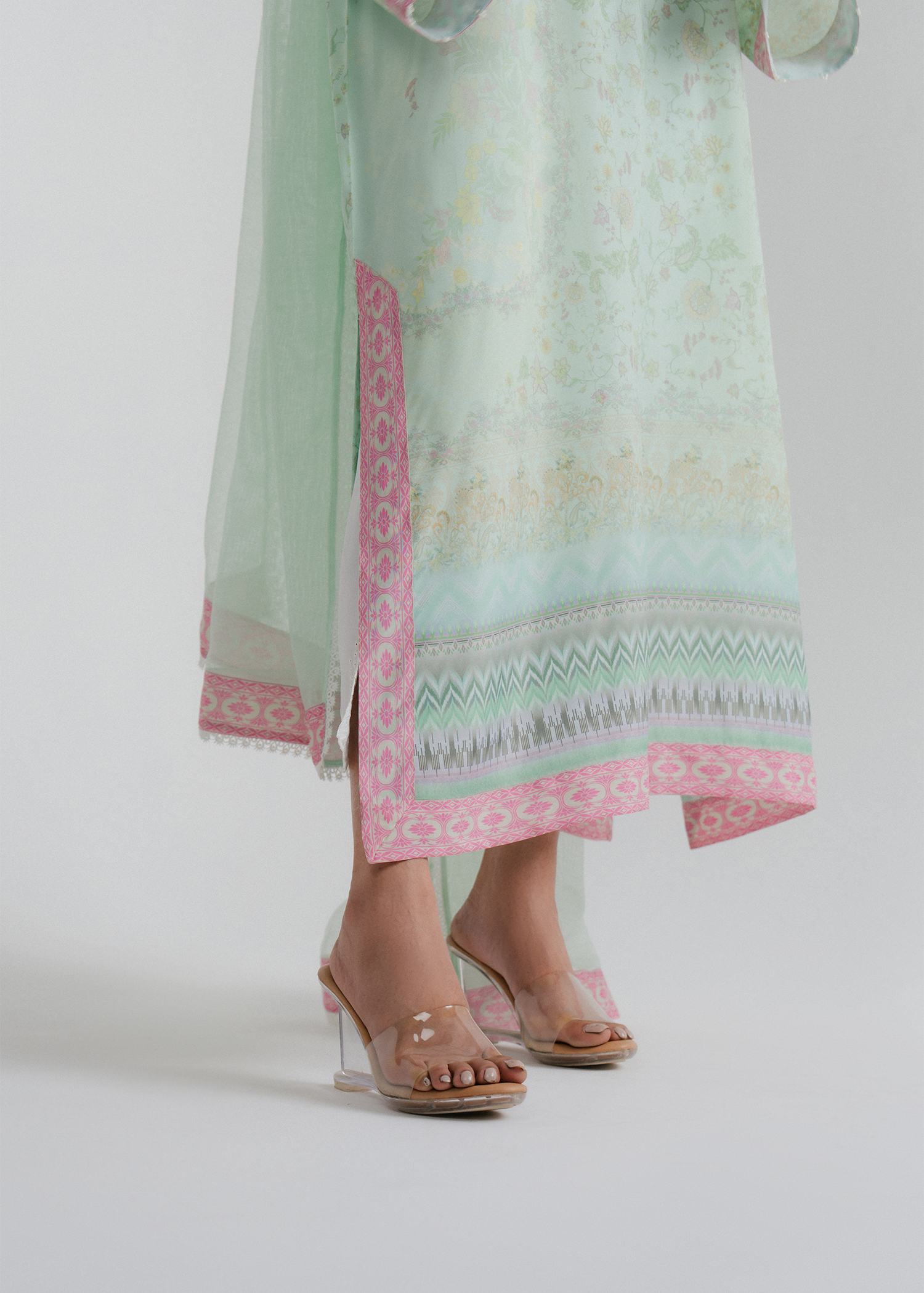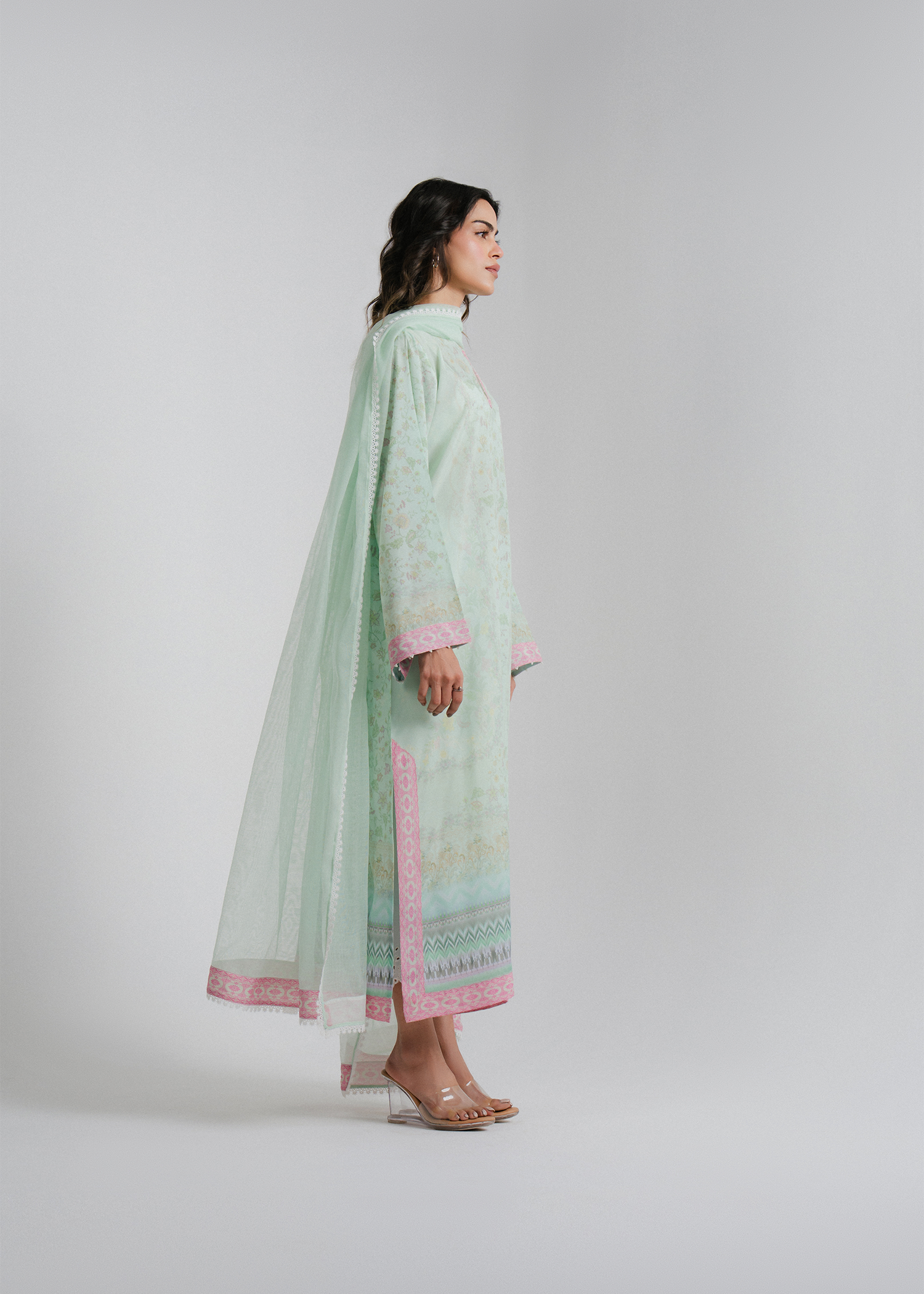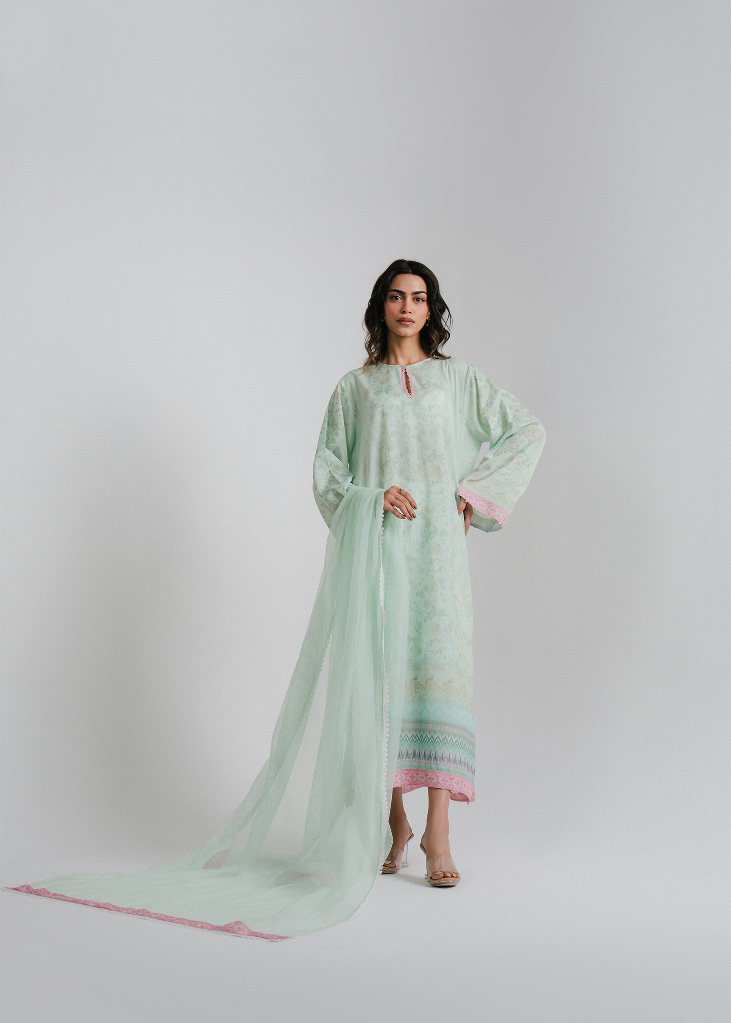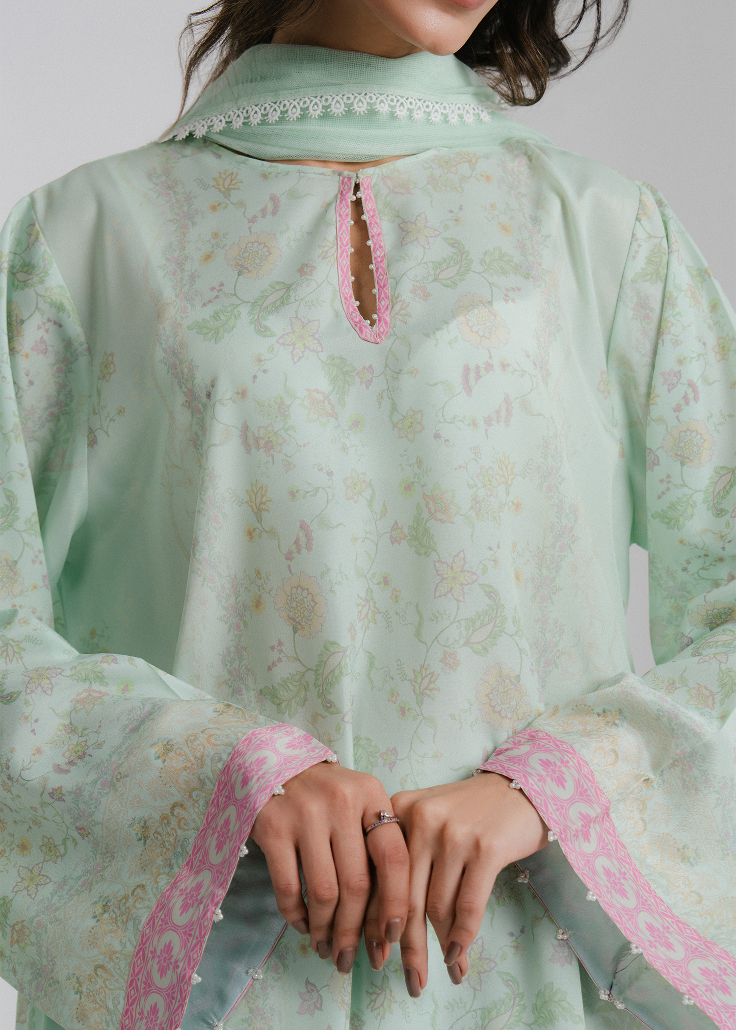 Pastel aqua 2-piece floral printed outfit with minimal pearls on the neckline and sleeves. Paired with a soft net dupatta featuring a printed border for an elegant touch.