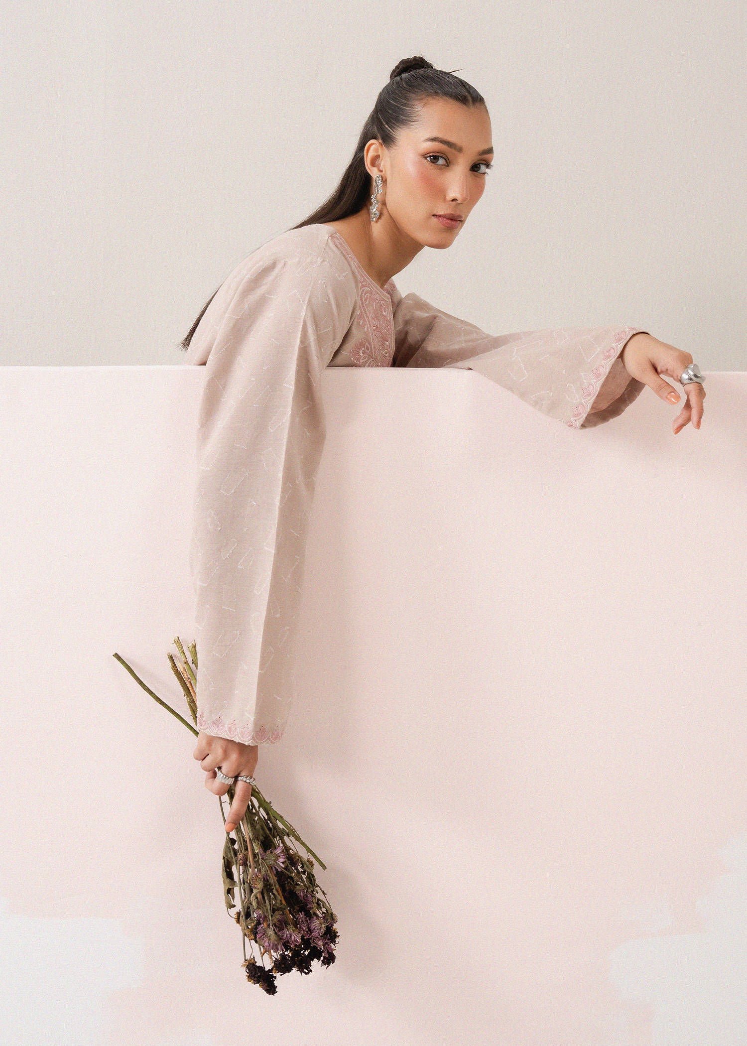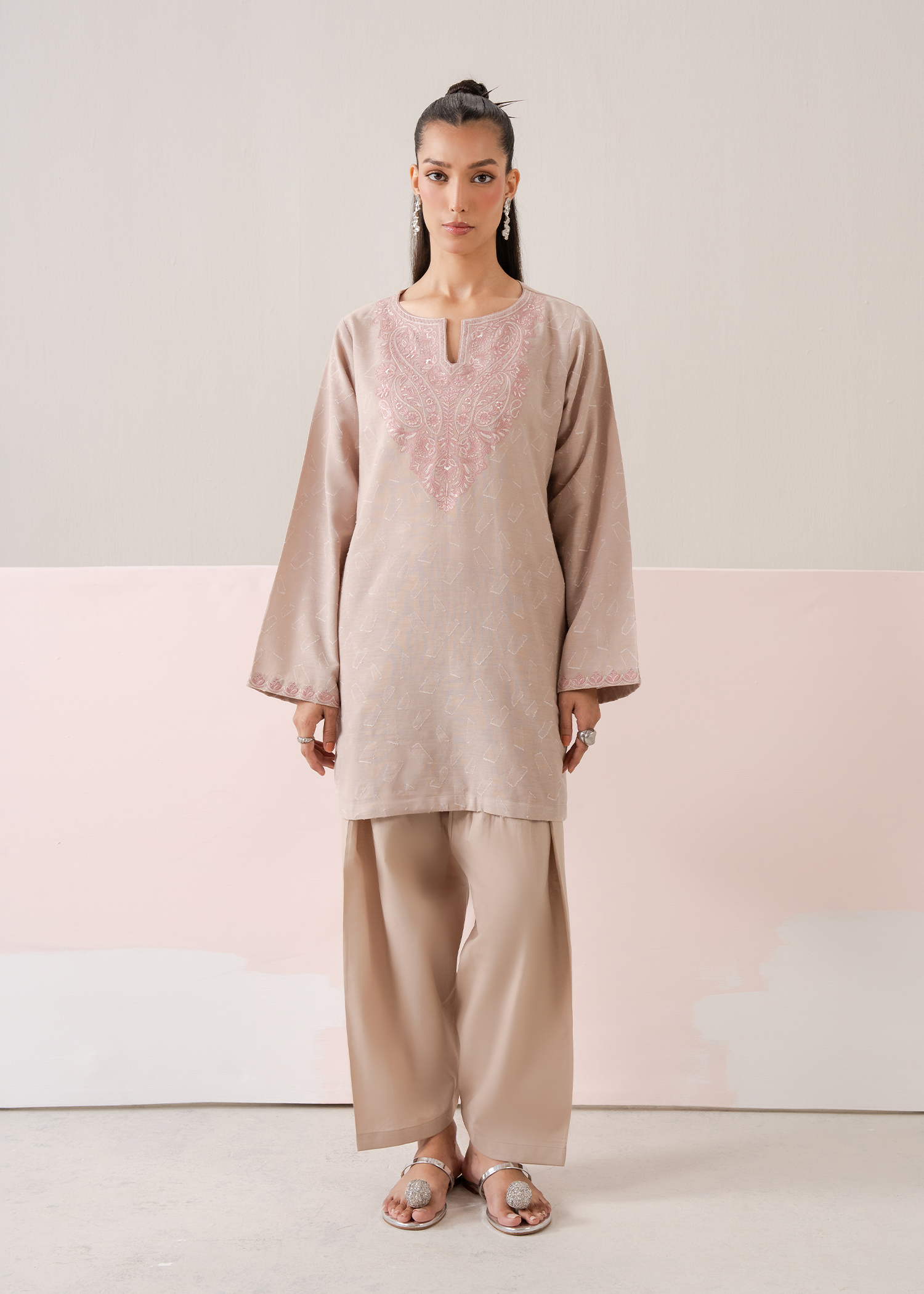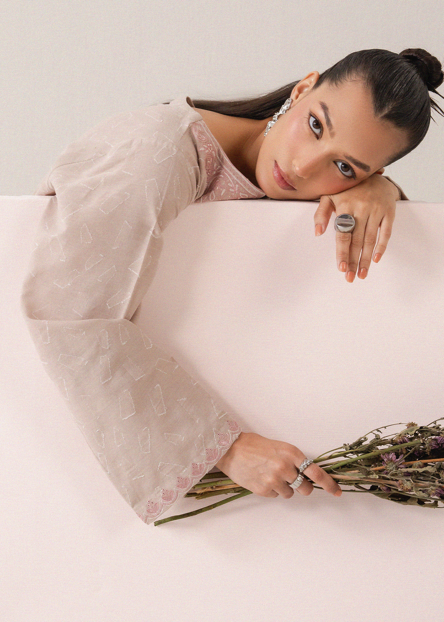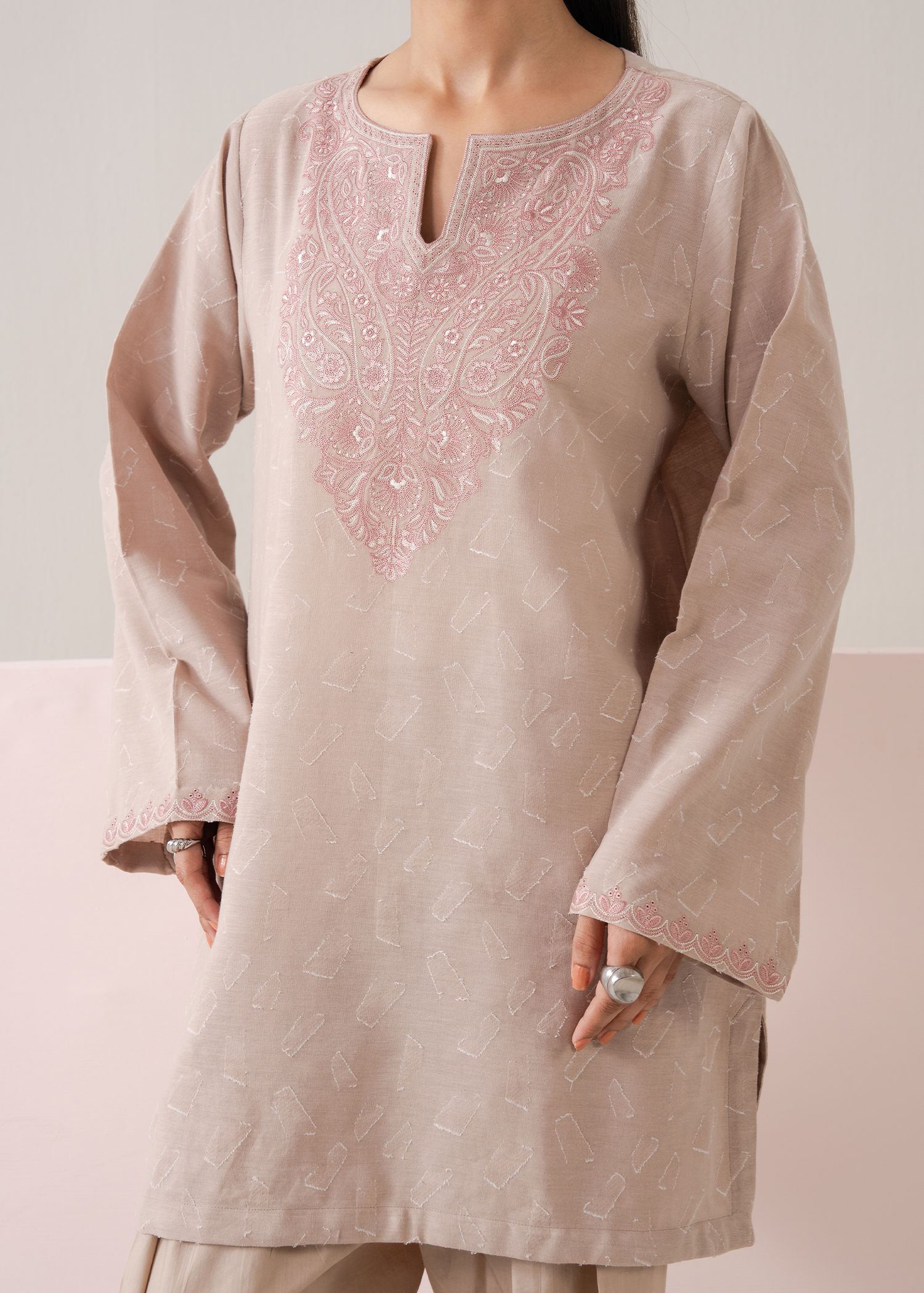 Cotton brochia shirt with a statement embroidered neckline, paired with plain cambric farshi shalwar for a modern and elegant look.