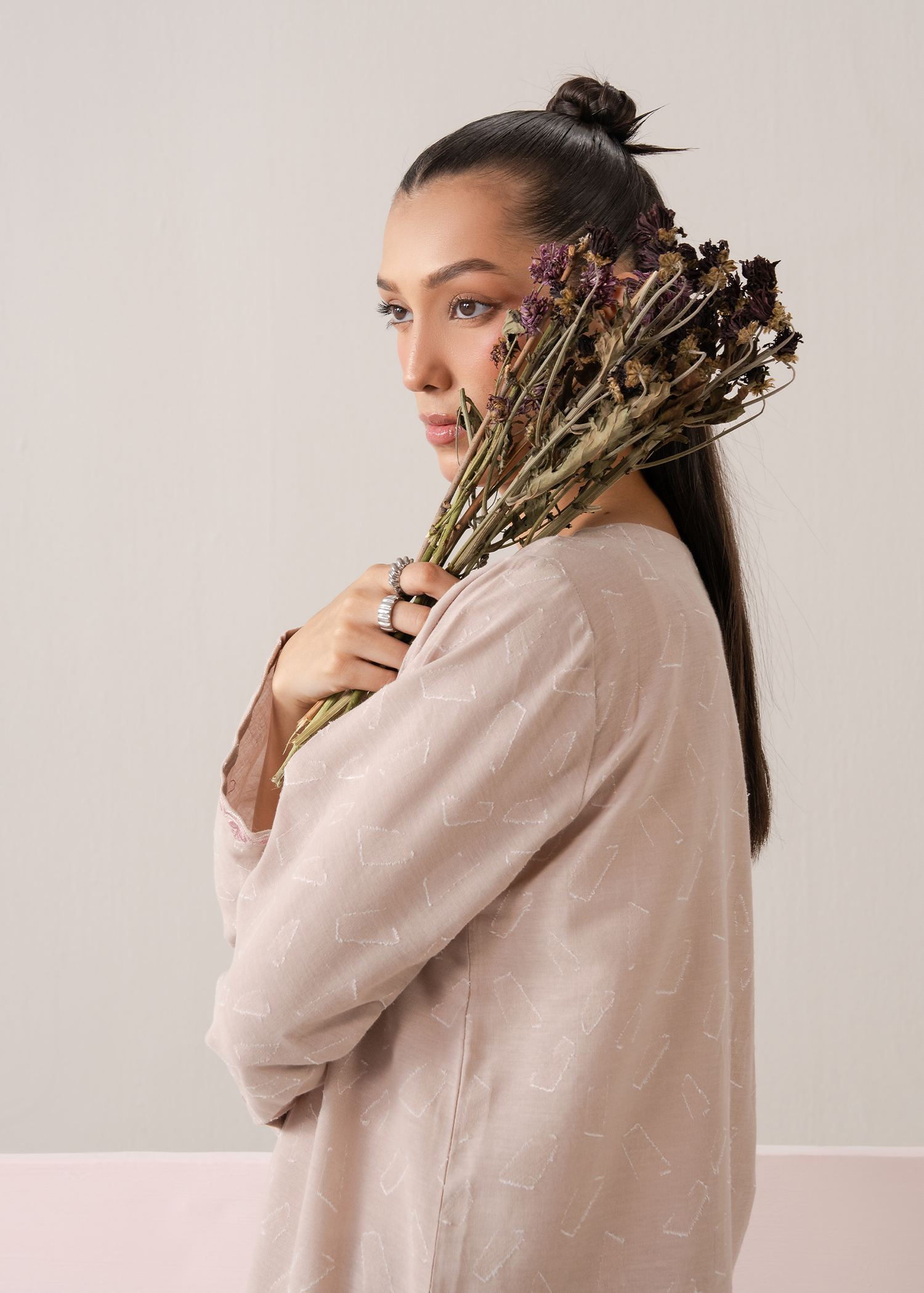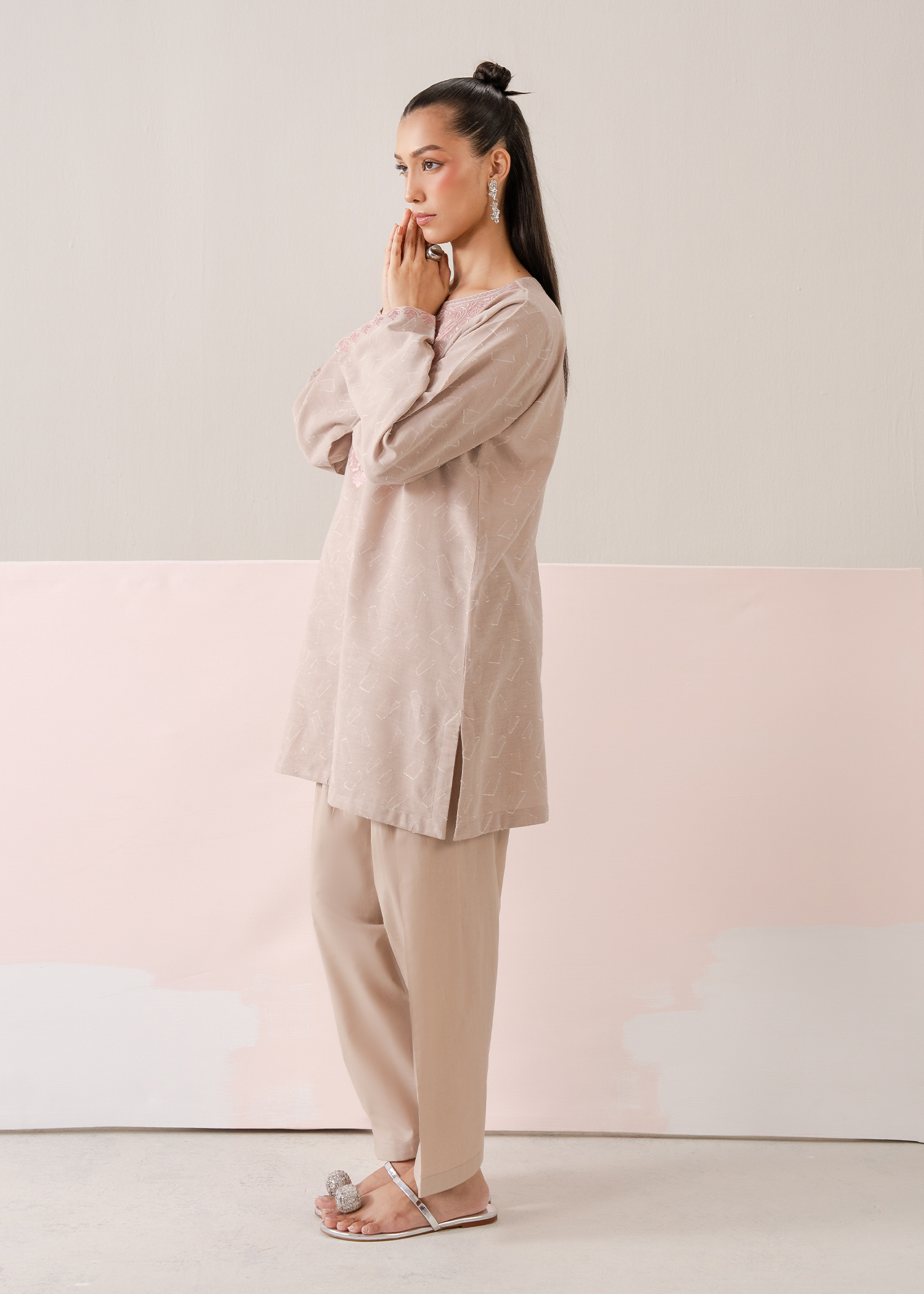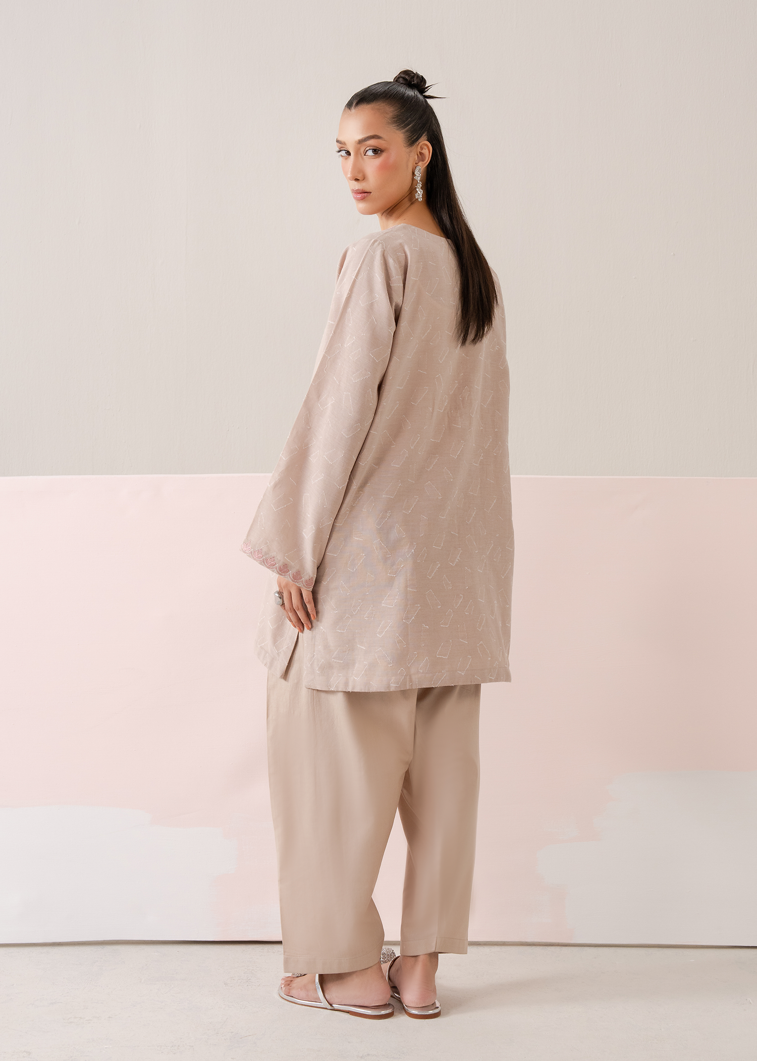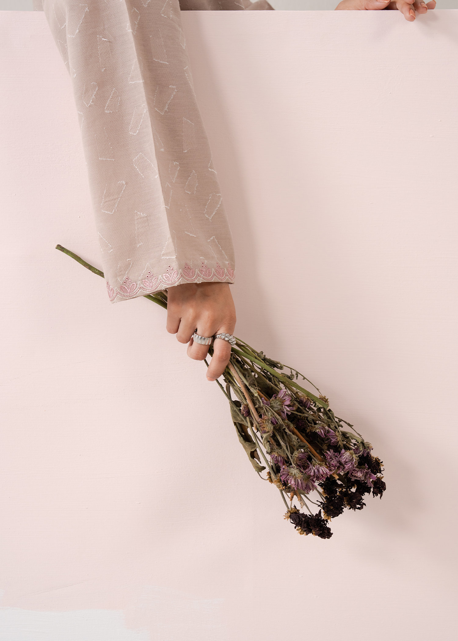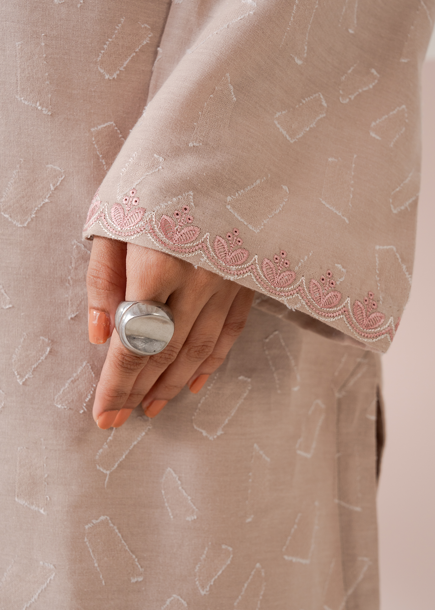 Cotton brochia shirt with a statement embroidered neckline, paired with plain cambric farshi shalwar for a modern and elegant look.