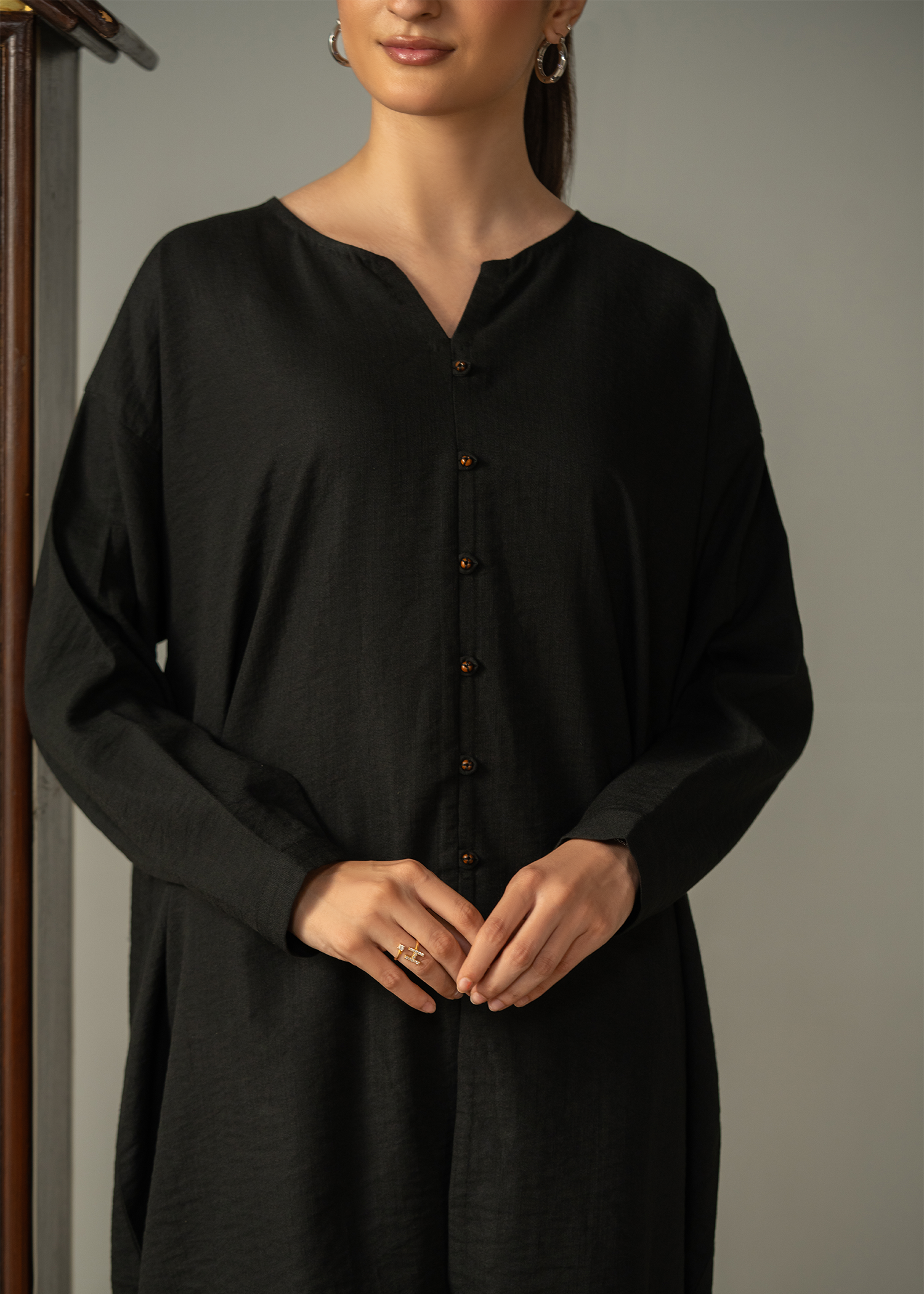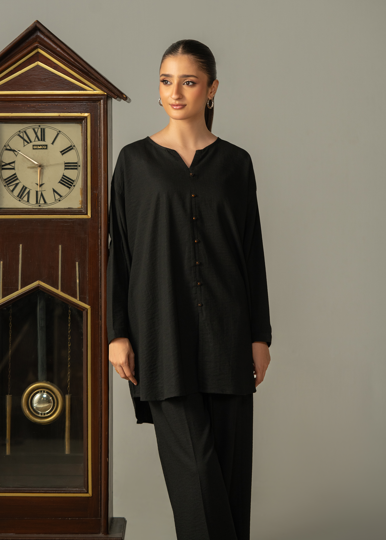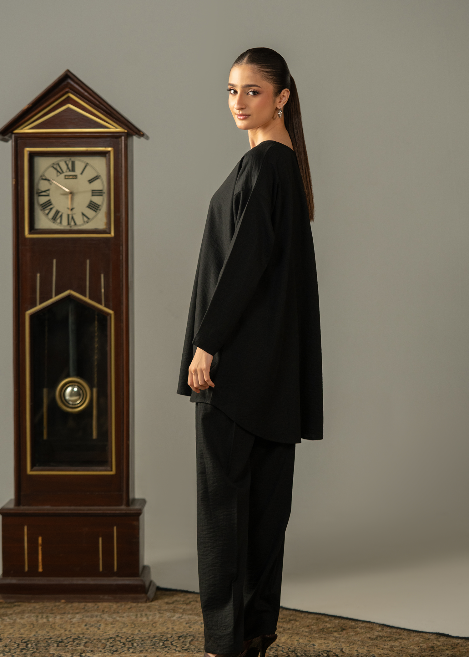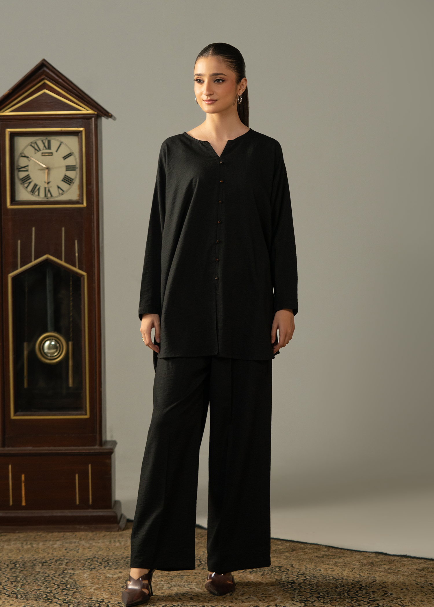 This loose-fit black shirt with button detailing in textured crush fabric pairs seamlessly with sleek straight-cut trousers, creating a look that is both comfortable and effortlessly sophisticated - ideal for everyday wear.