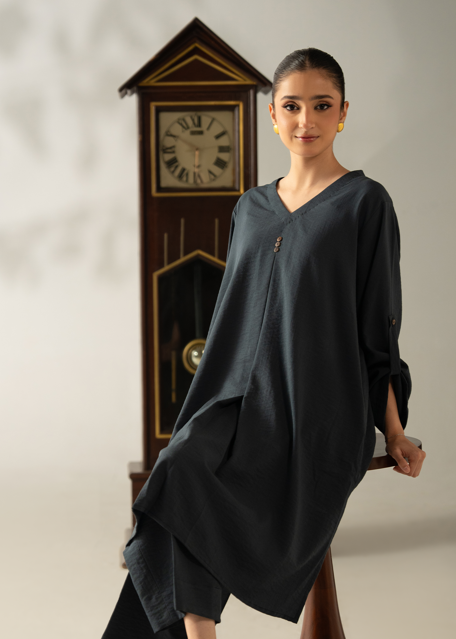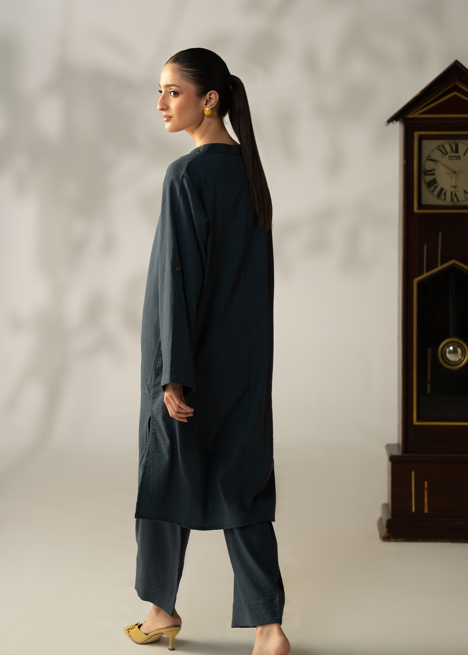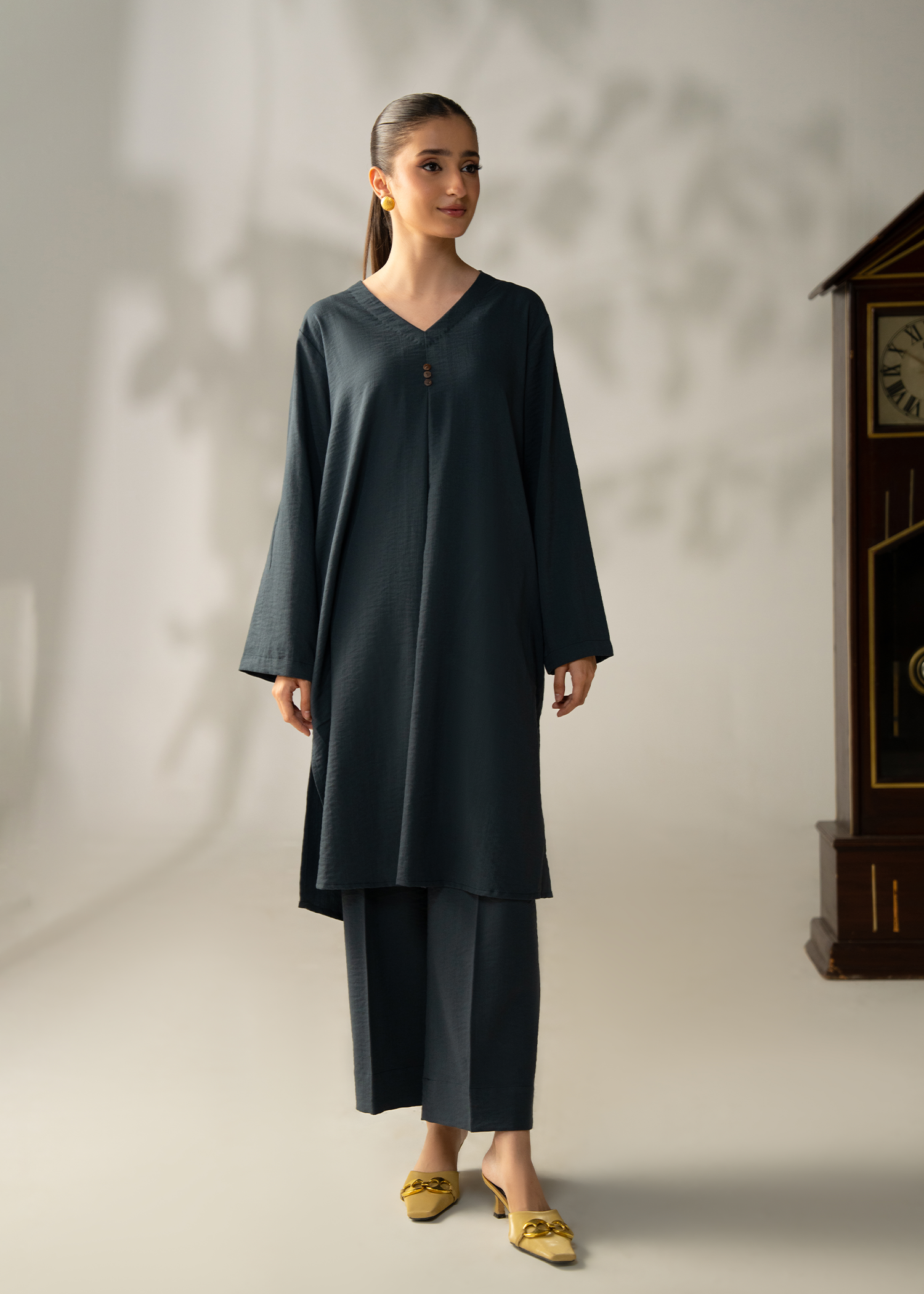 Textured crush co-ords in Blue featuring delicate button details on the shirt with a flattering V-neckline. Paired with sleek straight-cut trousers, this outfit is the perfect pick for an effortless and polished everyday style.