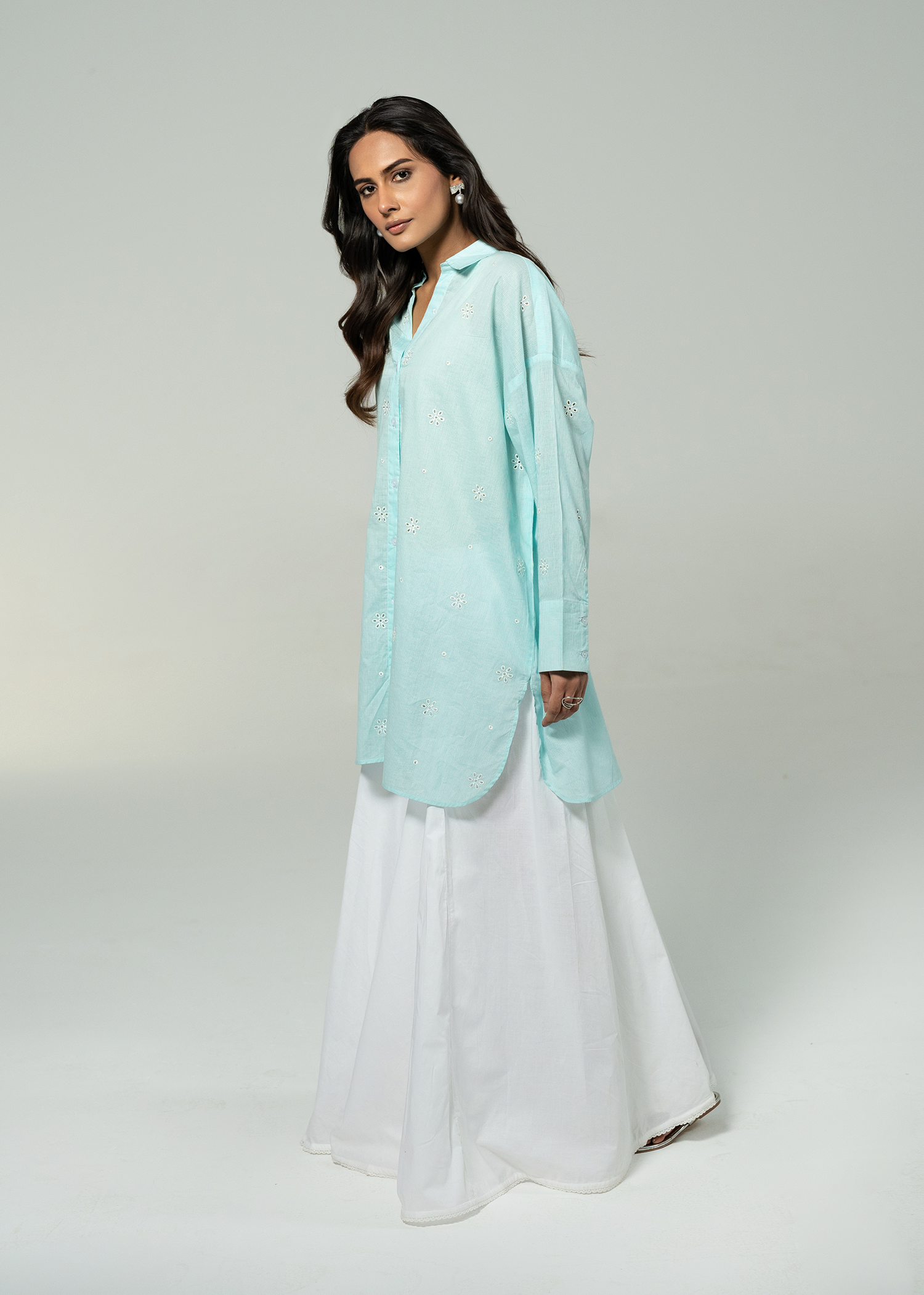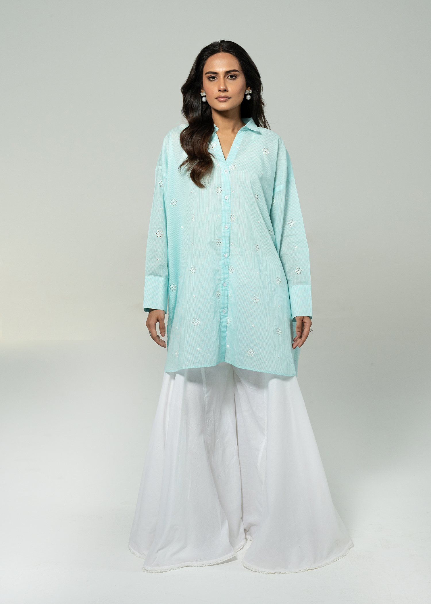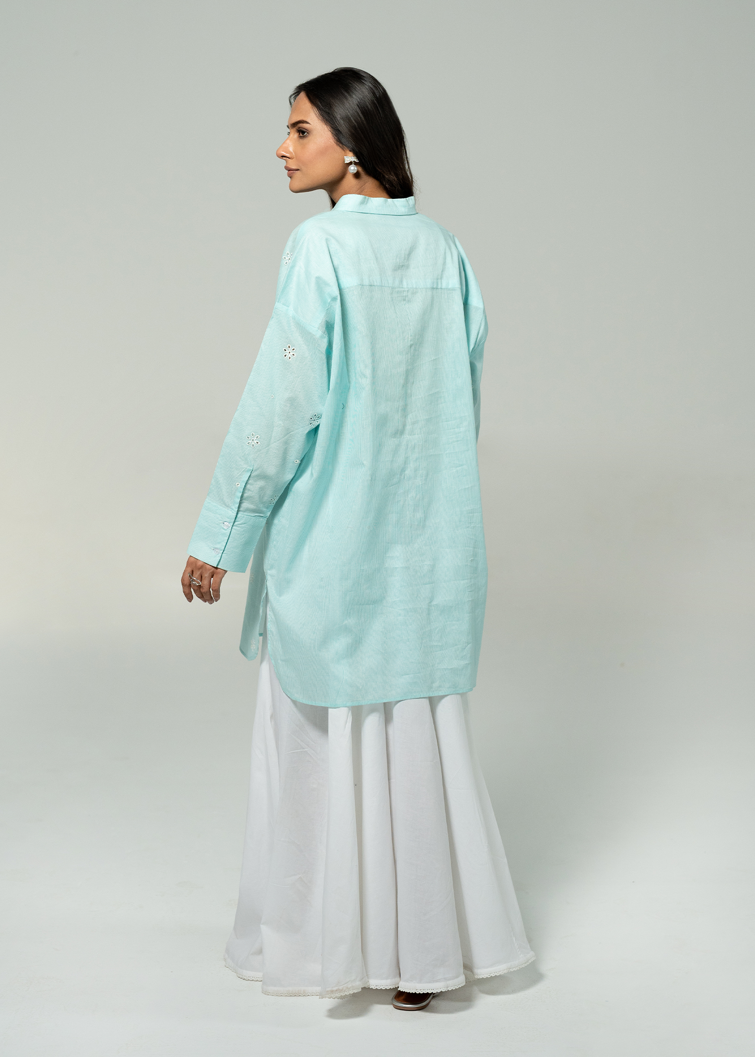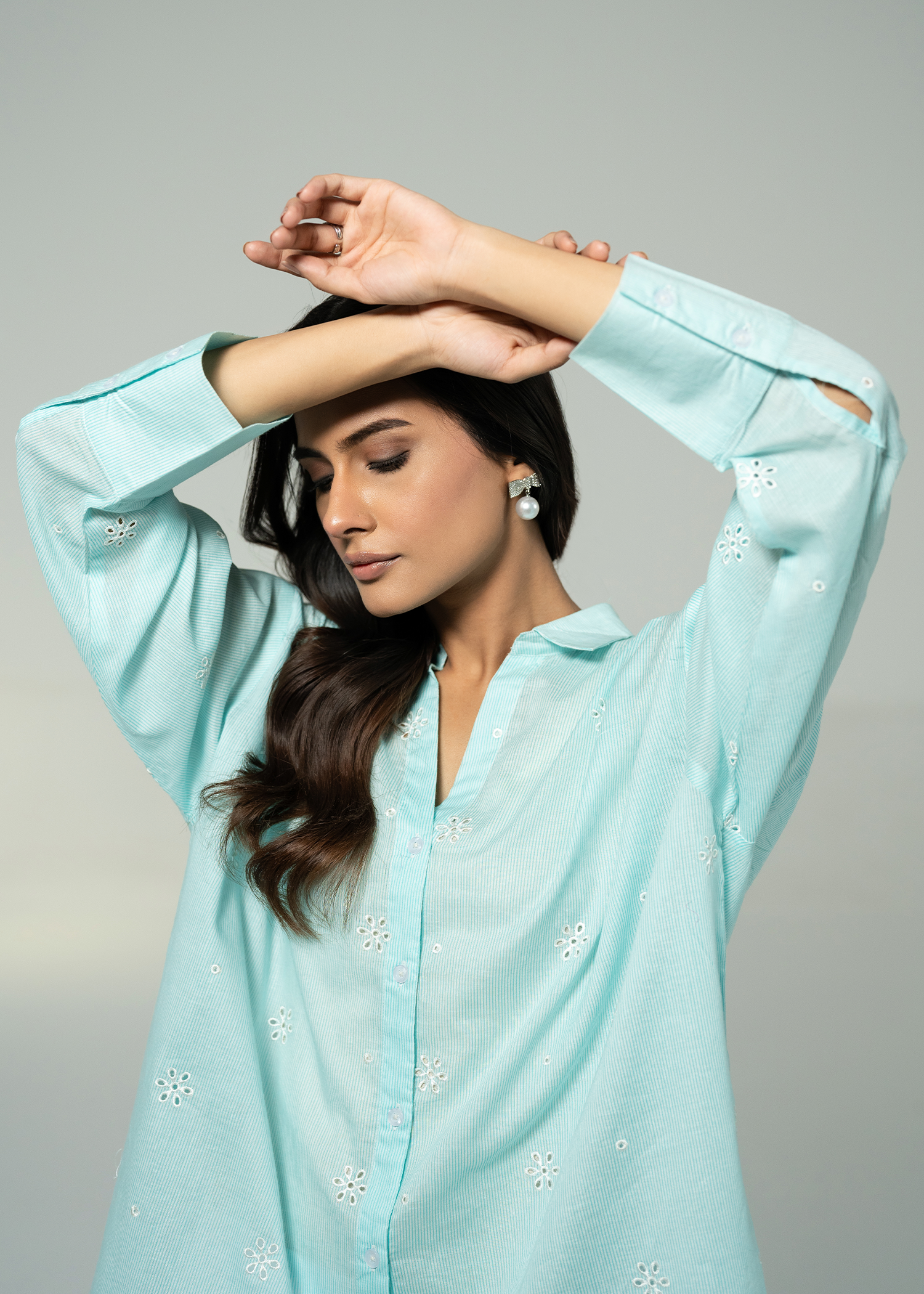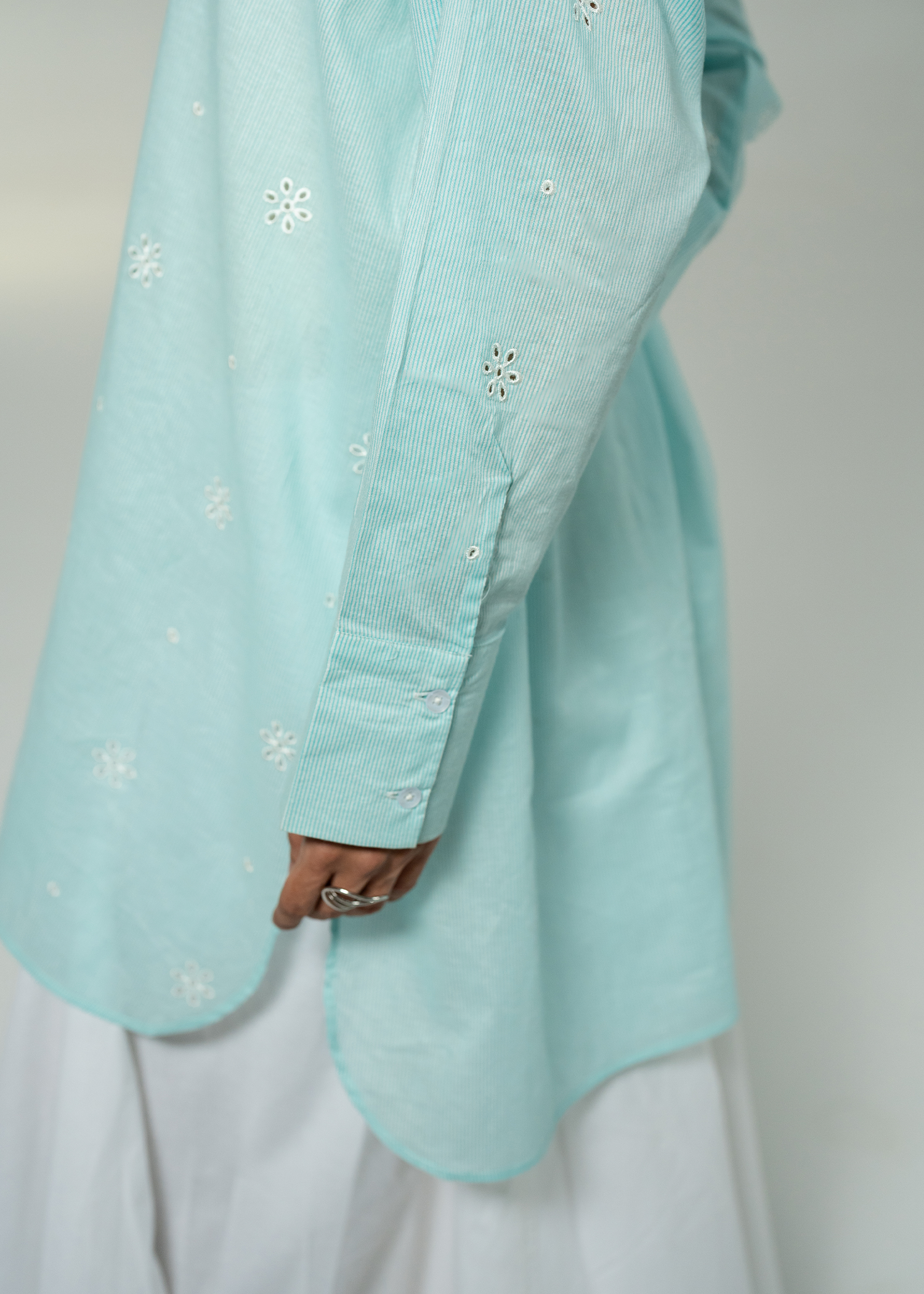 An oversized button down shirt with blue stripes and fine, borer embroidery for a simple yet elegant look. Free size can fit any size from small to large.