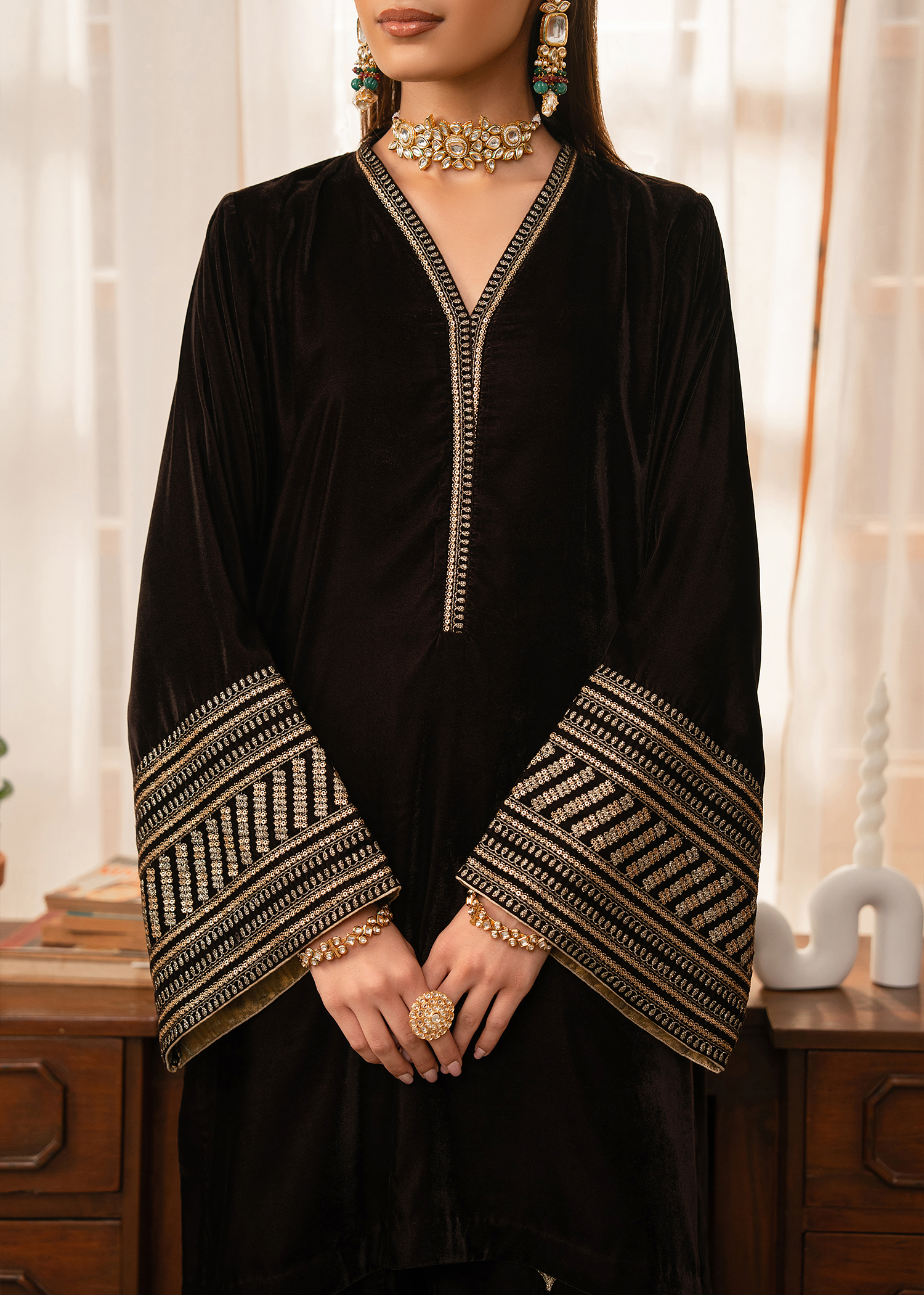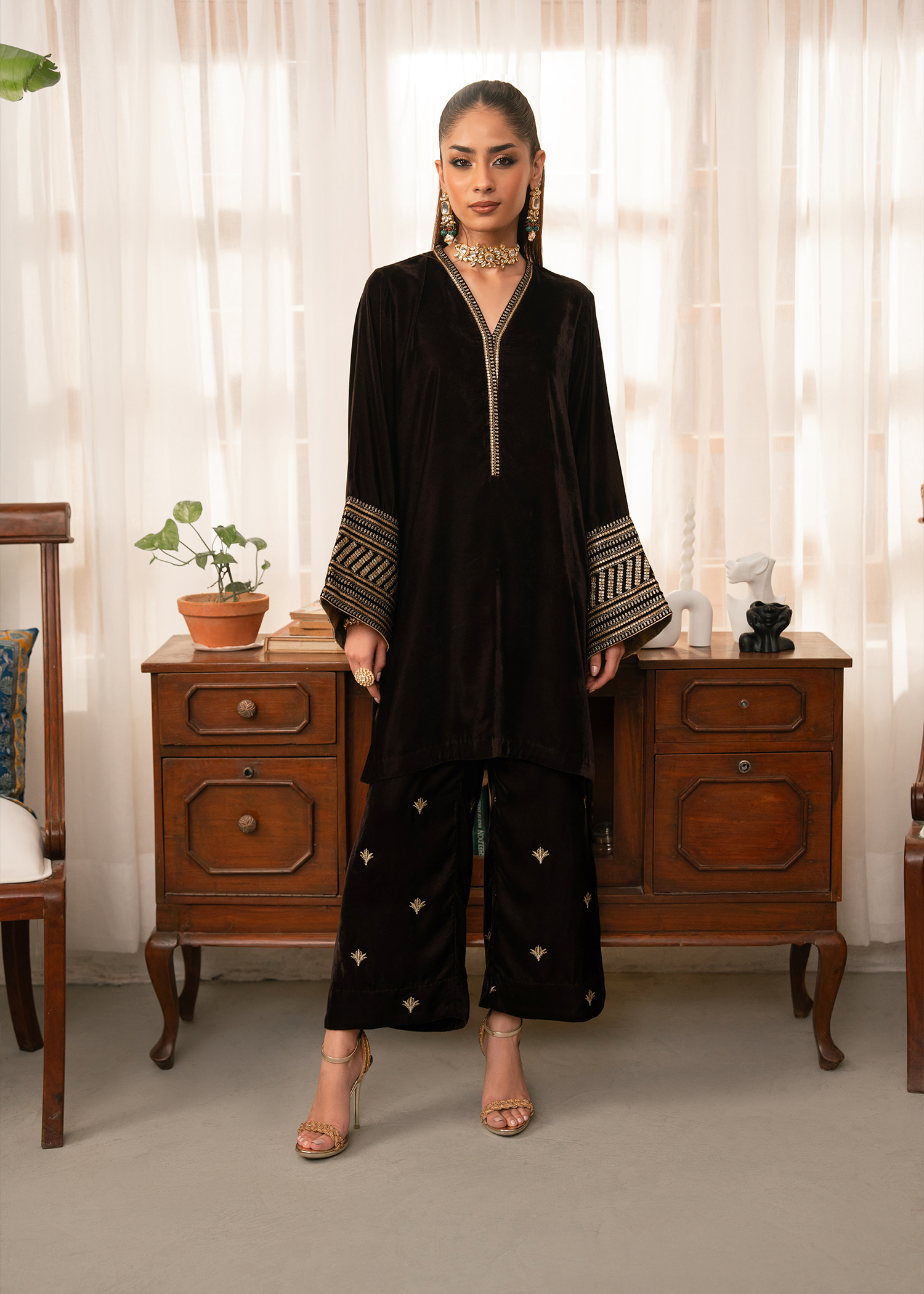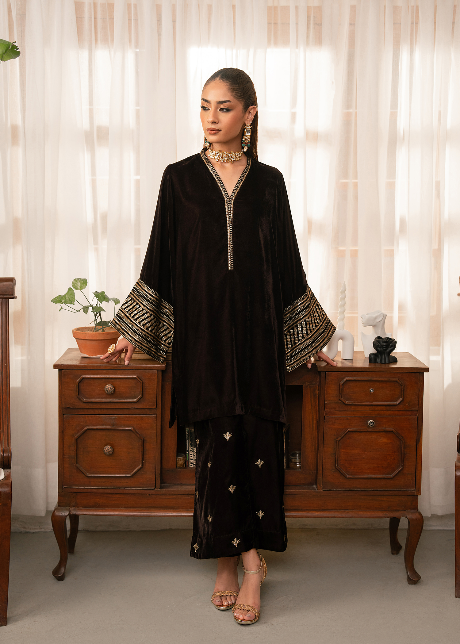 A dark brown mid length shirt paired with modern flared pants. Extensive use of gold tilla and gold sequins is used to create a composed pattern on the sleeves while same material is used to create a spray of motifs on the pants.