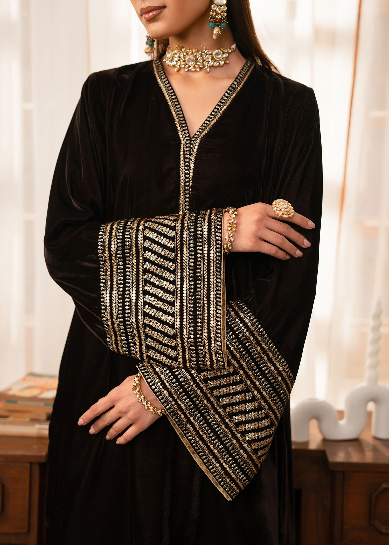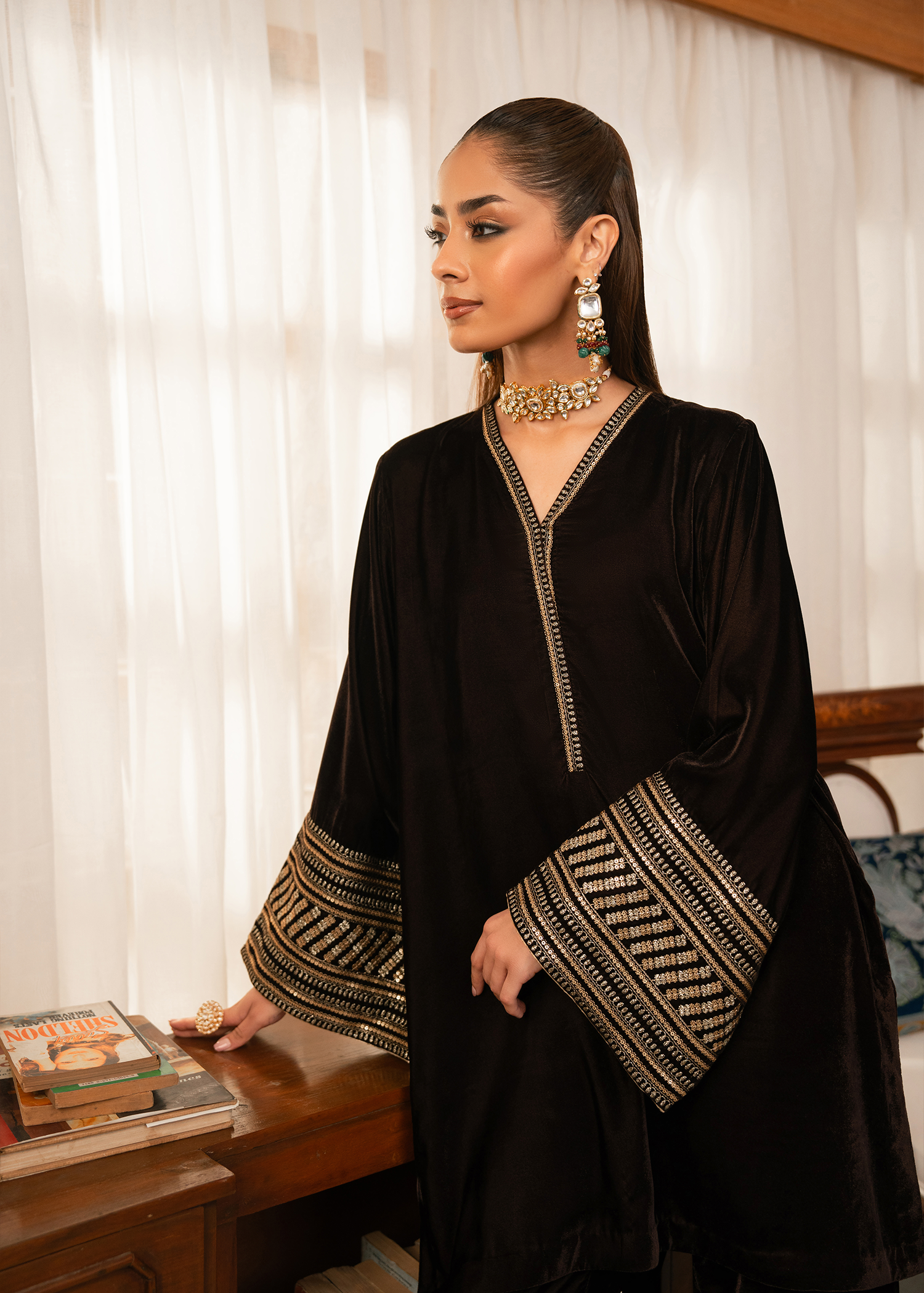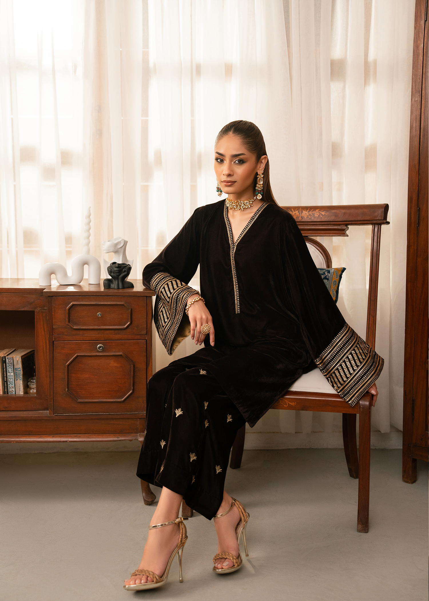 A dark brown mid length shirt paired with modern flared pants. Extensive use of gold tilla and gold sequins is used to create a composed pattern on the sleeves while same material is used to create a spray of motifs on the pants.