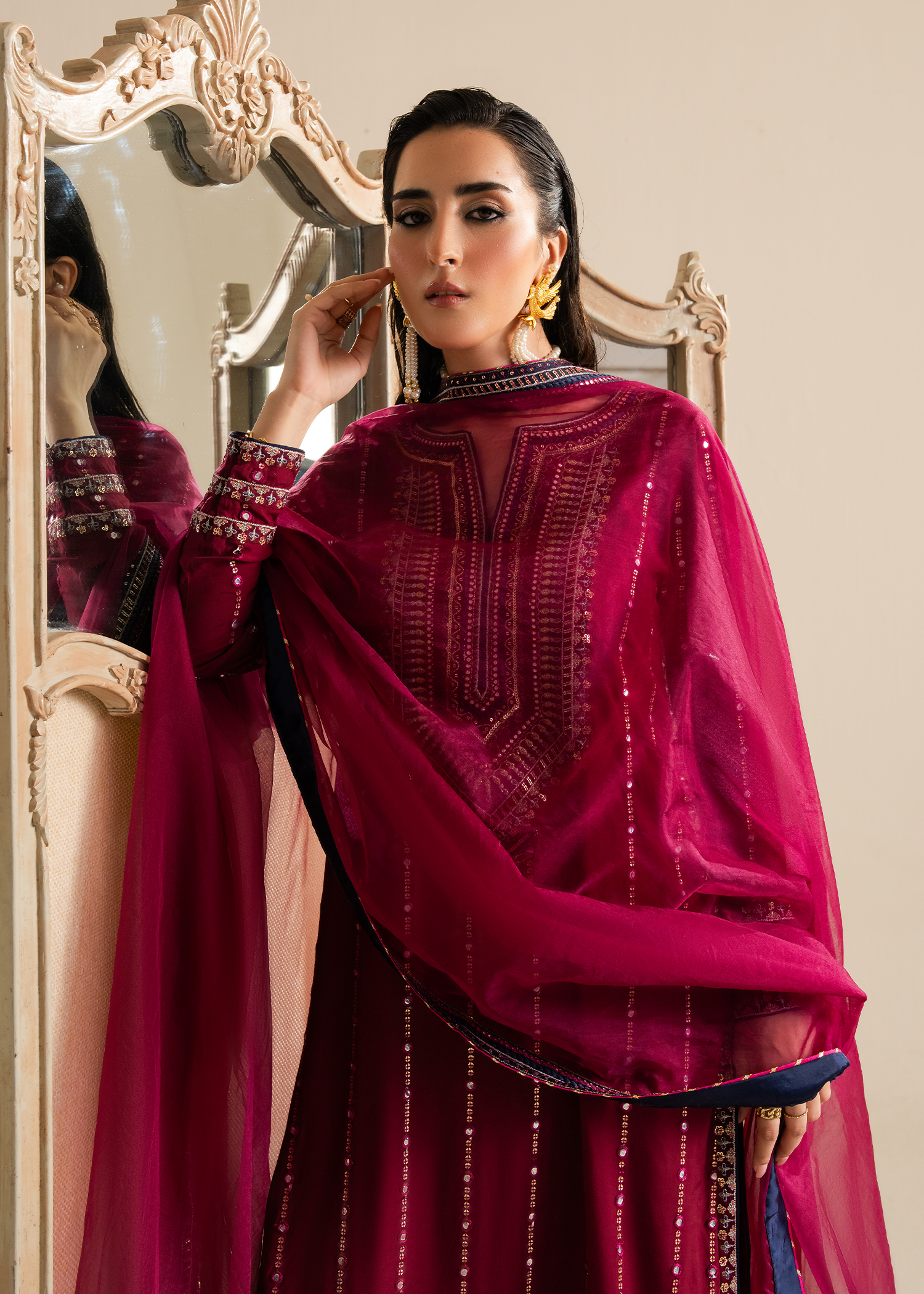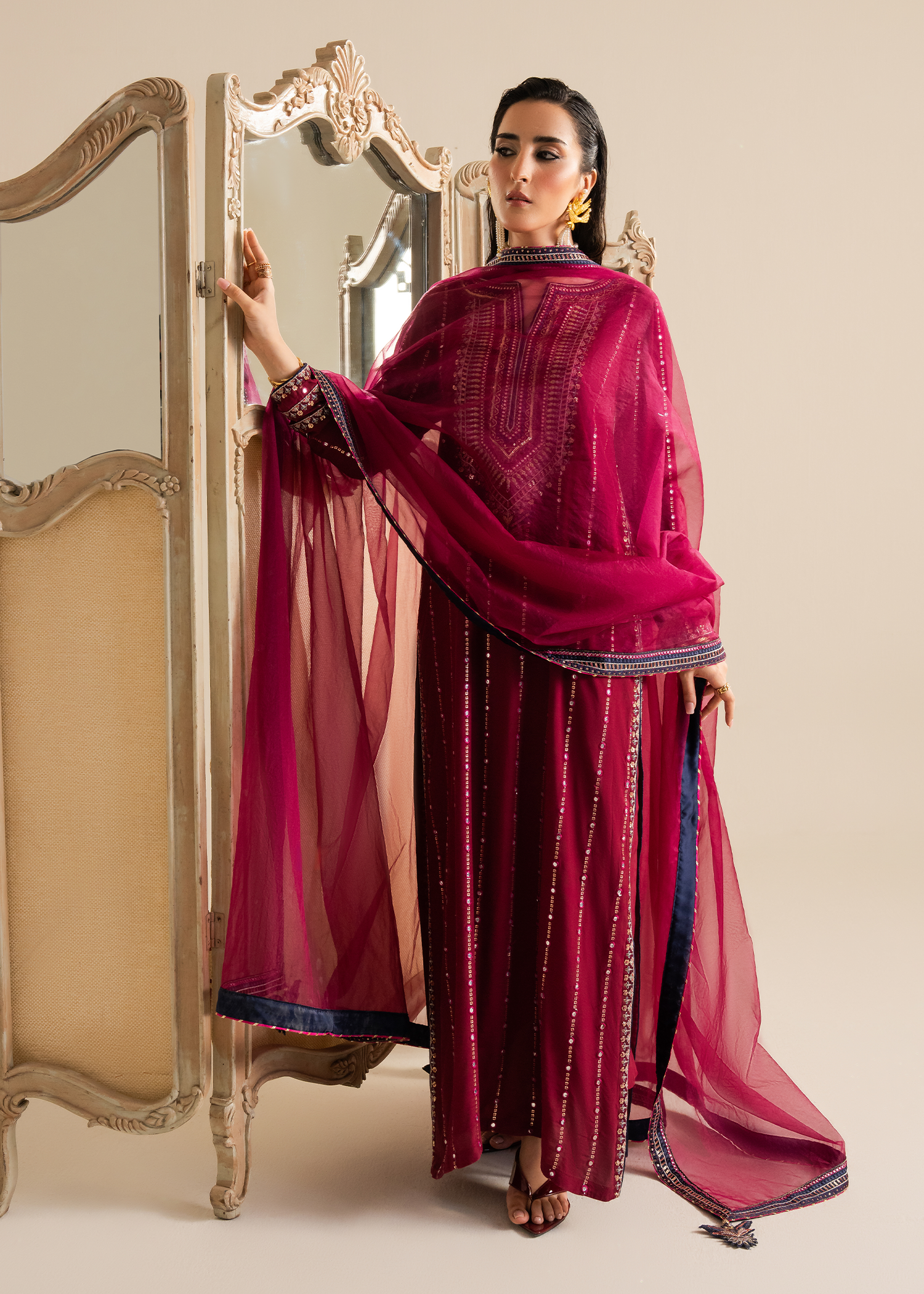 A stunning organza dupatta, adorned with thread embroidery and finished with a bold navy blue contrast border to complete your look.
