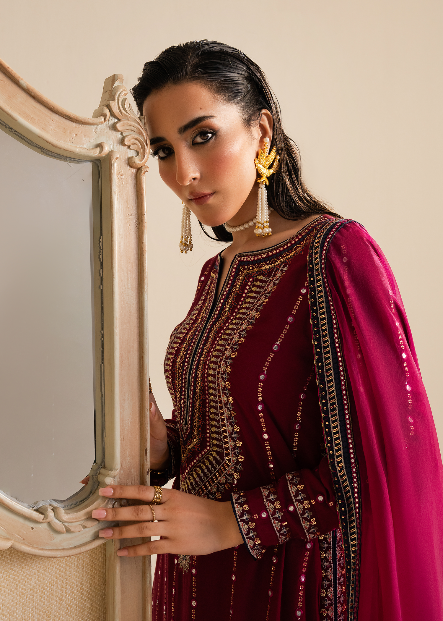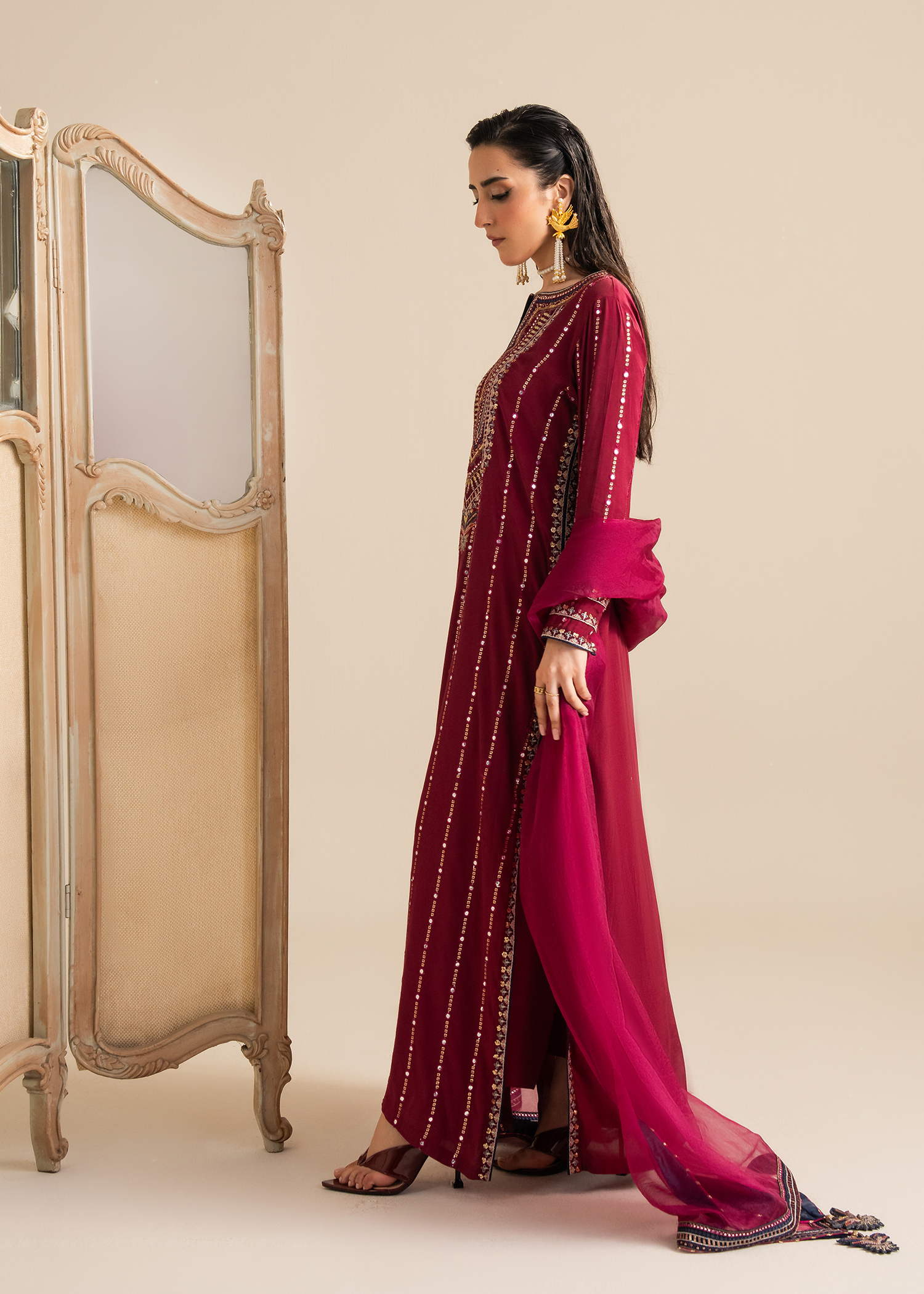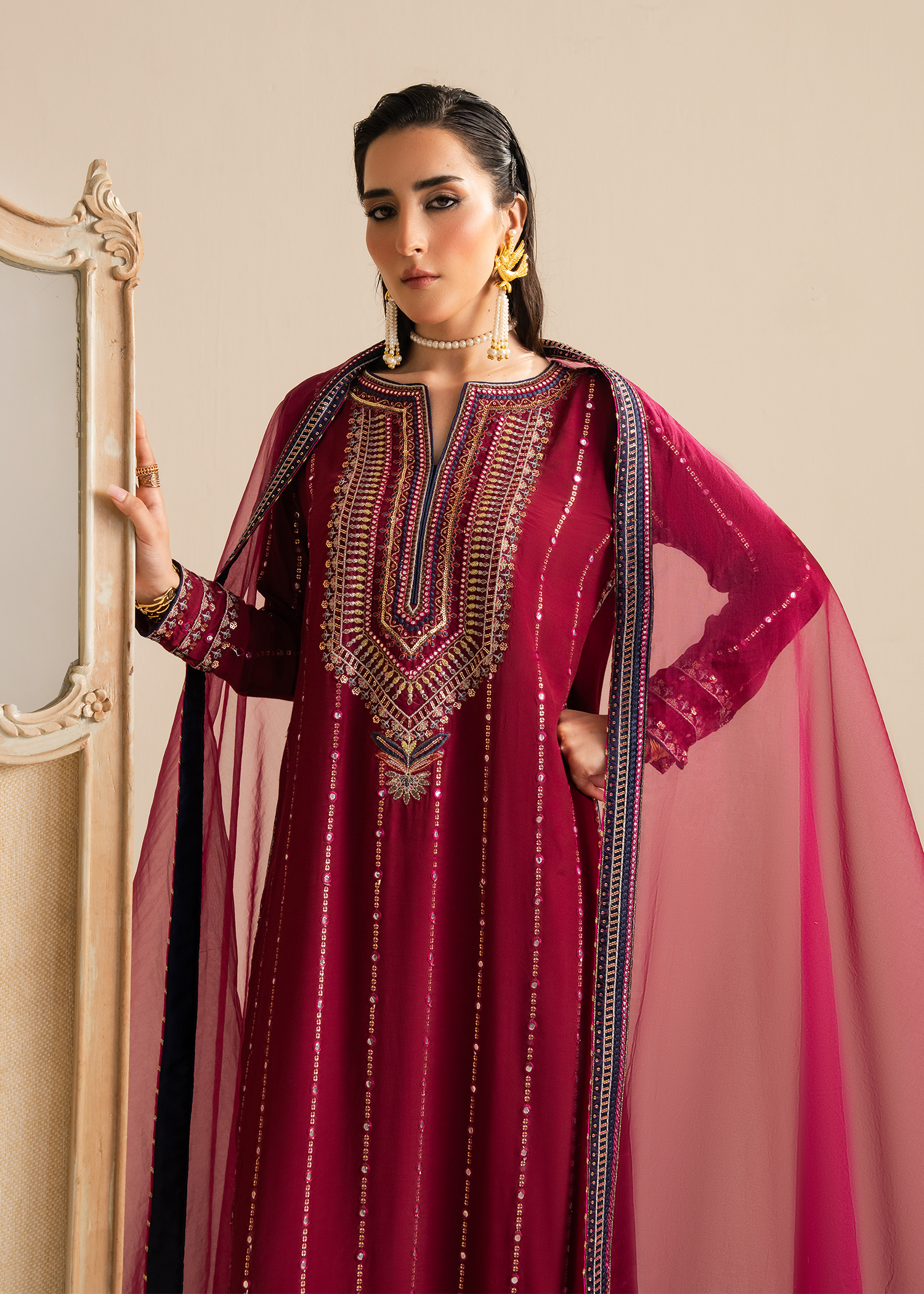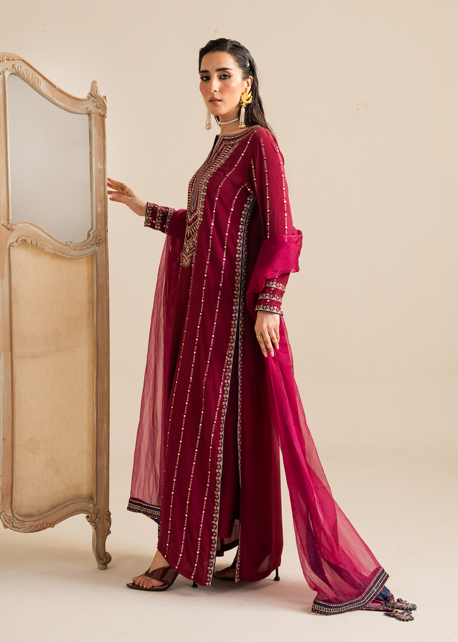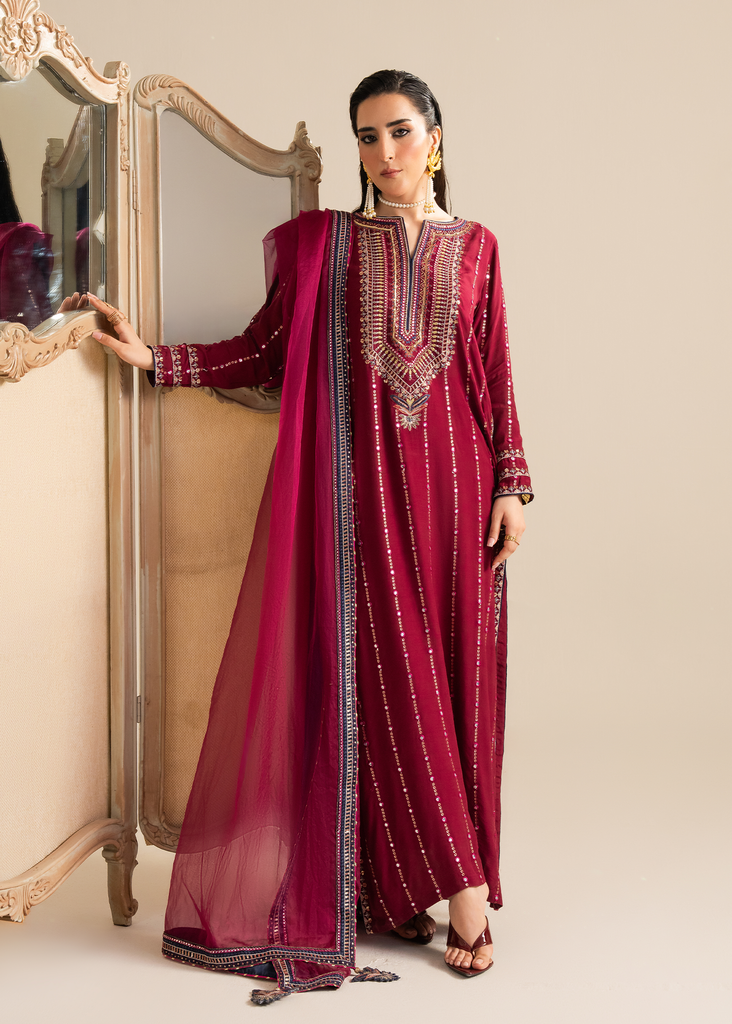 This elegant long muslin shirt features a sleek straight cutline with fitted sleeves, elevated by an intricately embroidered neckline adorned with panni, sequins, tilla, and fine thread work. Delicate running panni and sequin lines flow across the shirt and sleeves, adding a subtle shimmer. Paired with a plain muslin straight trouser, this ensemble is a statement in refined sophistication.