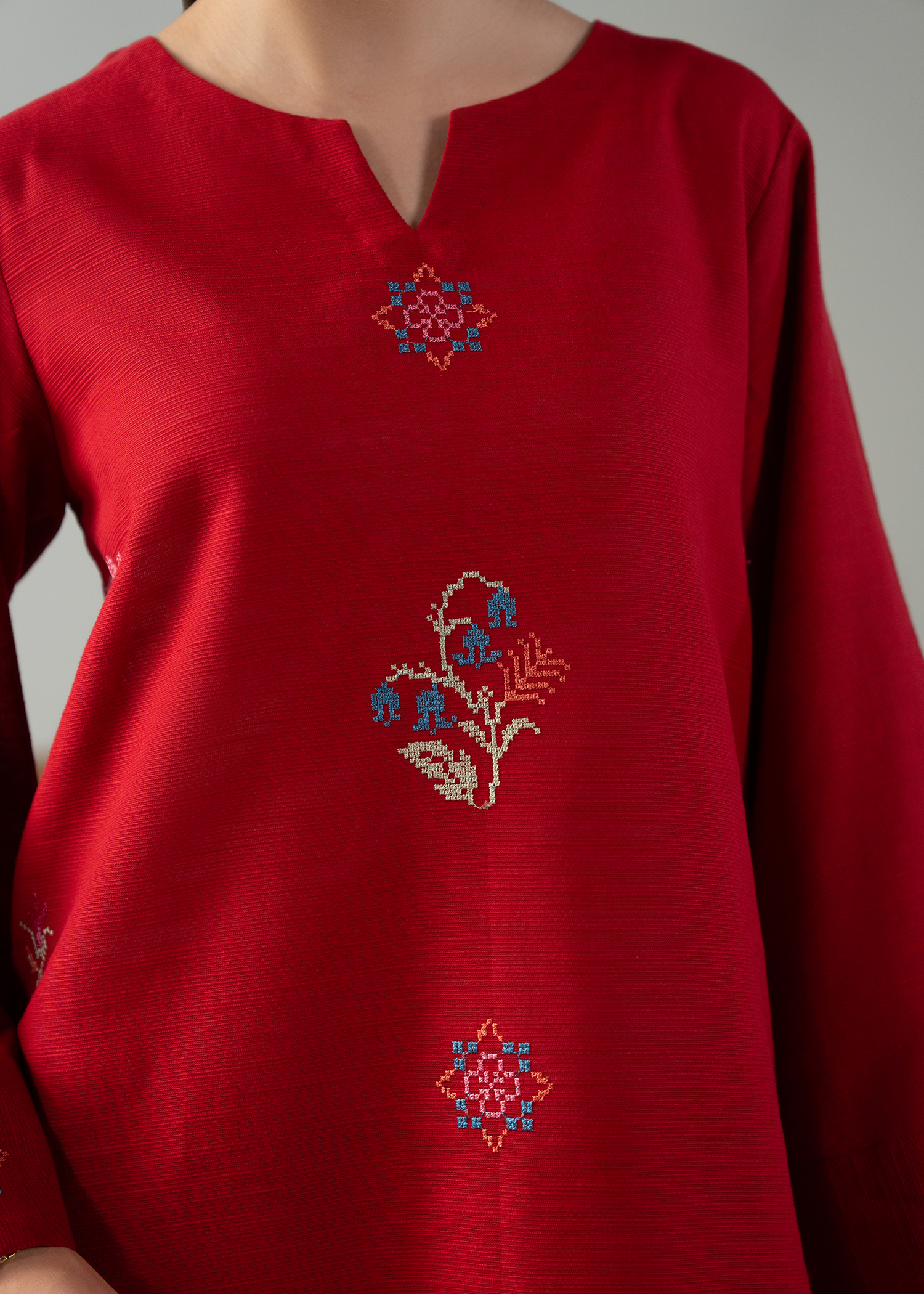 This radiant red khaddar suit showcases exquisite multicolor embroidery in a classic cross-stitch pattern, celebrating timeless craftsmanship. The short shirt is paired with straight-cut trousers with all-over embroidery, combining style and comfort.