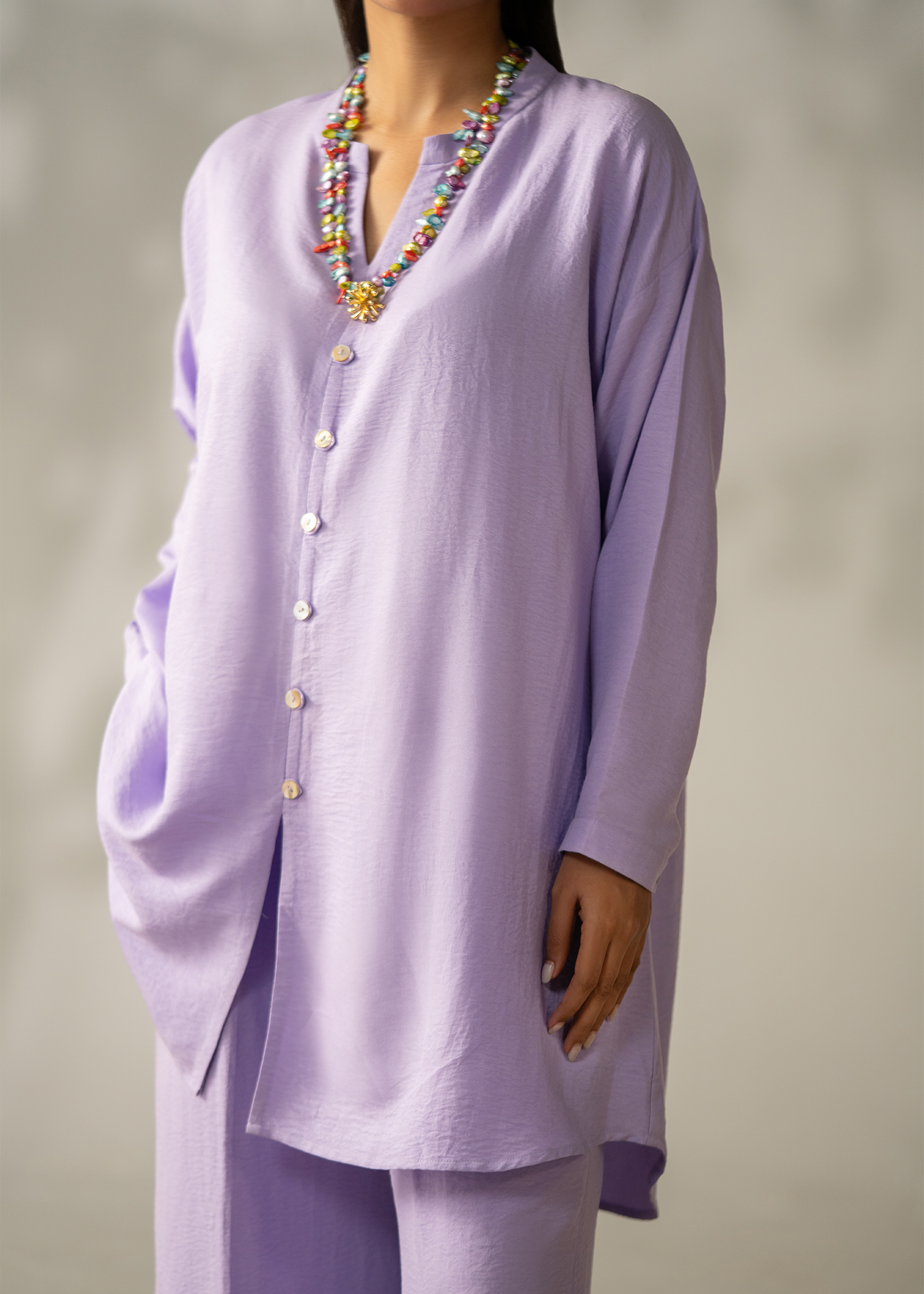 This loose-fit lilac shirt with button detailing in textured crush fabric pairs seamlessly with sleek straight-cut trousers, offering a touch of everyday sophistication to complete your look.