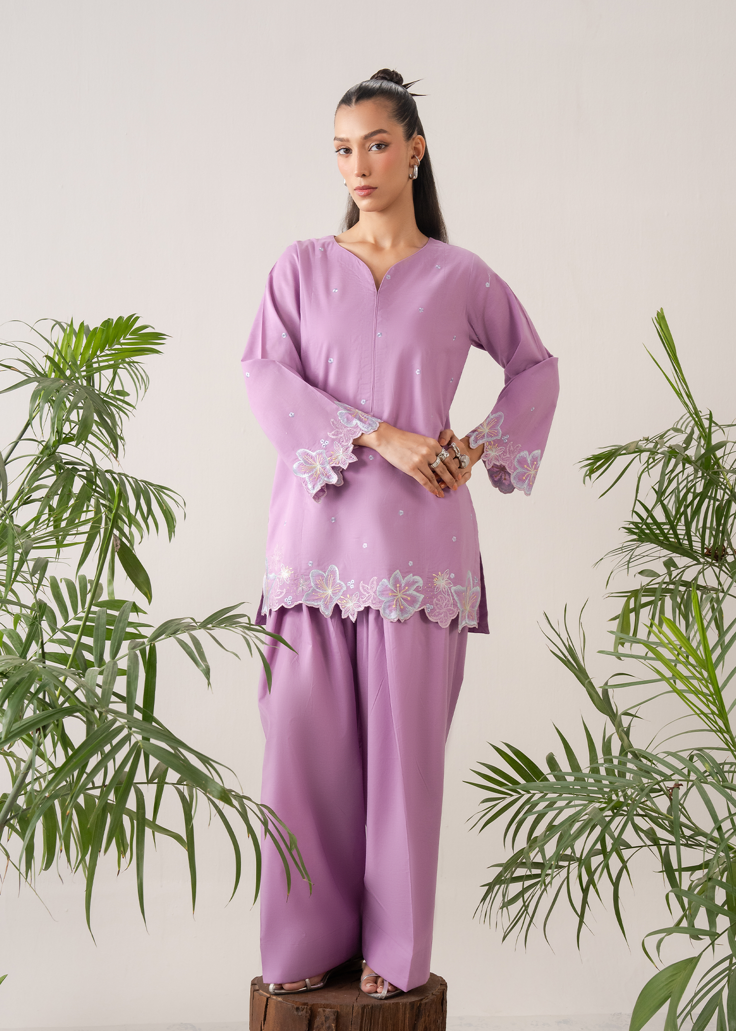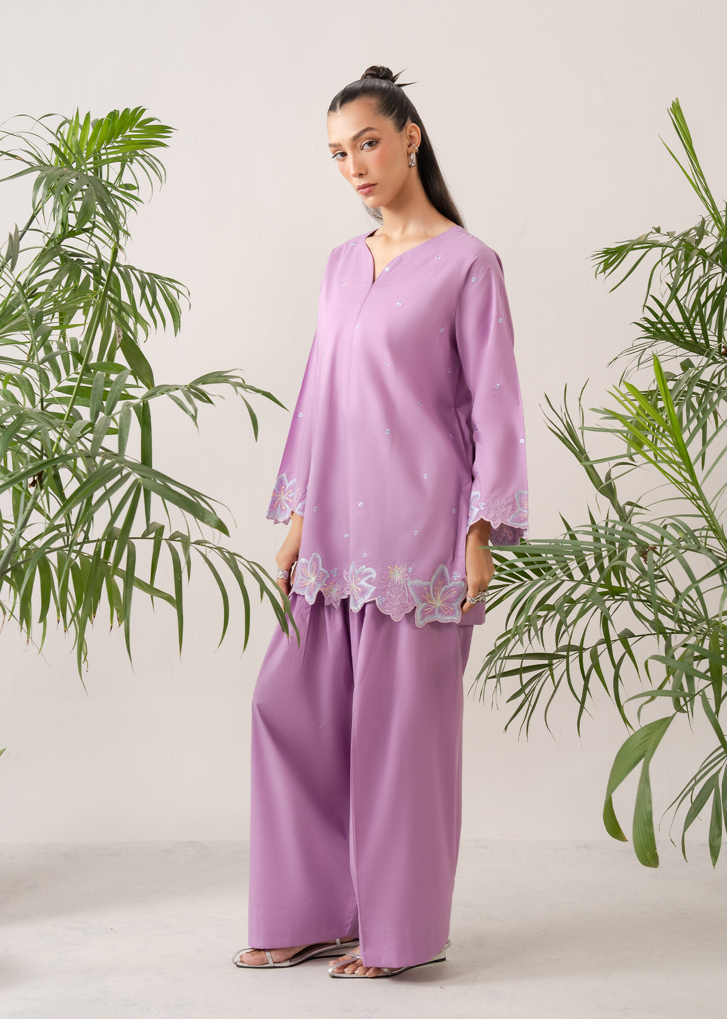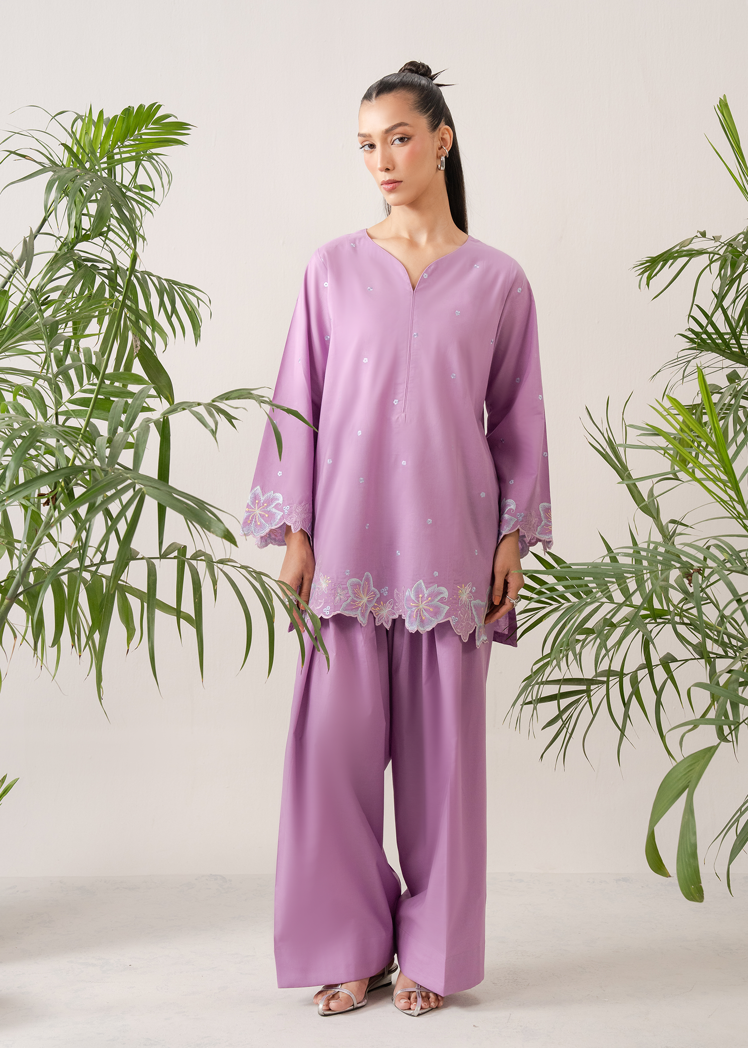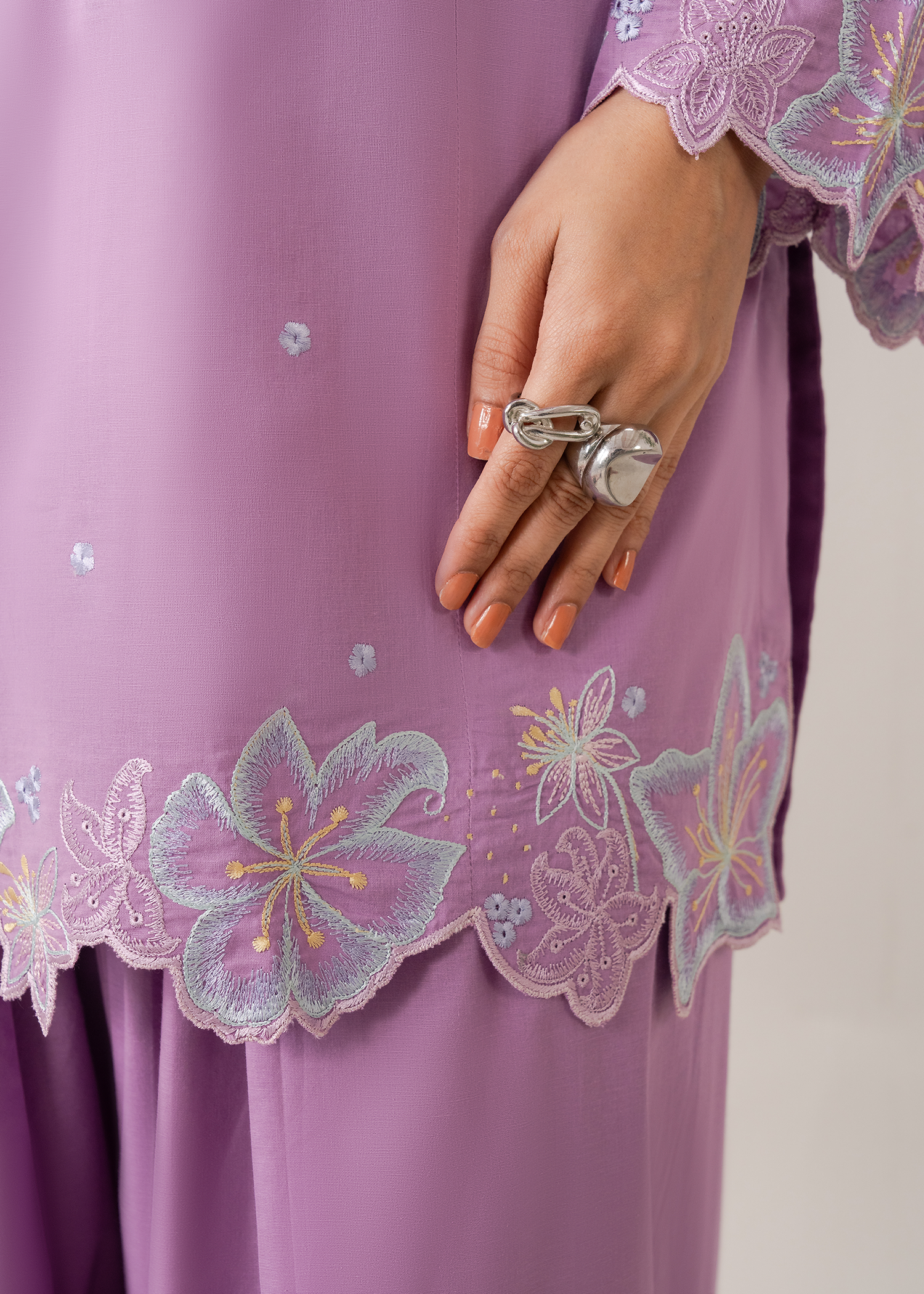 Short shirt featuring colorful embroidered details with cutwork on the sleeve openings and hem, paired with a wide-legged shalwar for a bold and elegant silhouette.