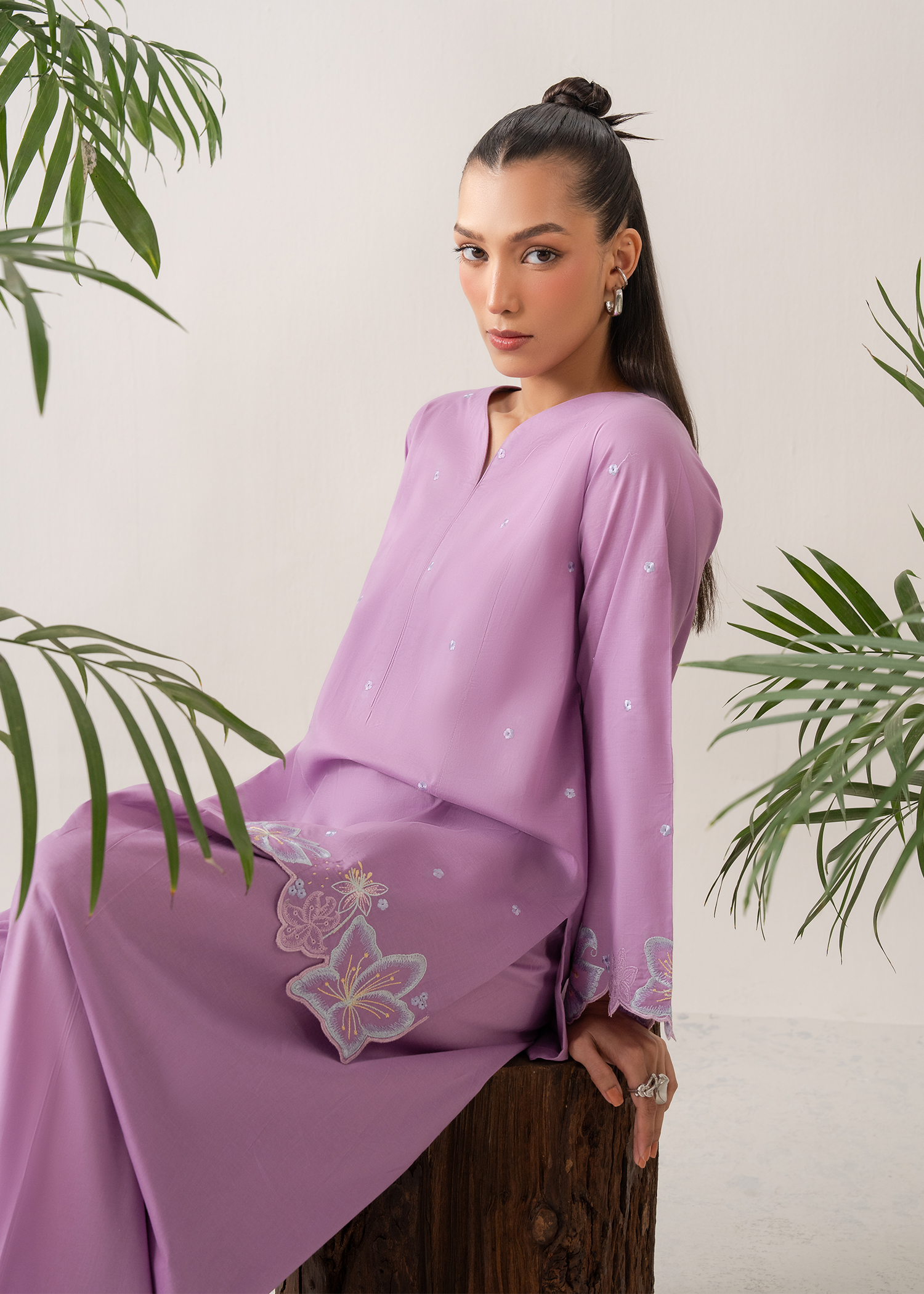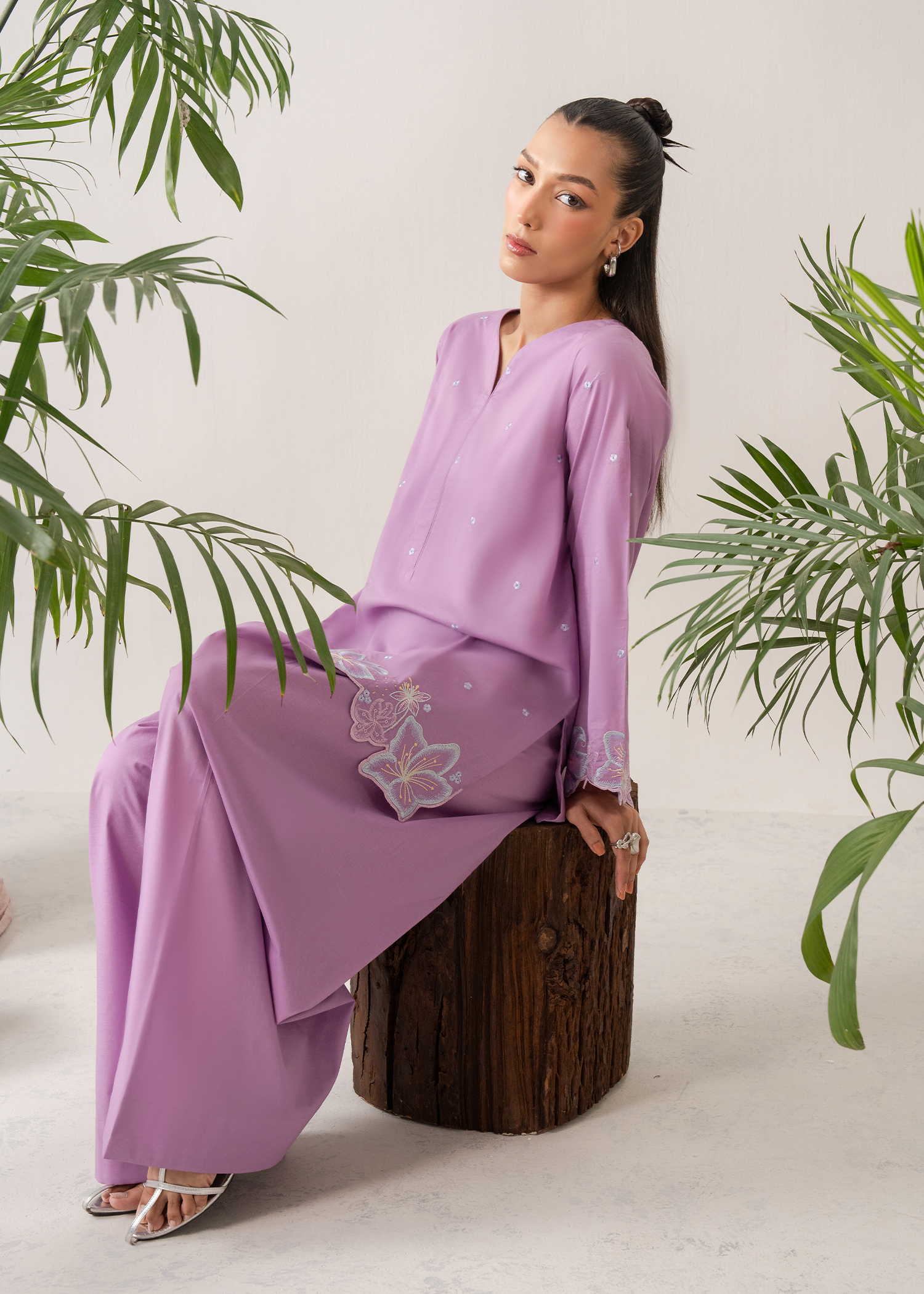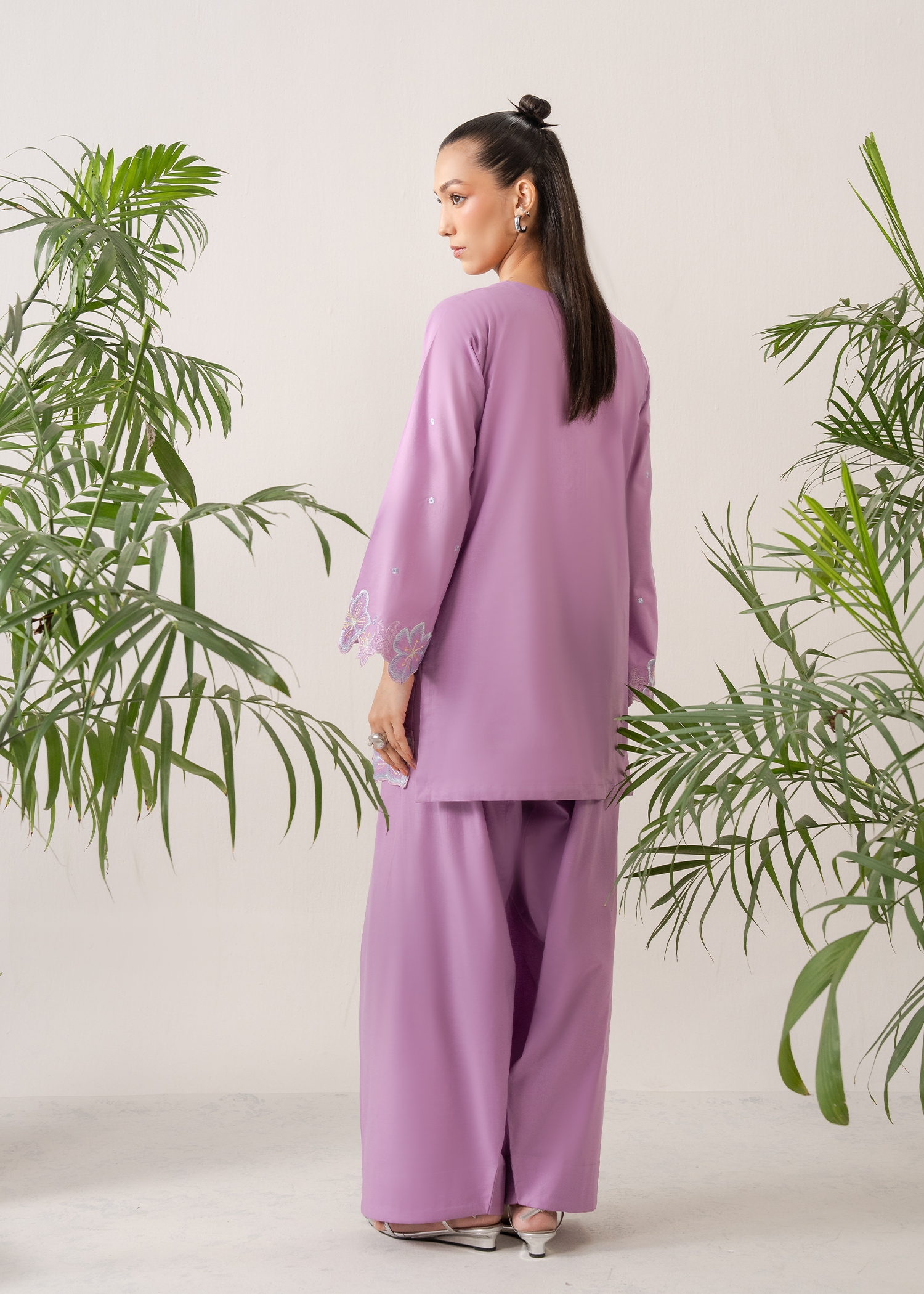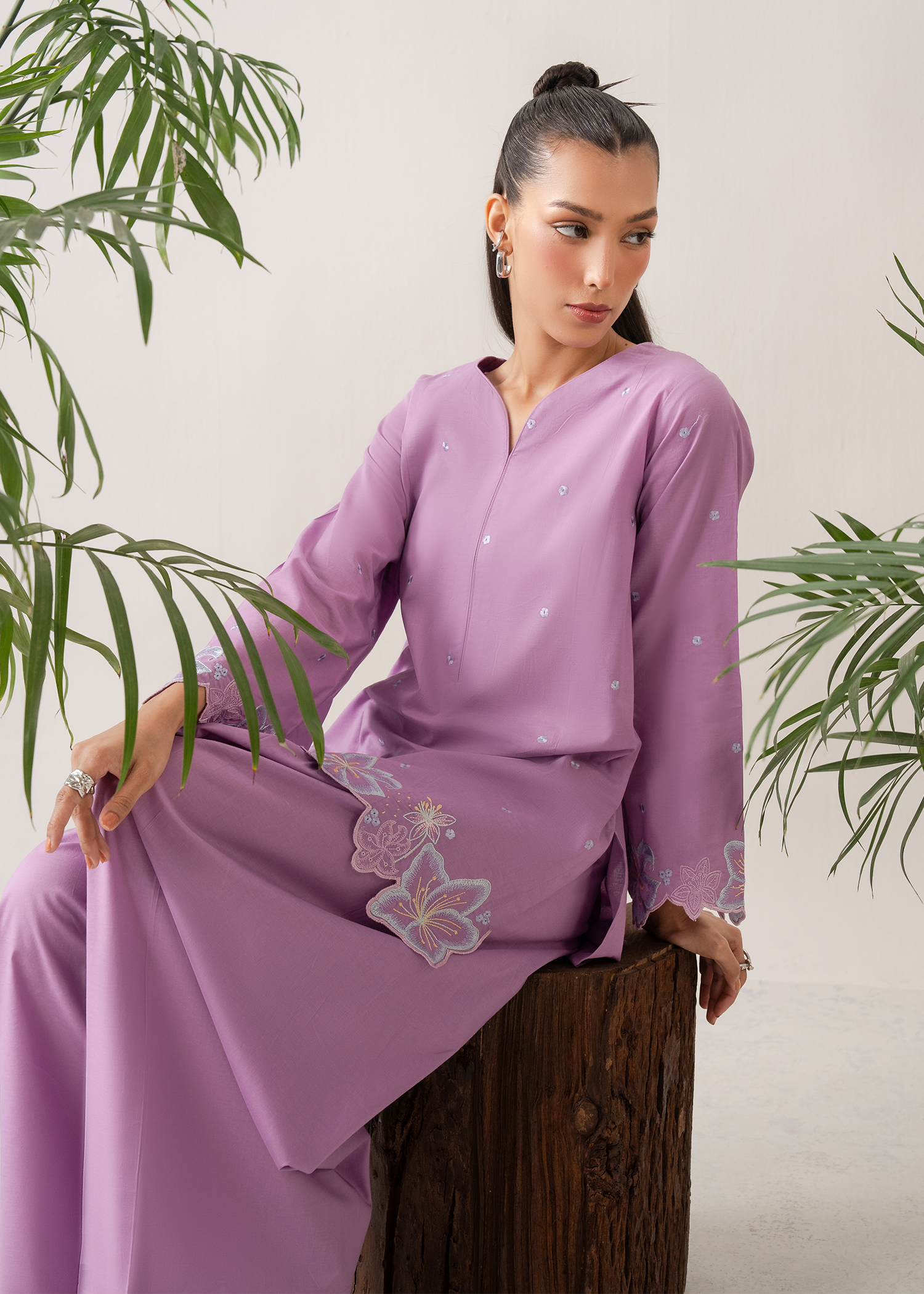 Short shirt featuring colorful embroidered details with cutwork on the sleeve openings and hem, paired with a wide-legged shalwar for a bold and elegant silhouette.
