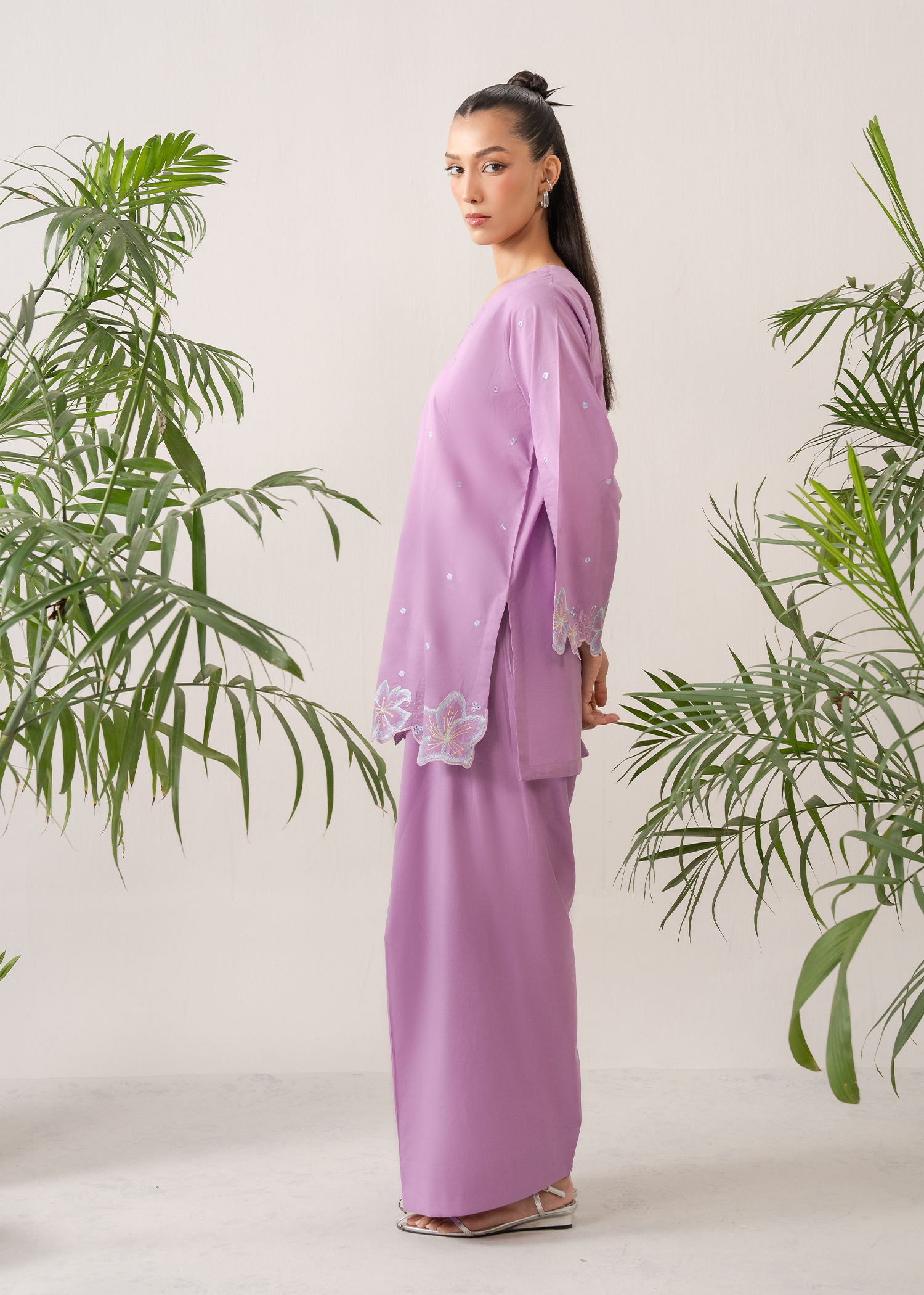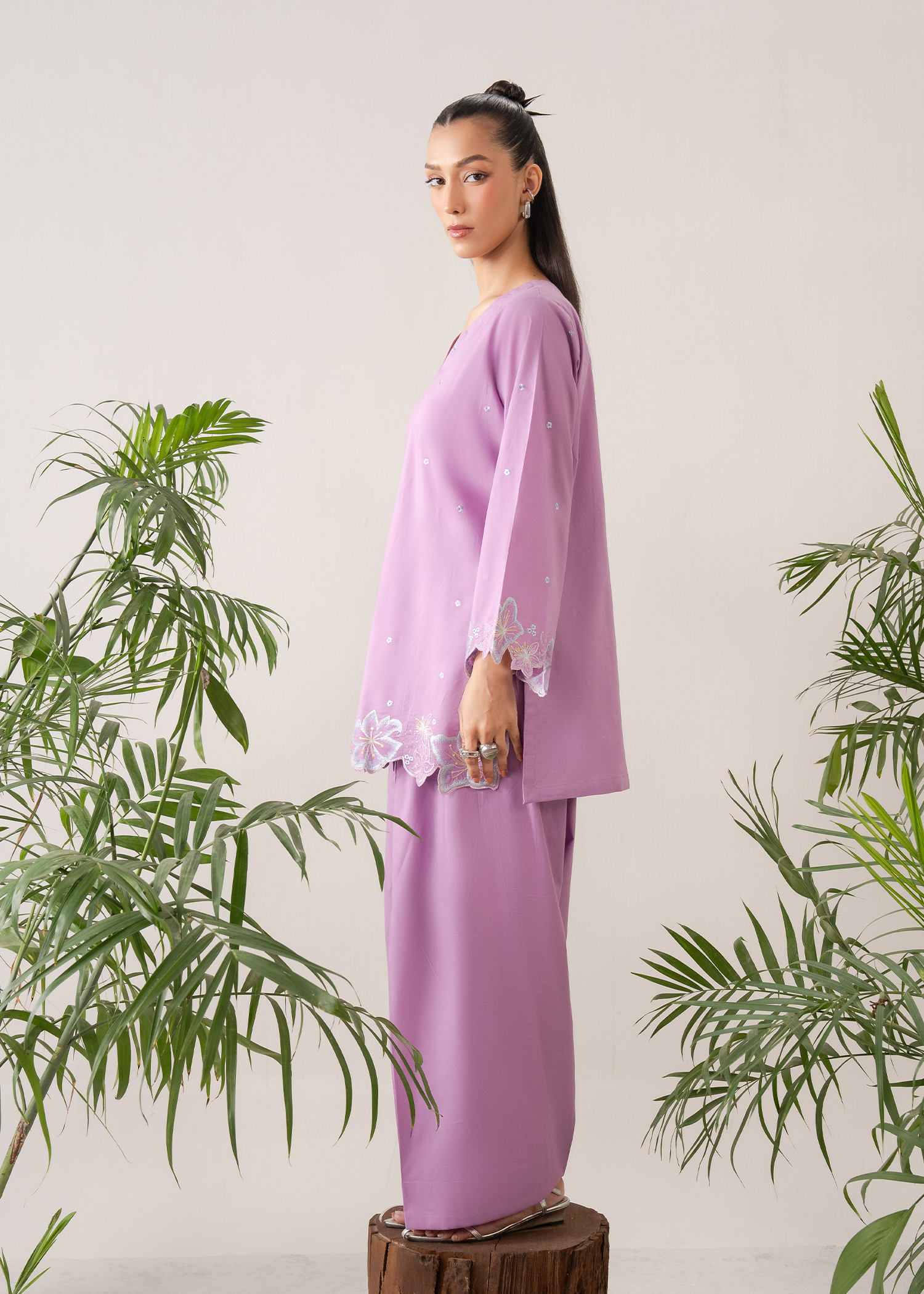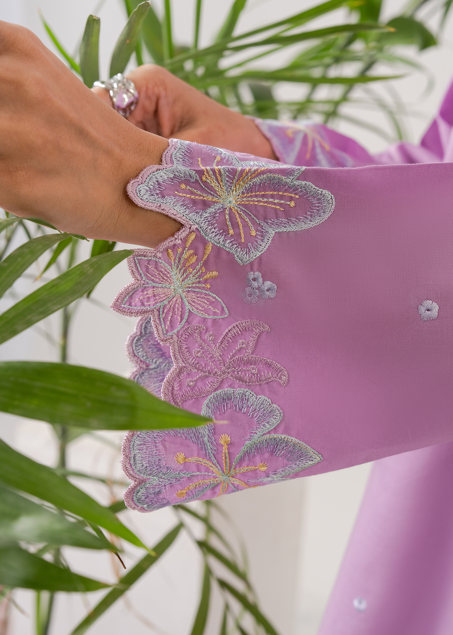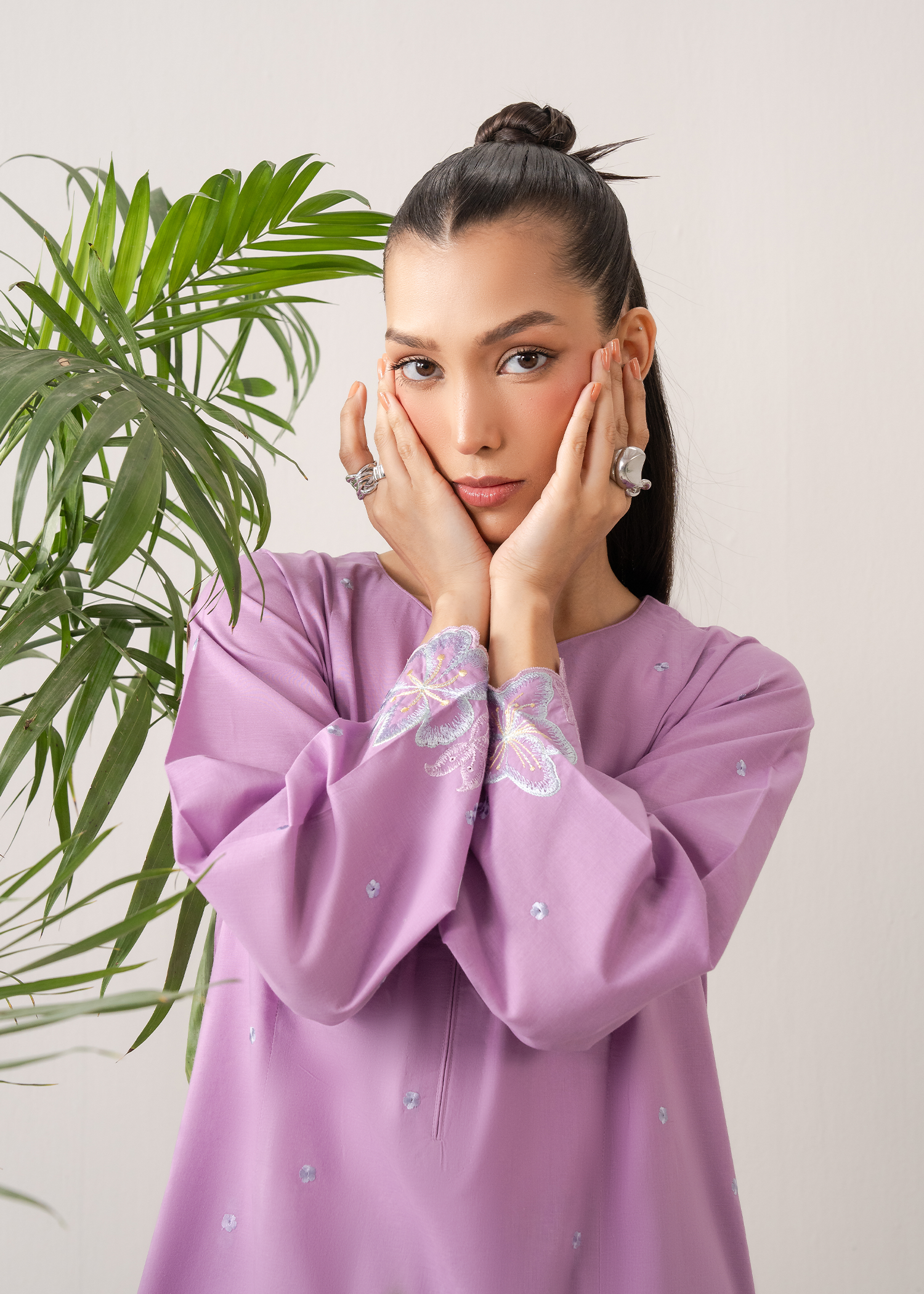 Short shirt featuring colorful embroidered details with cutwork on the sleeve openings and hem, paired with a wide-legged shalwar for a bold and elegant silhouette.