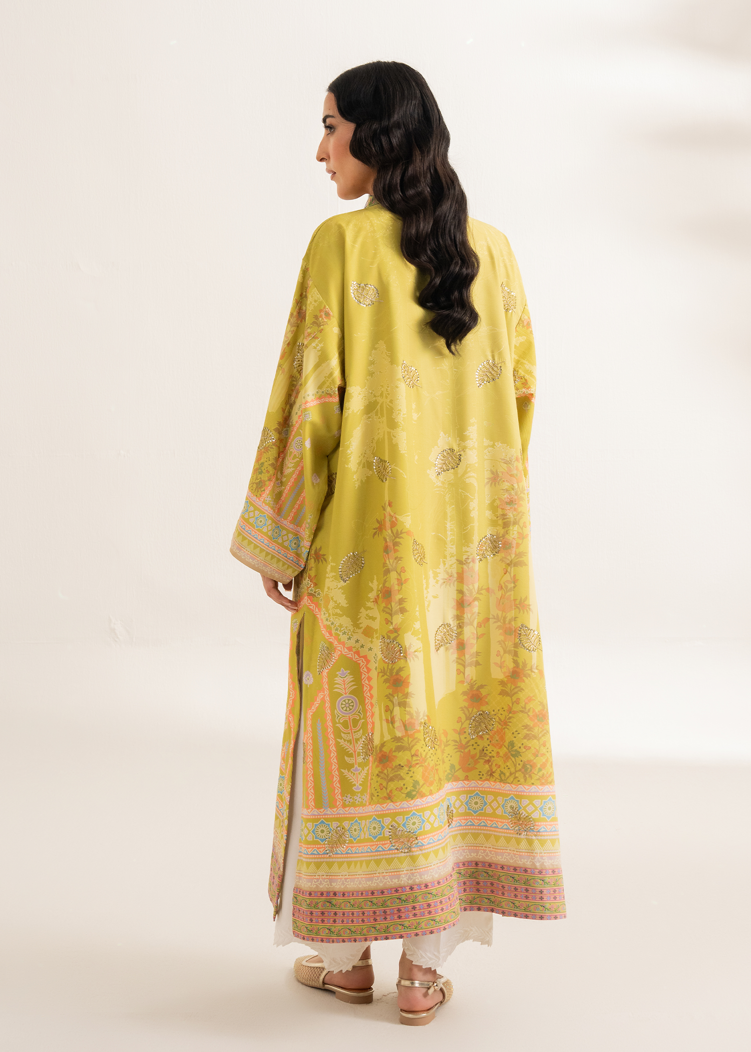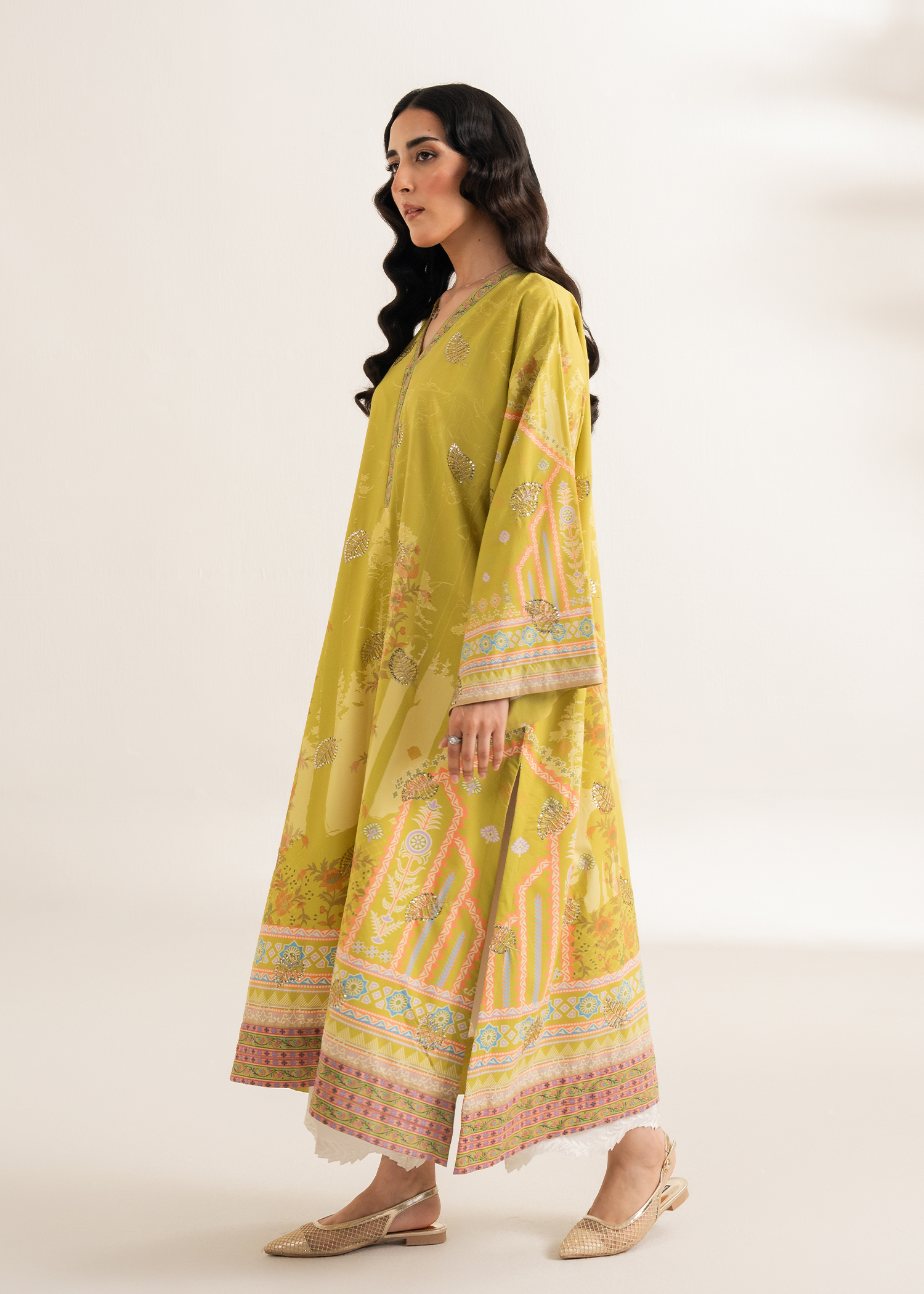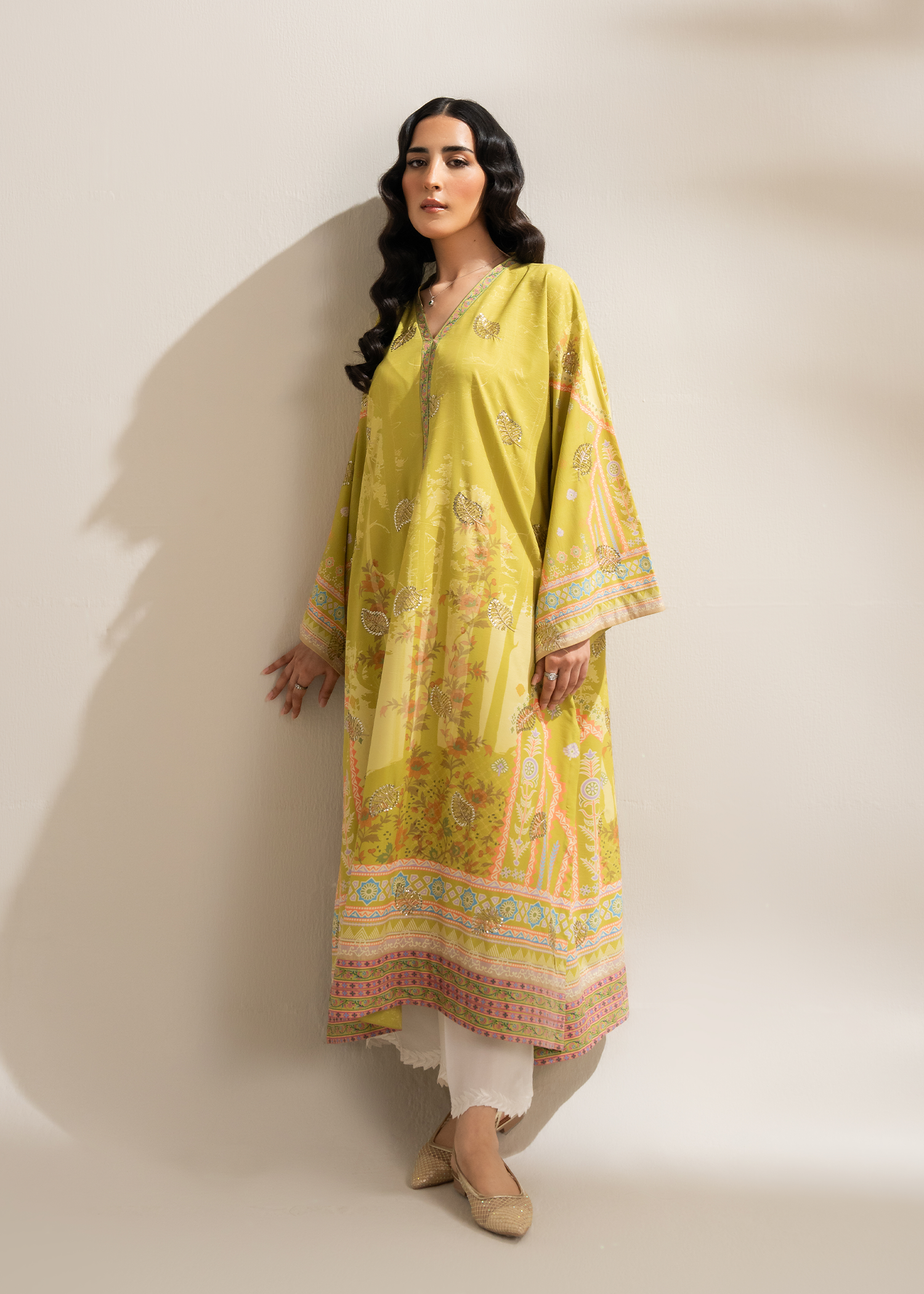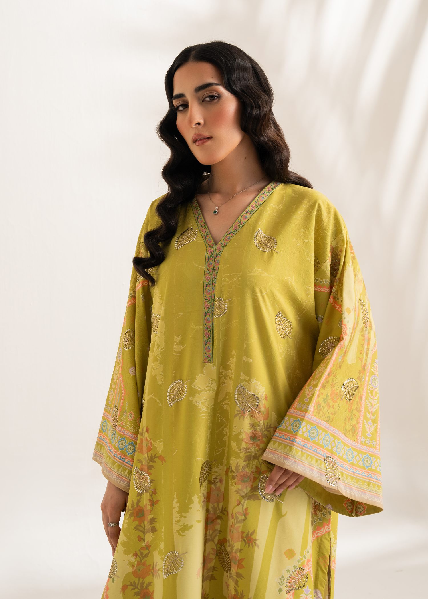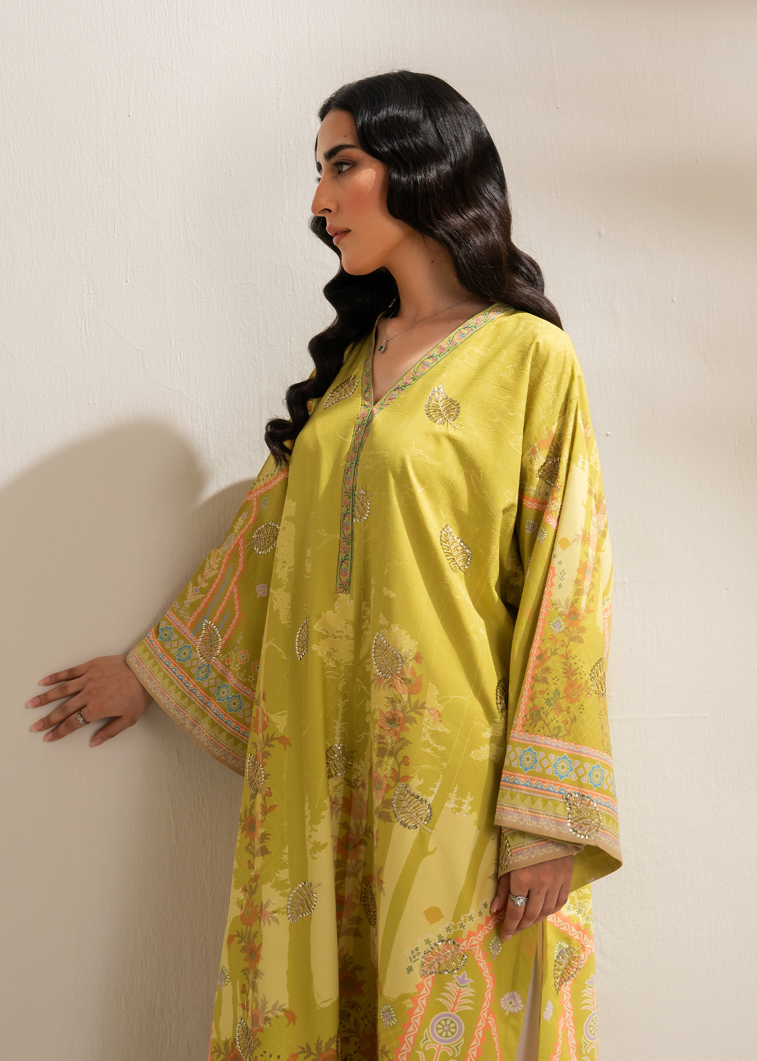 Fresh lime printed crepe A-line kaftan style shirt featuring delicate embroidered spray with sequin accents. Designed with an overlapping neckline in coordinating printed fabric and full-length sleeves, finished with a vibrant printed border on the hem and side openings for a fresh, contemporary look.