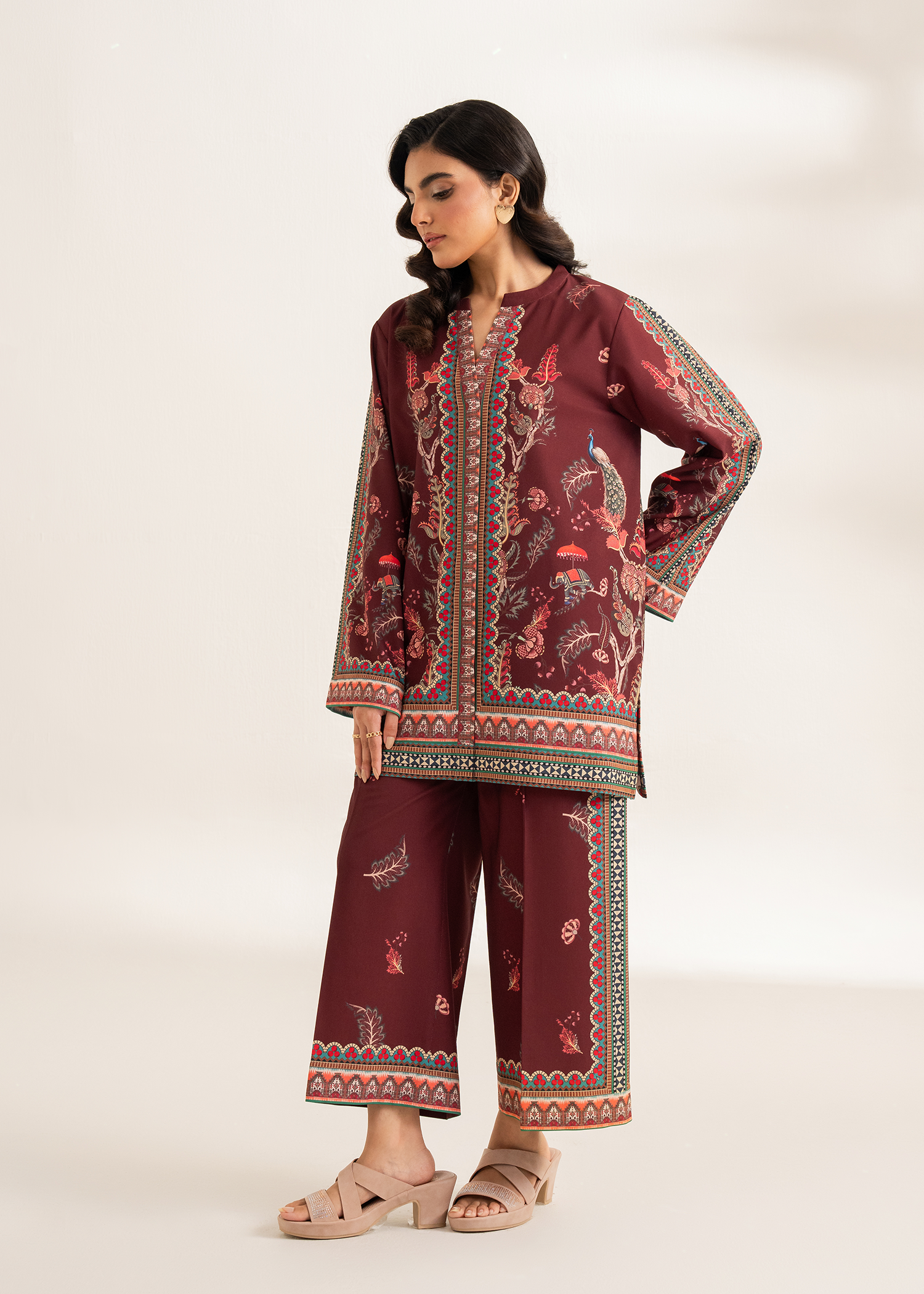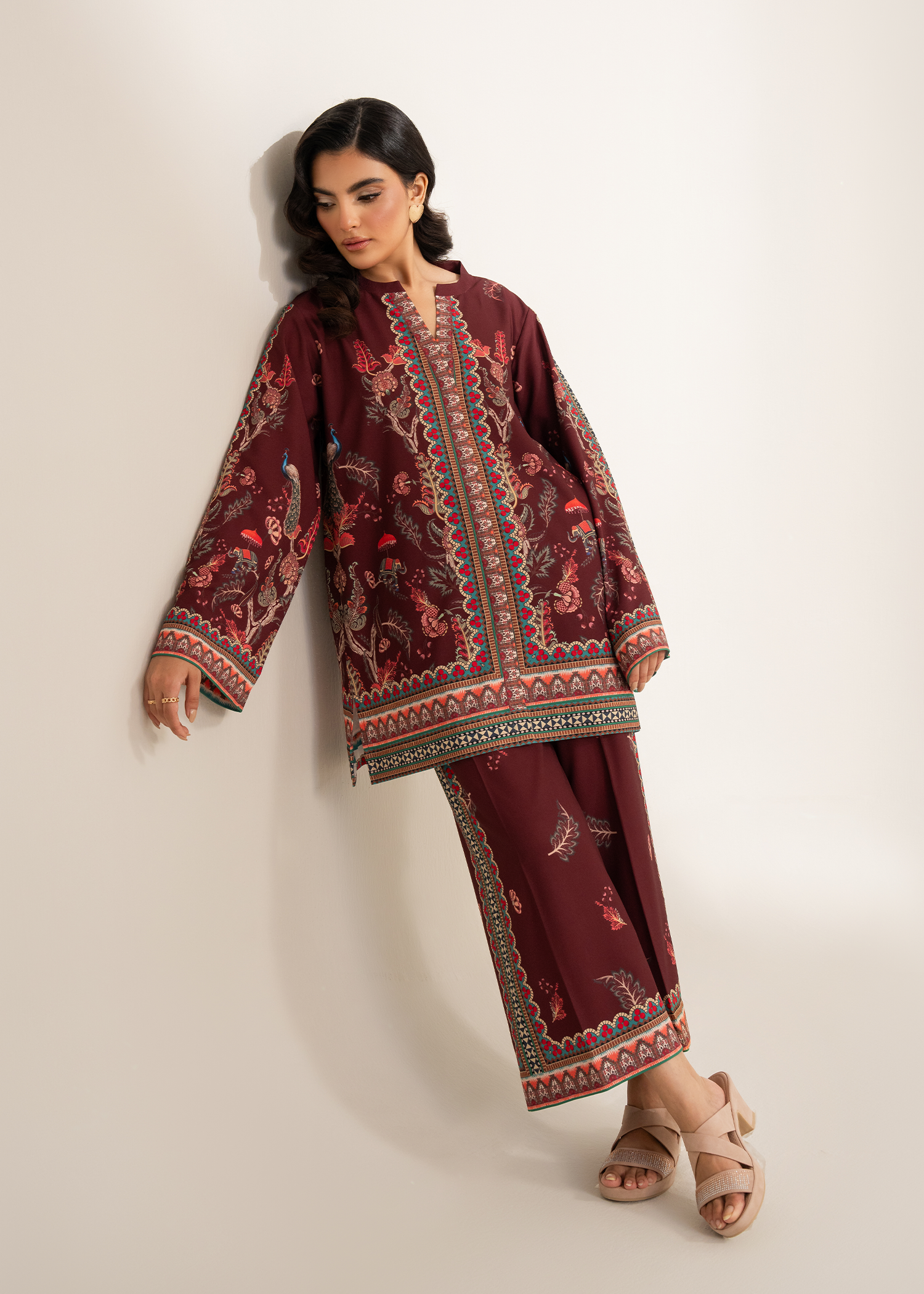 Elevate your everyday look with this elegant maroon ensemble. Featuring a graceful straight-cut shirt and matching trousers, this outfit is adorned with intricate ethnic-inspired prints in warm, earthy tones. The relaxed silhouette ensures comfort, while the timeless design makes it a perfect choice for both casual gatherings and festive occasions. Expertly crafted, this suit blends tradition with modern sophistication.
