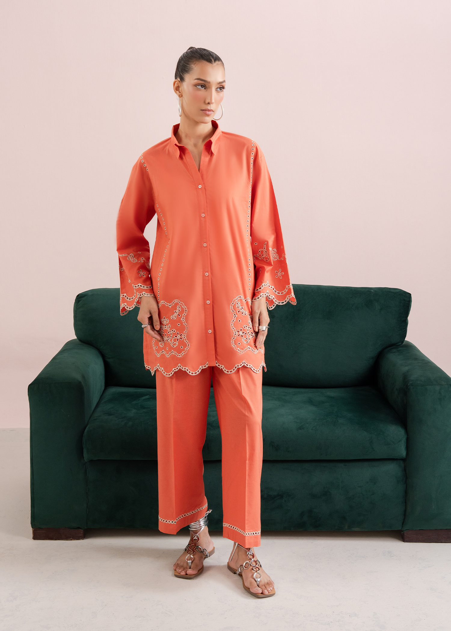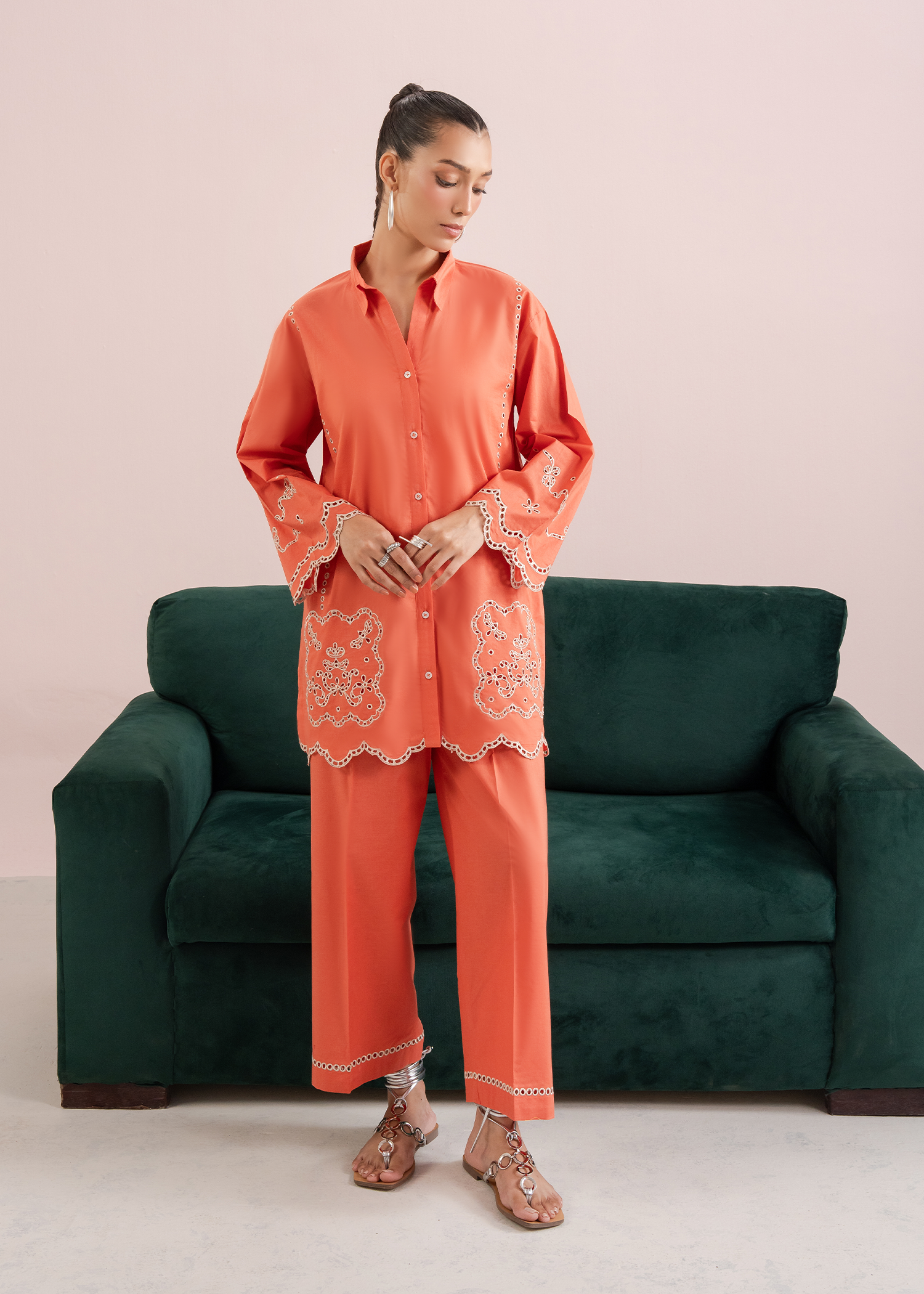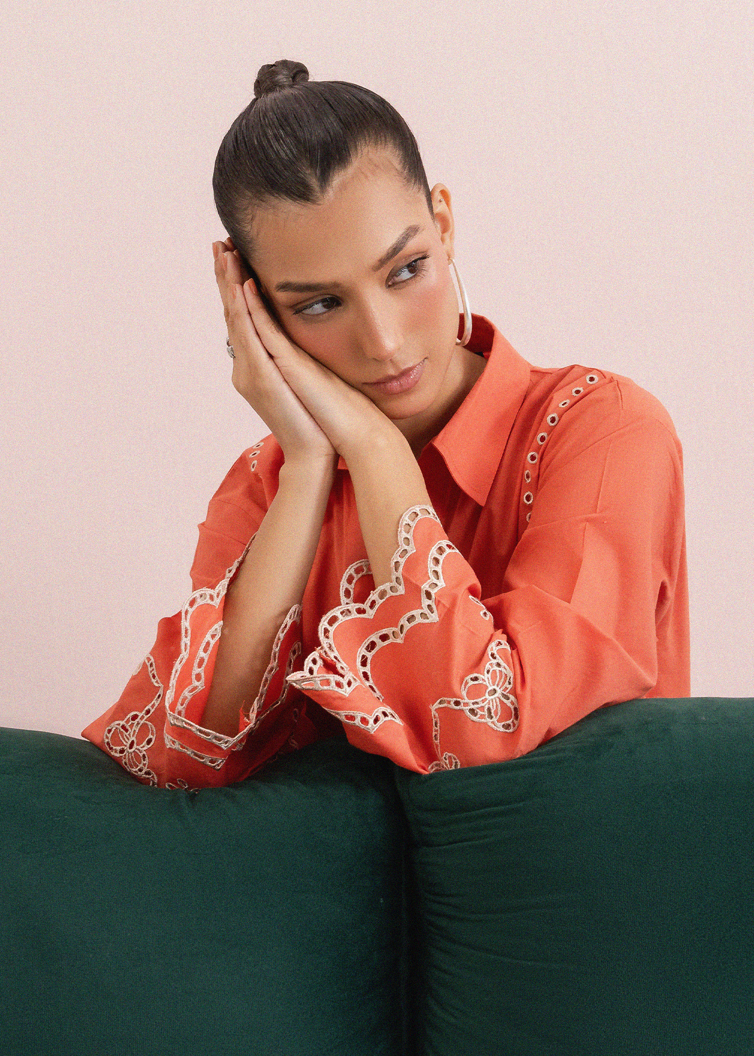 Button up shirt with a collar, detailed with eyelet embroidery and full length sleeves featuring matching embroidered accents. Designed with side slits and a scalloped hem for added elegance. Paired with wide-legged trousers finished with eyelet embroidery along the openings for a coordinated, refined look.