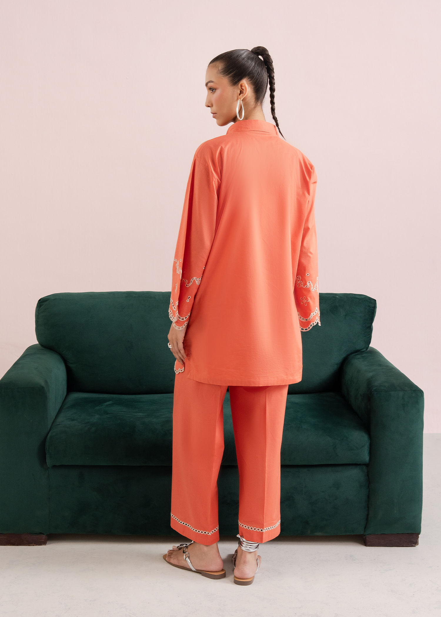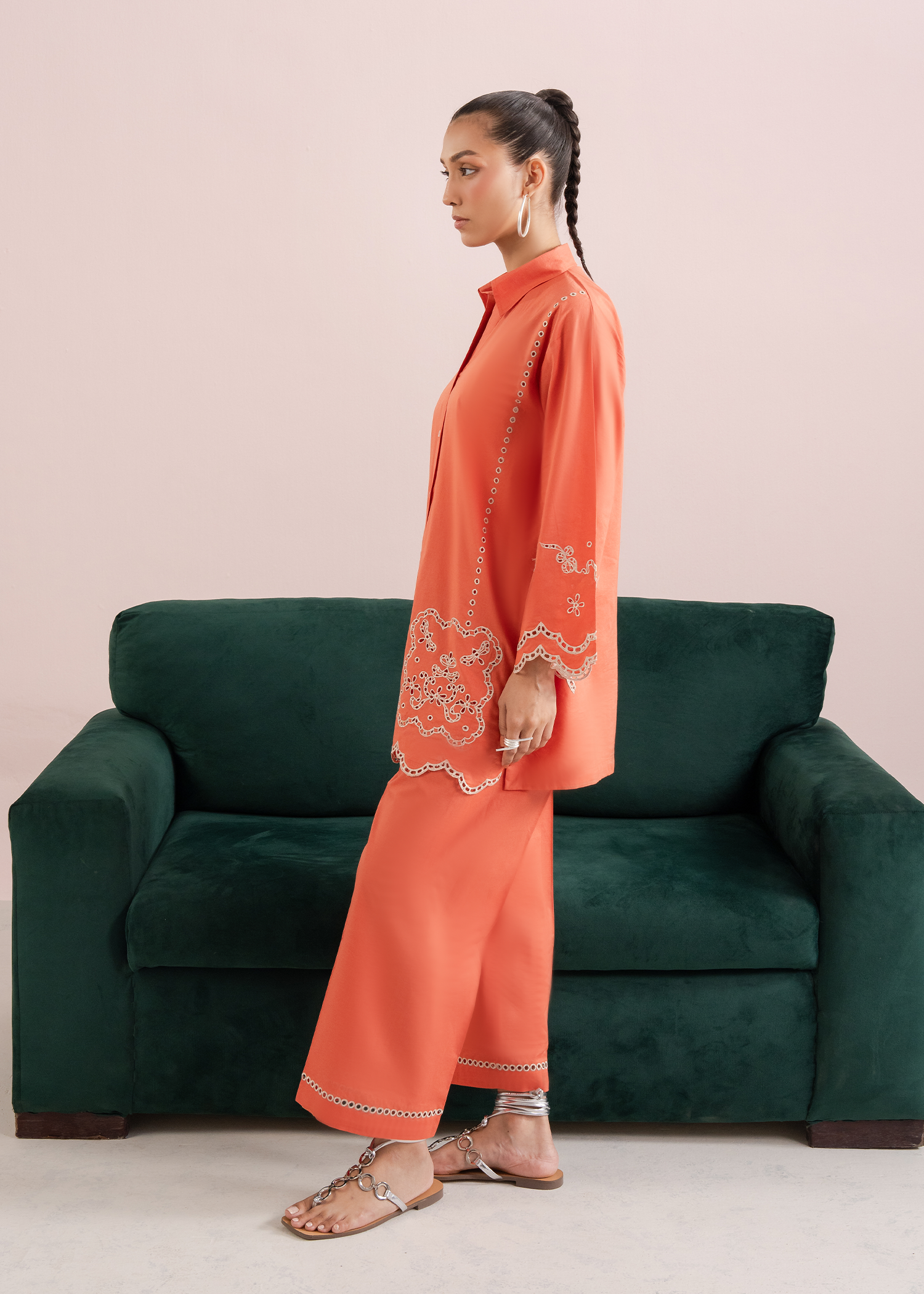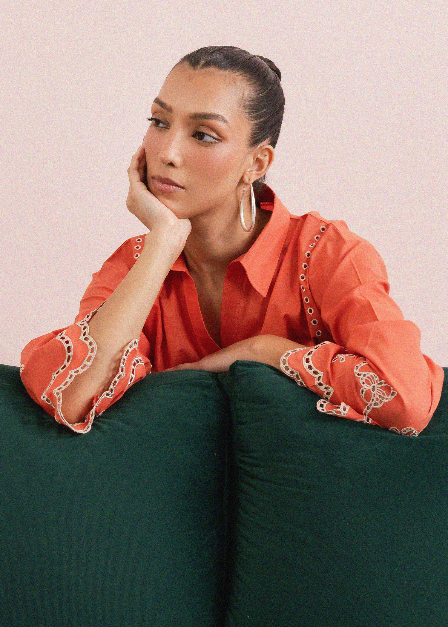 Button up shirt with a collar, detailed with eyelet embroidery and full length sleeves featuring matching embroidered accents. Designed with side slits and a scalloped hem for added elegance. Paired with wide-legged trousers finished with eyelet embroidery along the openings for a coordinated, refined look.