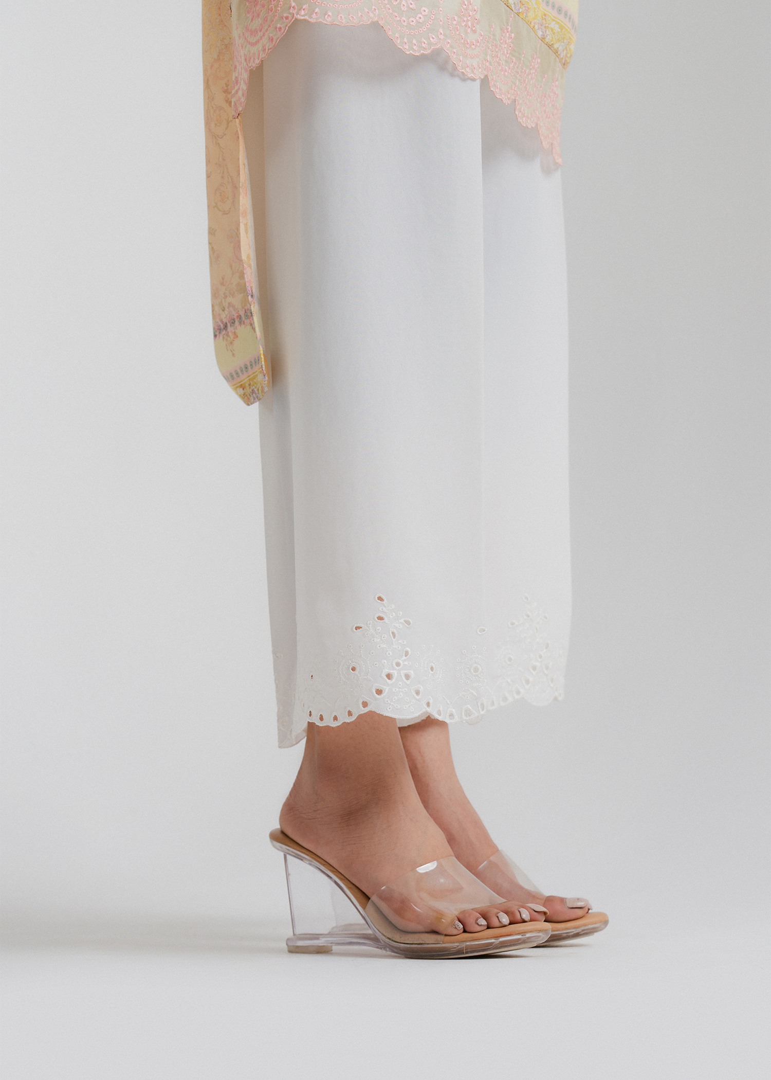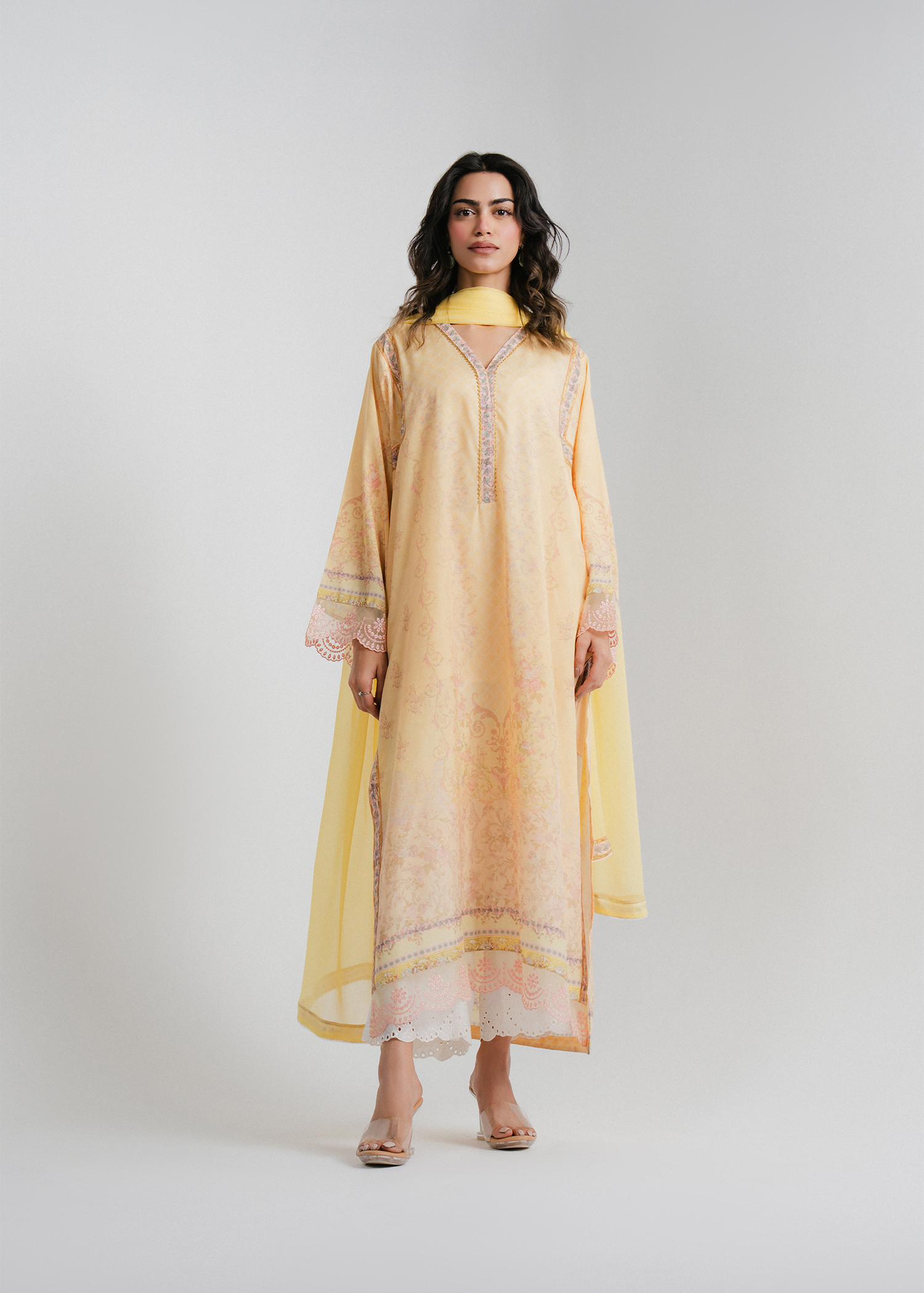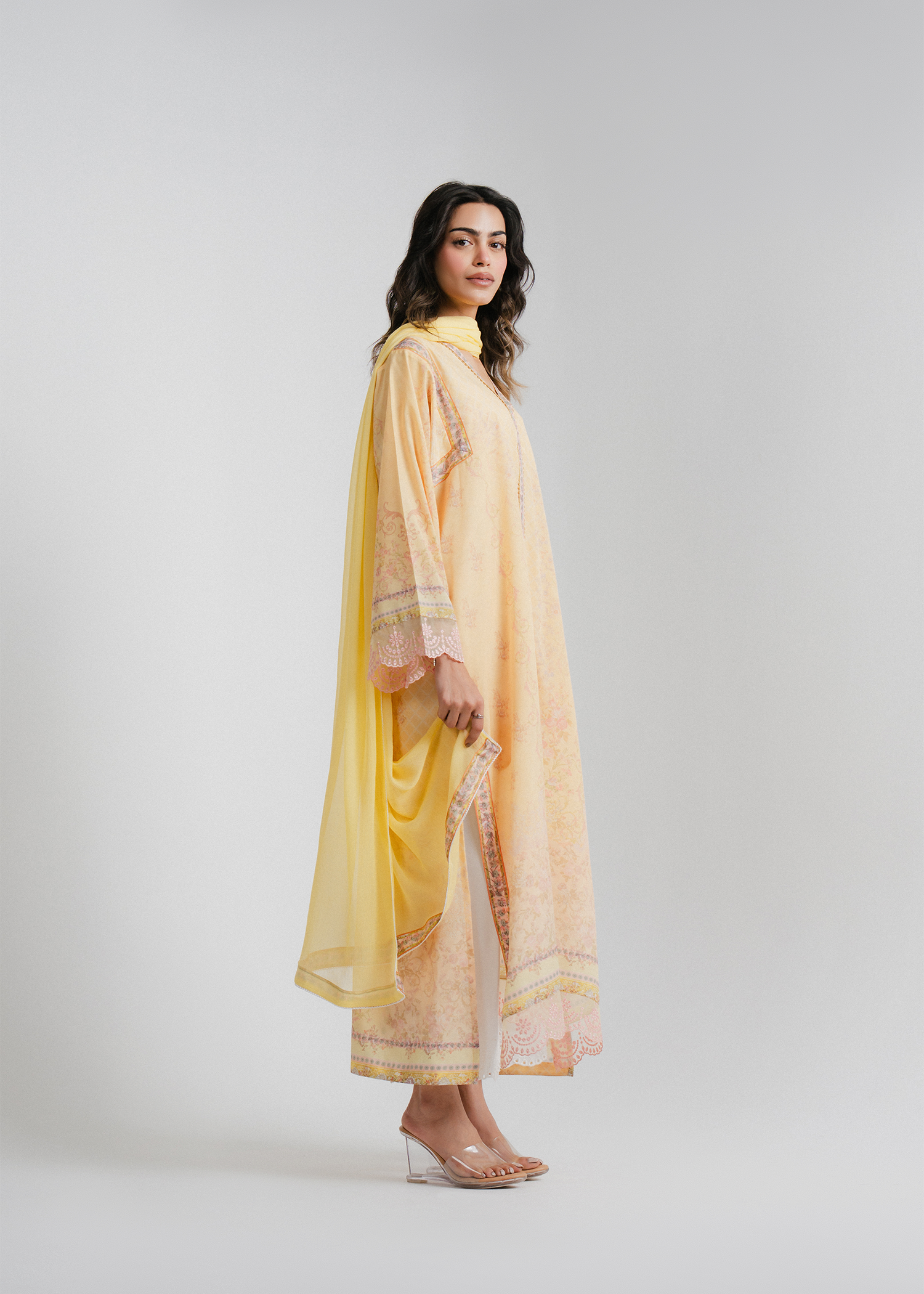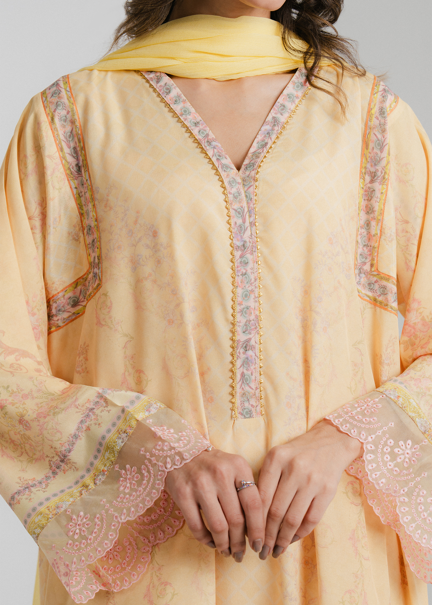 2-piece pastel lime floral printed outfit featuring gota lace on the neckline and pastel pink embroidered borders on hem and sleeves. Paired with a chiffon dupatta adorned with a printed border and lace edging for a refined finish.