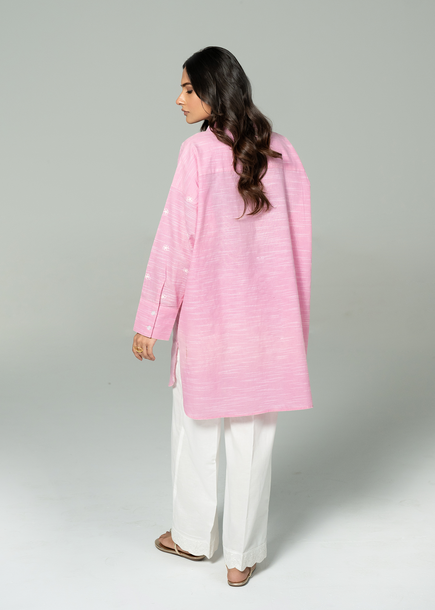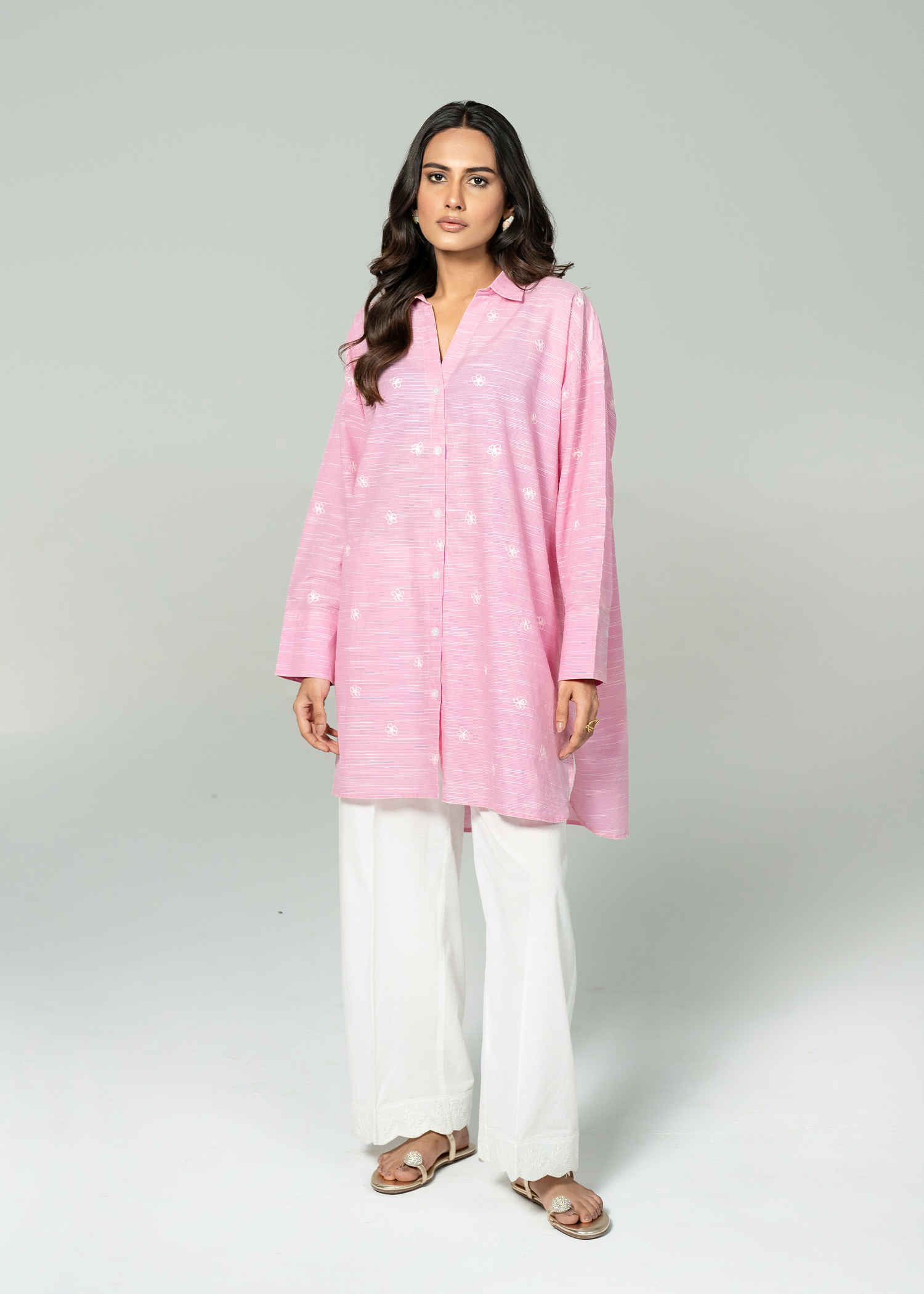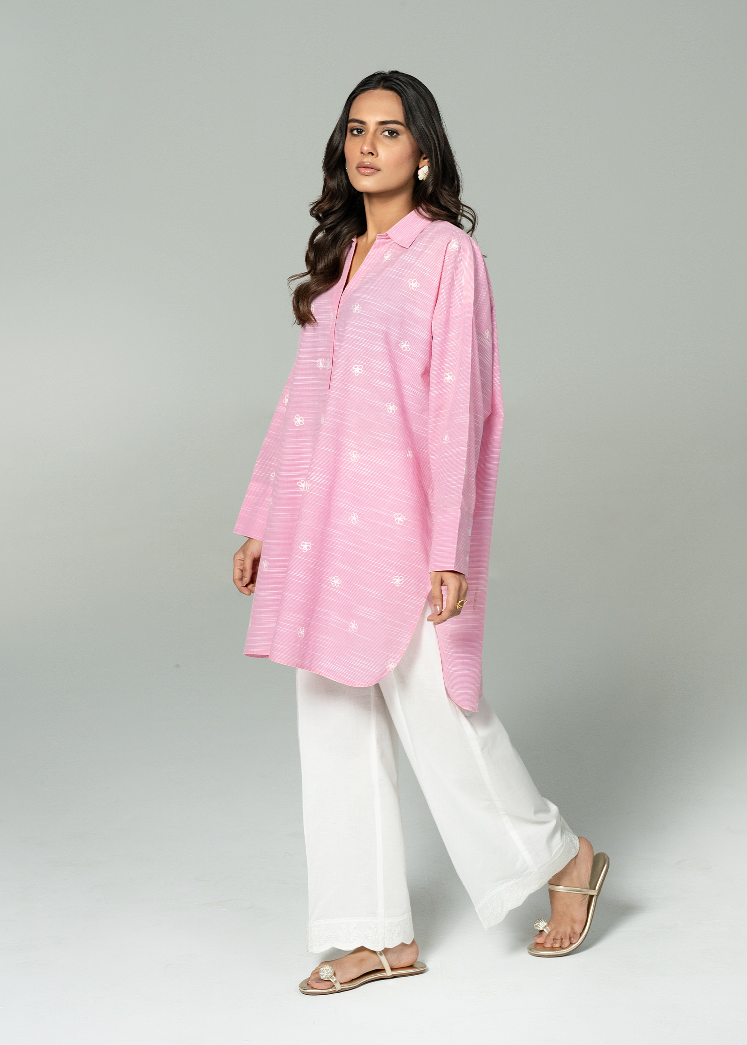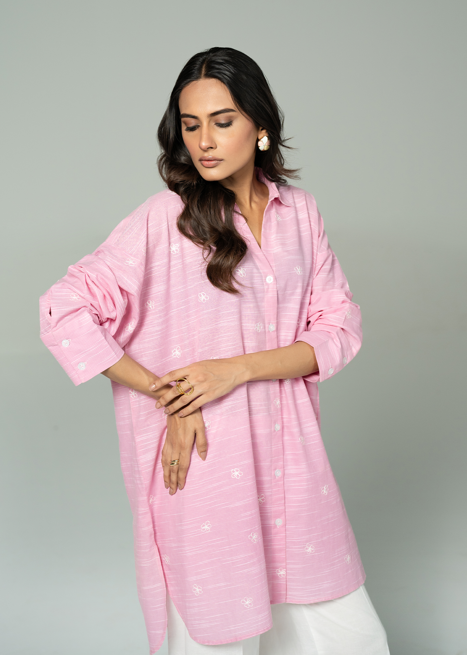 Oversized button down shirt in a vibrant pink colour with white embroidered flowers to add a touch of elegance. Free size can fit any size from small to large.