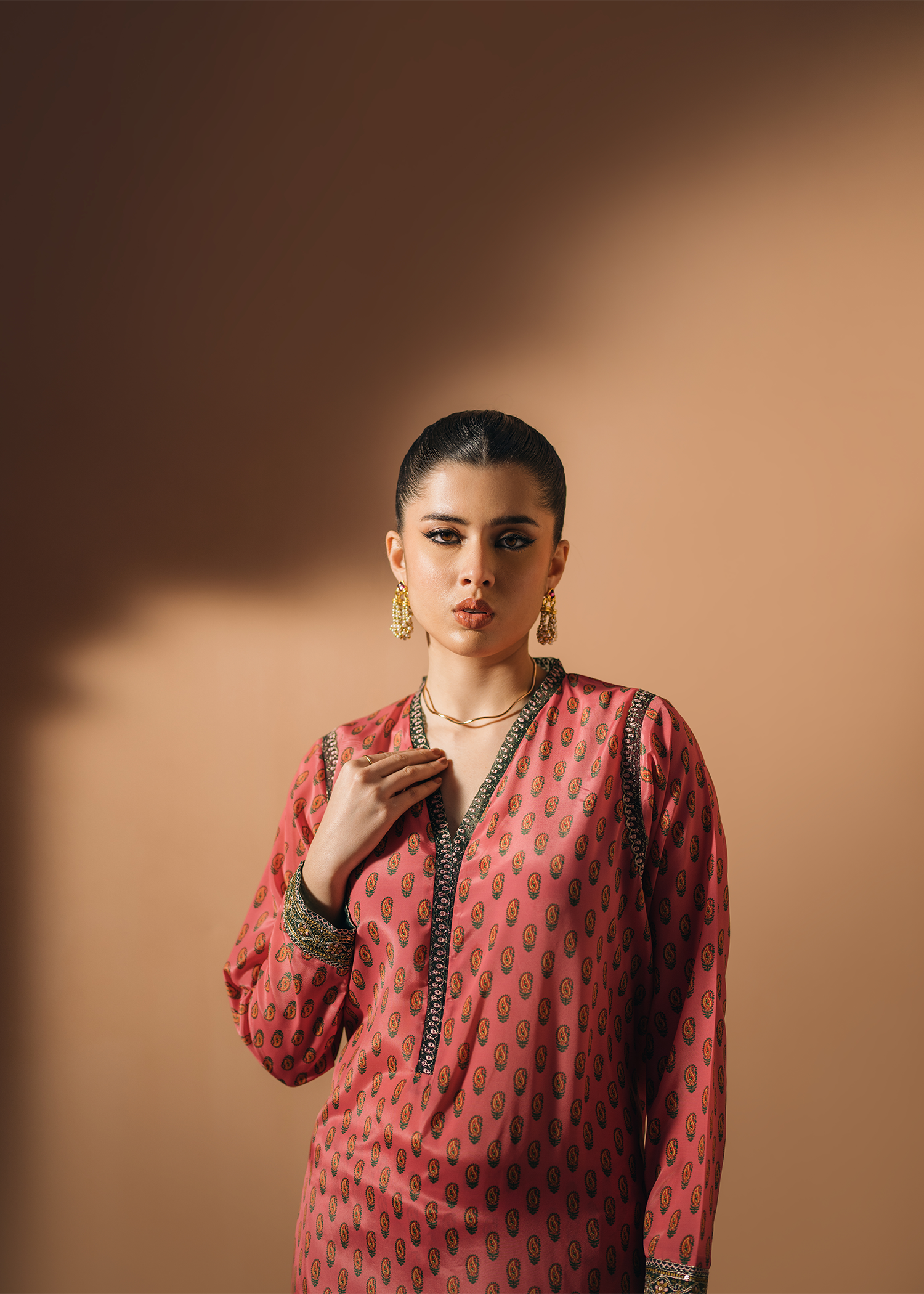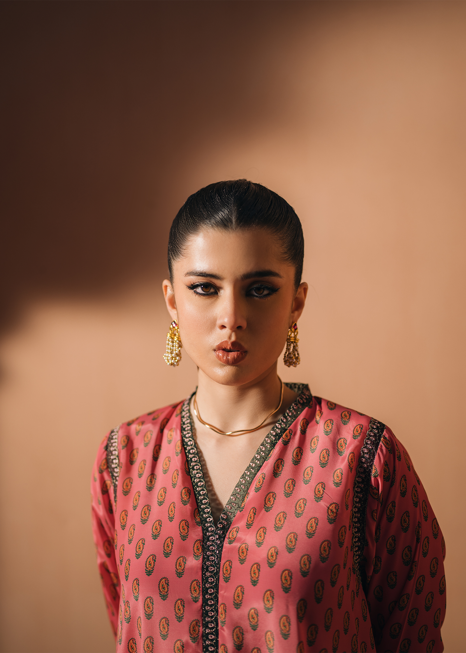 A chic two-piece matte pink ensemble featuring a loose-fit long shirt and sleek trousers. Crafted from printed silk, with tilla, sequins, and matte thread embroidery on the wide hem, slim-fit sleeves, and overlap neckline for an elegant finish.