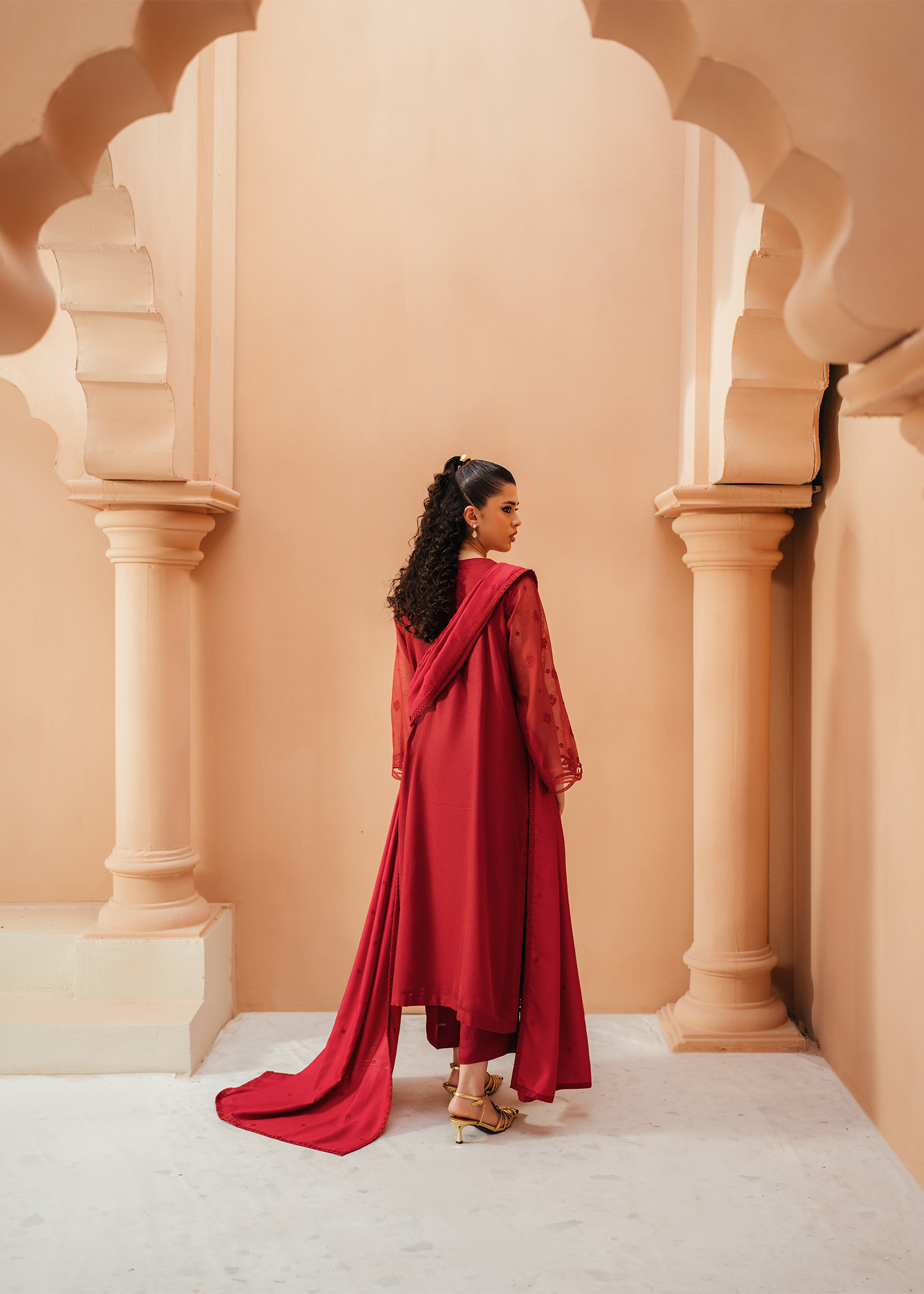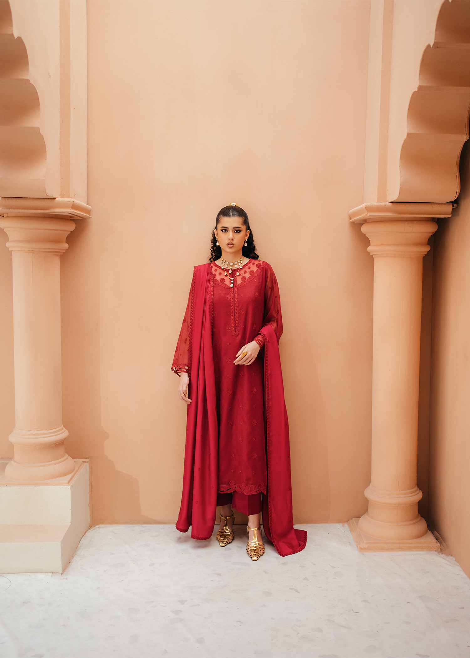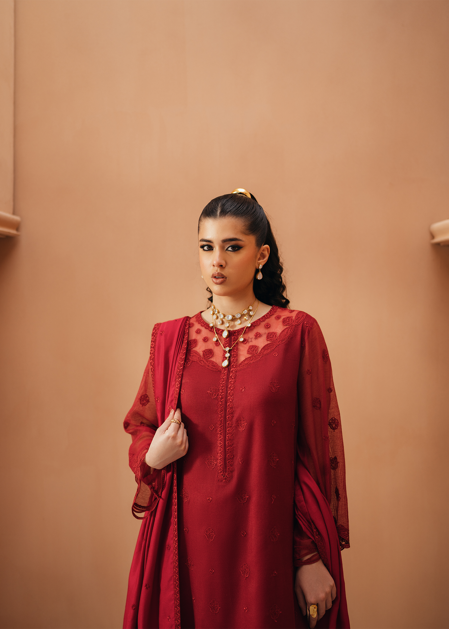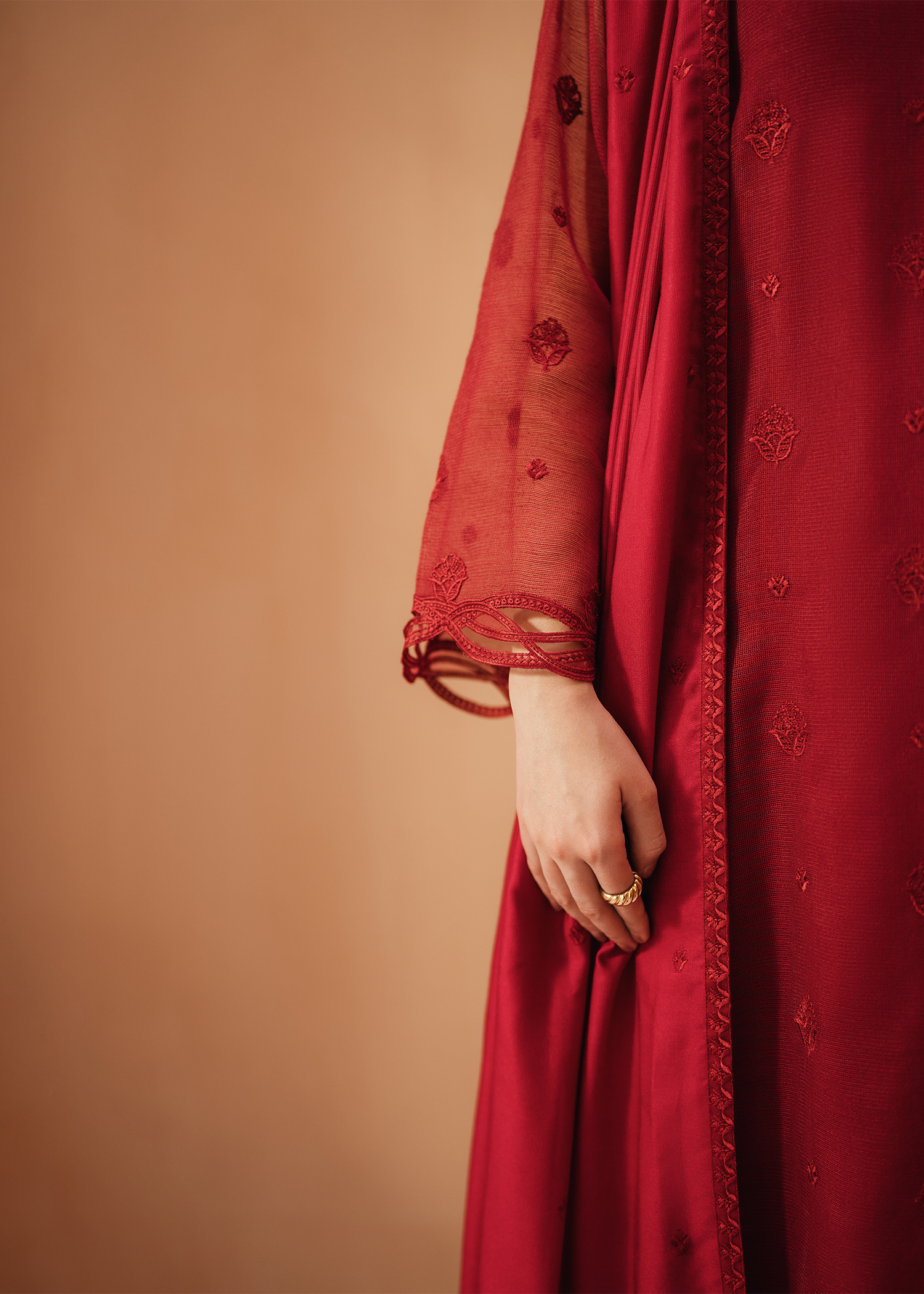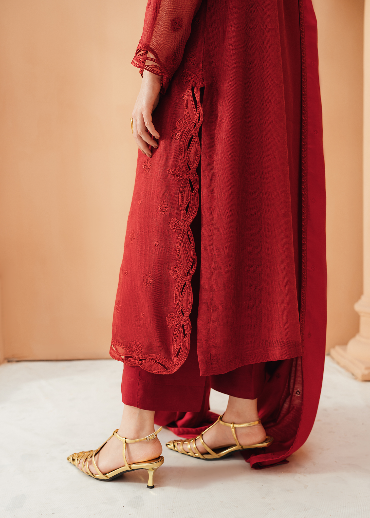 Deep red khaddi net shirt featuring same-on-same intricate embroidery across the shirt and neckline. The design is elevated with delicate applique cutwork at the hem and sleeves, adding a refined touch. Paired with an embroidered deep red cotton net dupatta and sleek silk trousers.