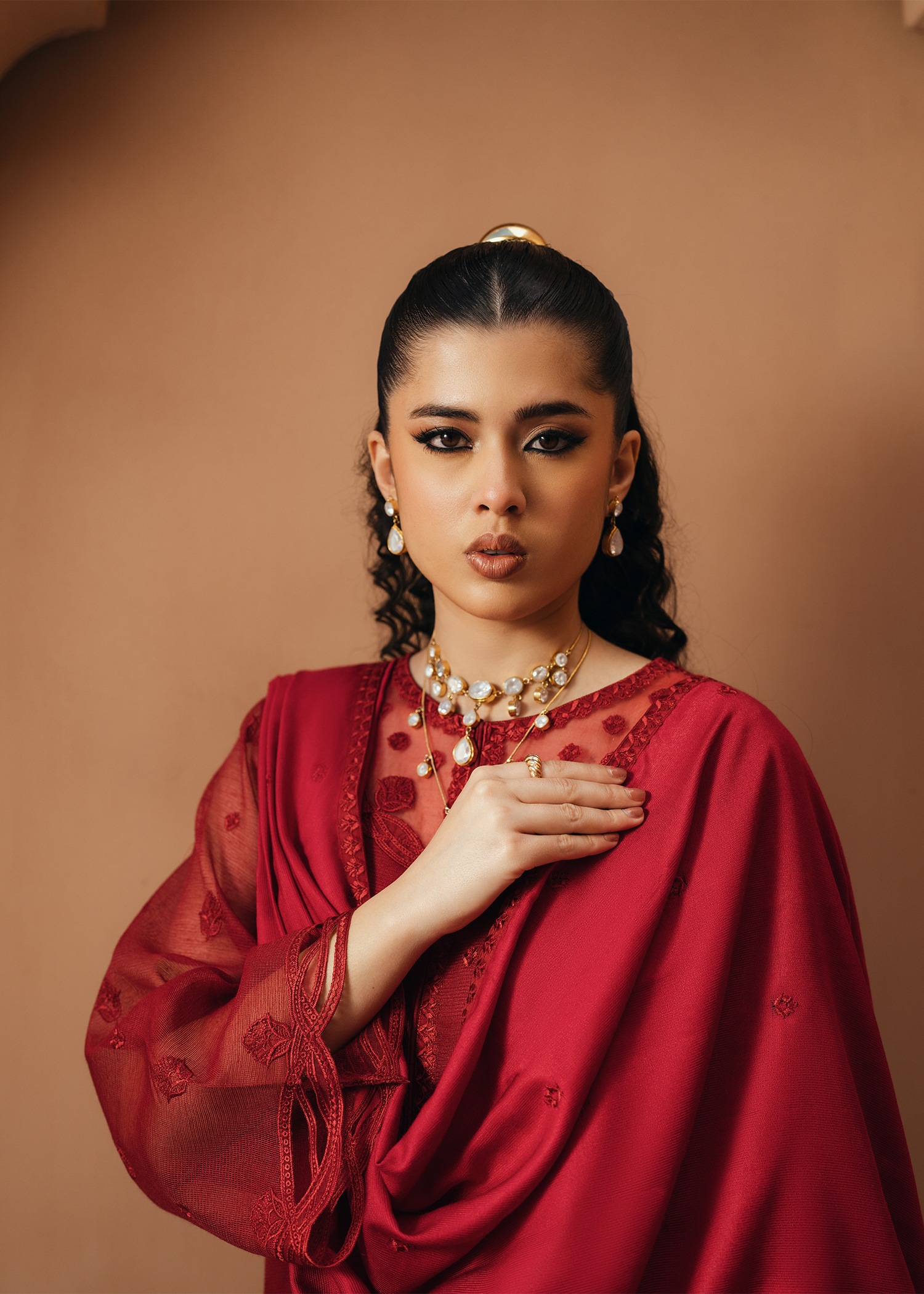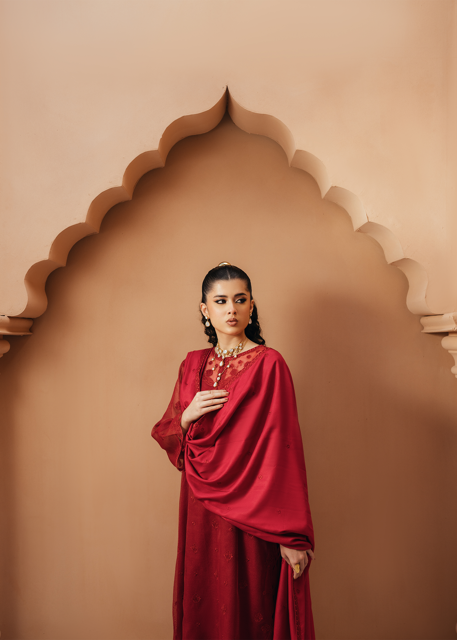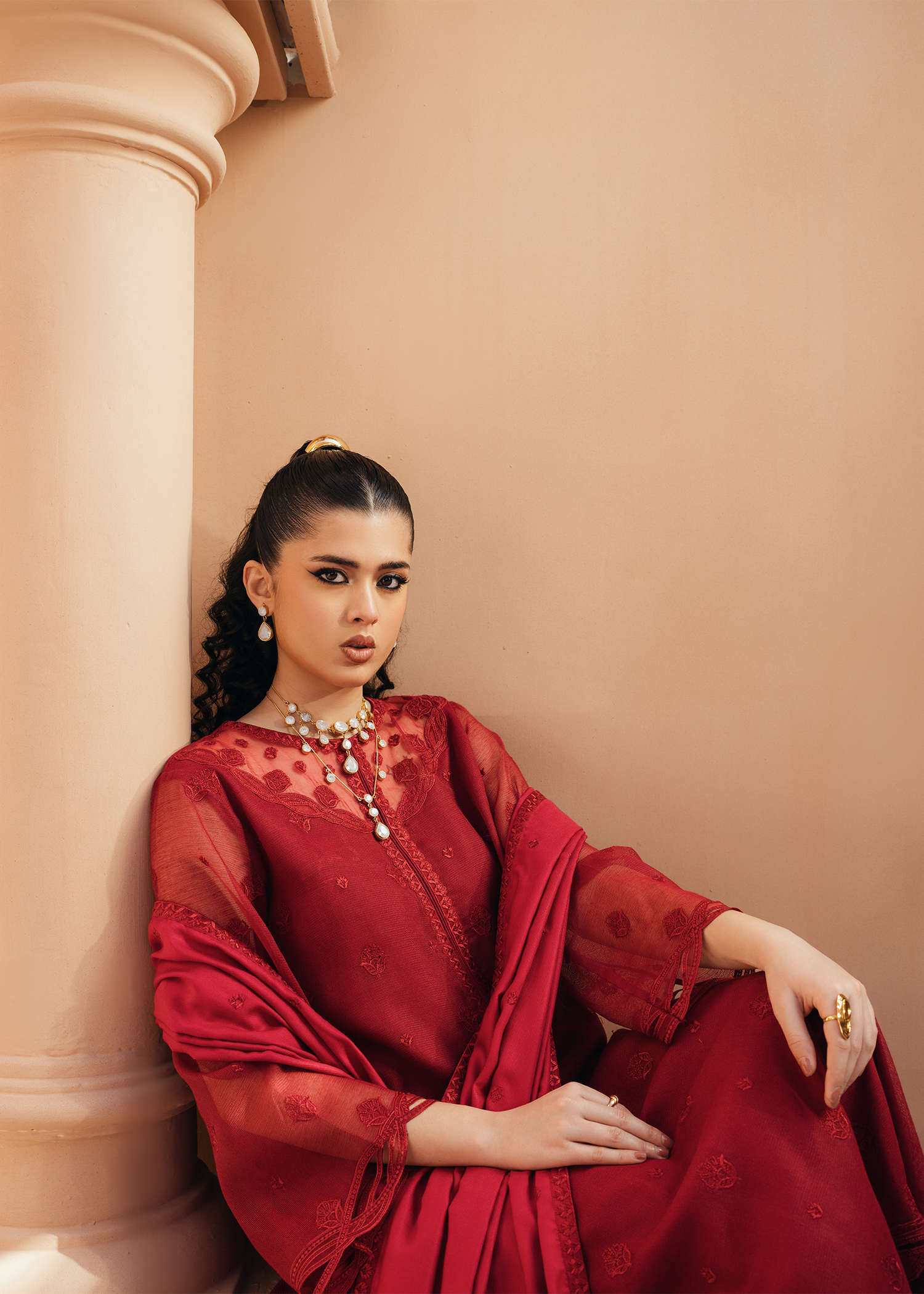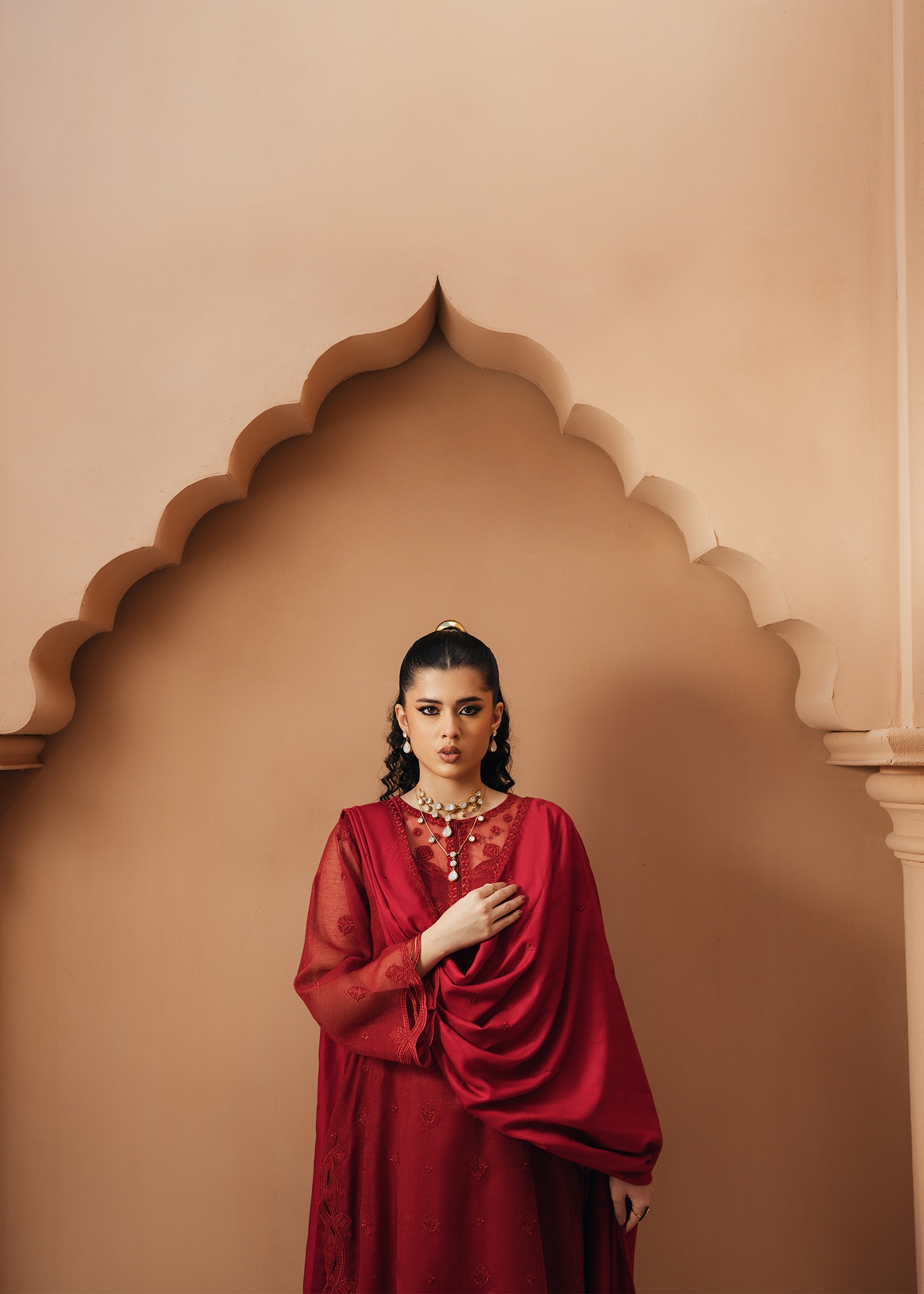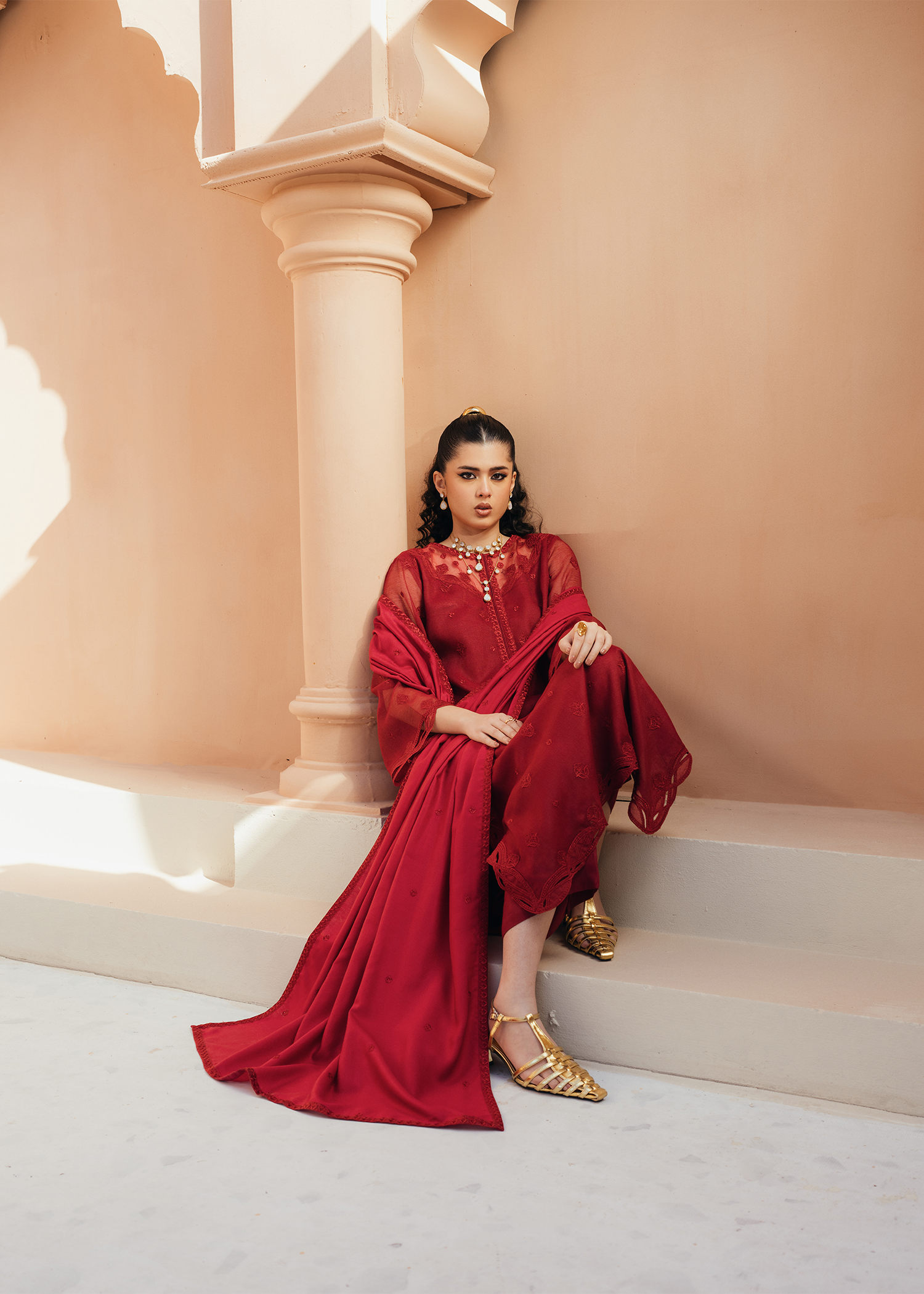 Deep red khaddi net shirt featuring same-on-same intricate embroidery across the shirt and neckline. The design is elevated with delicate applique cutwork at the hem and sleeves, adding a refined touch. Paired with an embroidered deep red cotton net dupatta and sleek silk trousers.