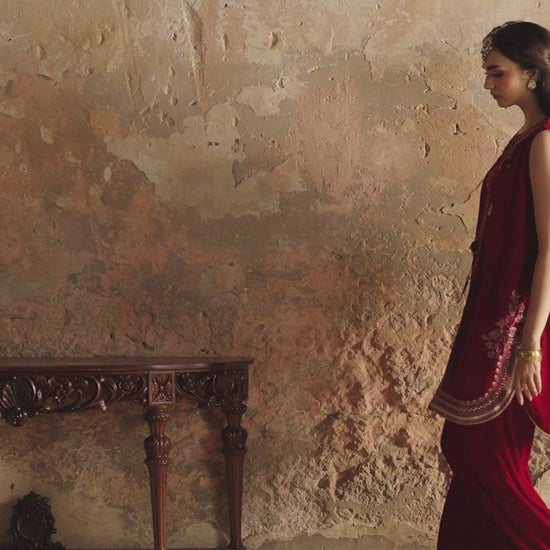 Turn heads with this striking short red velvet kameez, beautifully adorned with intricate tilla and sequin embroidery. The design is further enhanced with playful tassels and delicate 3D butterfly embellishments, adding a whimsical yet elegant flair. Paired with a flowy wide-leg sharara, this ensemble is perfect for celebratory gatherings. Comes with matching sleeves that can be attached as per your preference, offering versatility in styling.