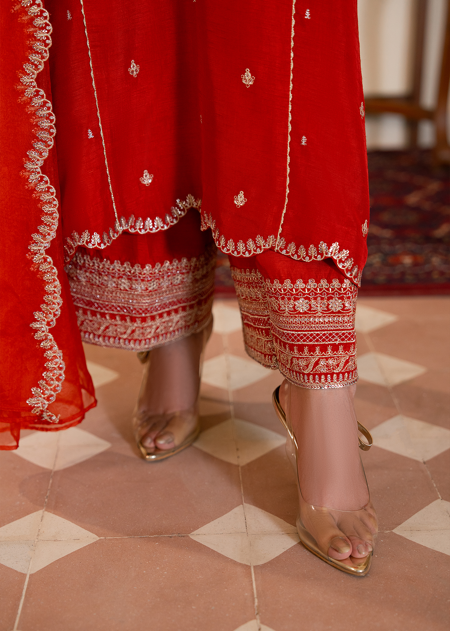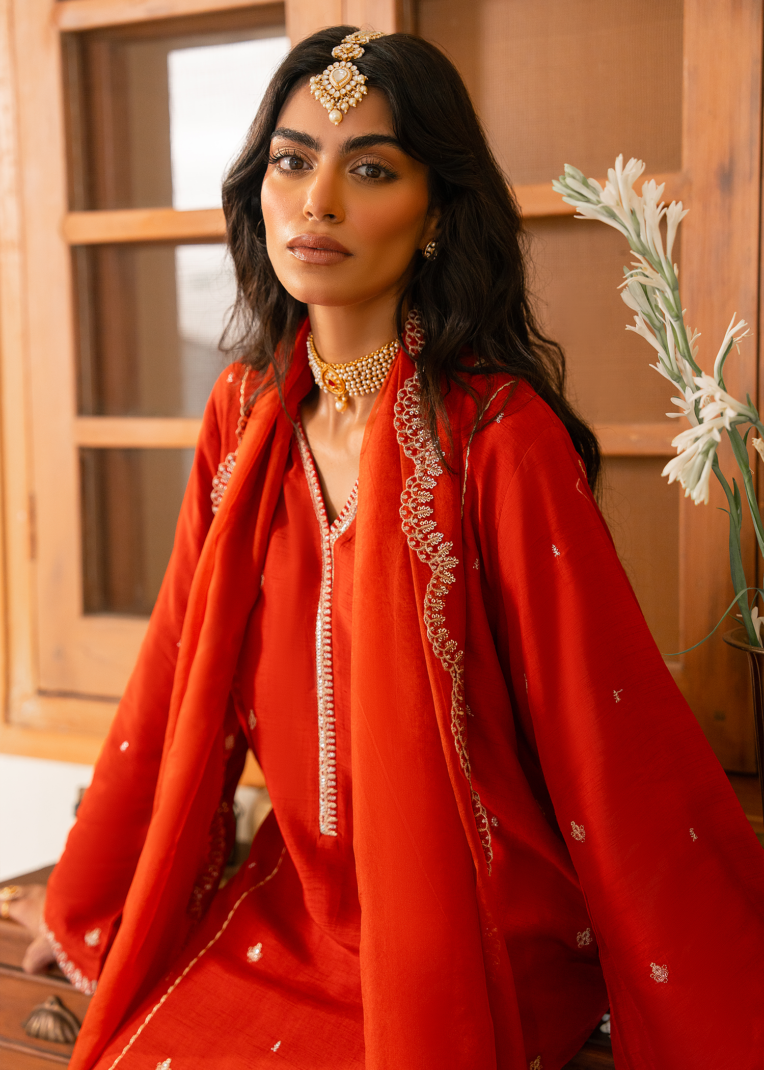 This rust coloured article has extensive gold tilla embroidery on the long shirt and loose pants, making it a perfect fit for events. The same gold tilla is used to create a scallop like pattern on the borders of the rust organza dupatta.