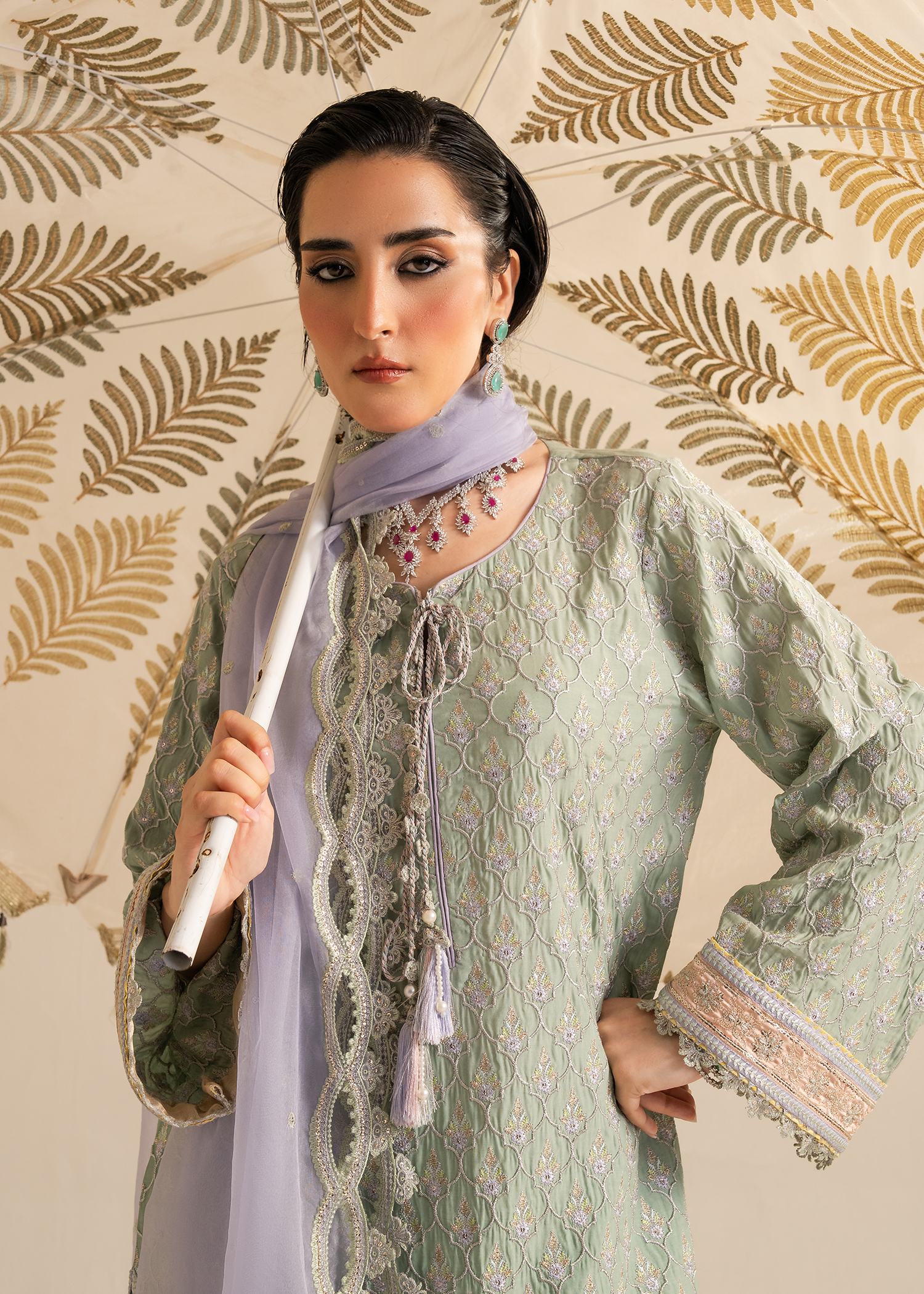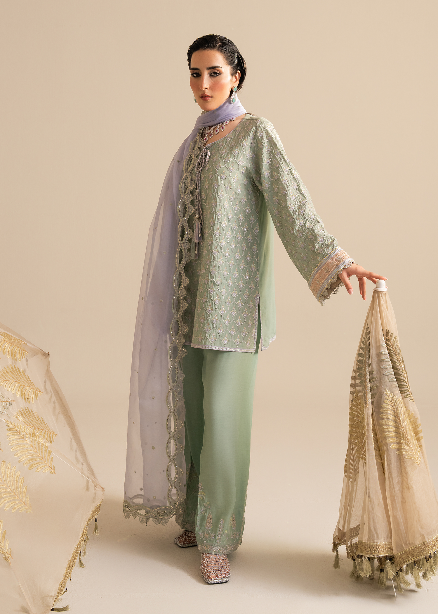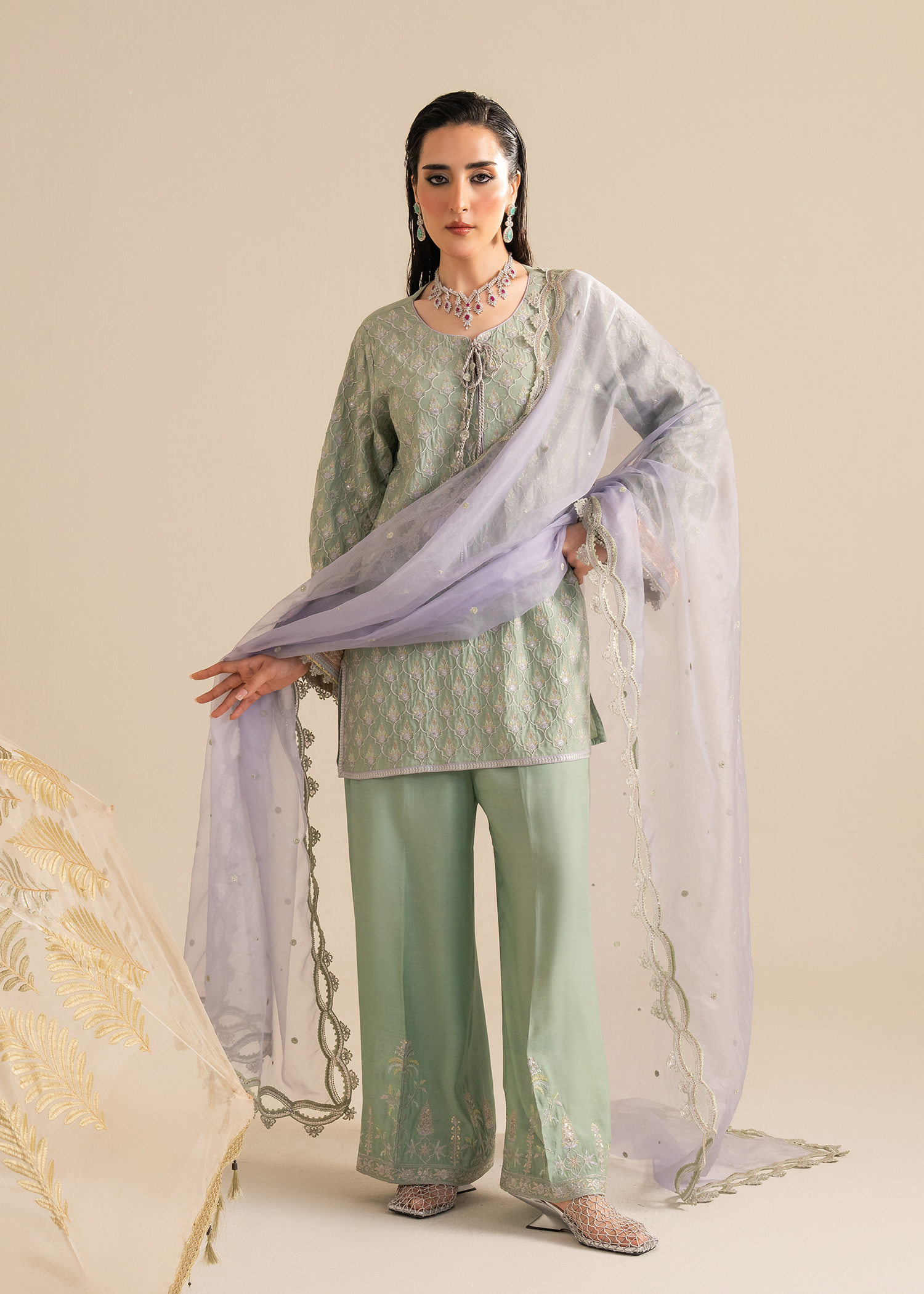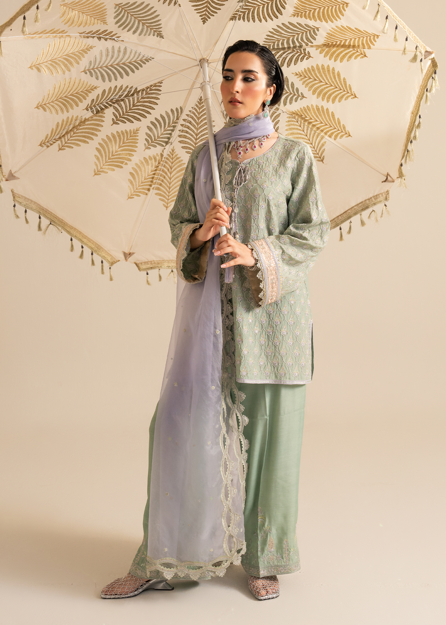 Turn heads with this beautifully composed ensemble, featuring a shirt adorned with all-over running embroidery, enhanced by delicate tassel details on the neckline and wide open sleeves finished with three-color borders and chatapati accents - a striking fusion of tradition and trend. The trouser boasts a unique straight cut, elevated with intricate tilla embroidery and sequins. Paired with a stunning dupatta, framed with cutwork borders on all four sides and a graceful all-over spray.