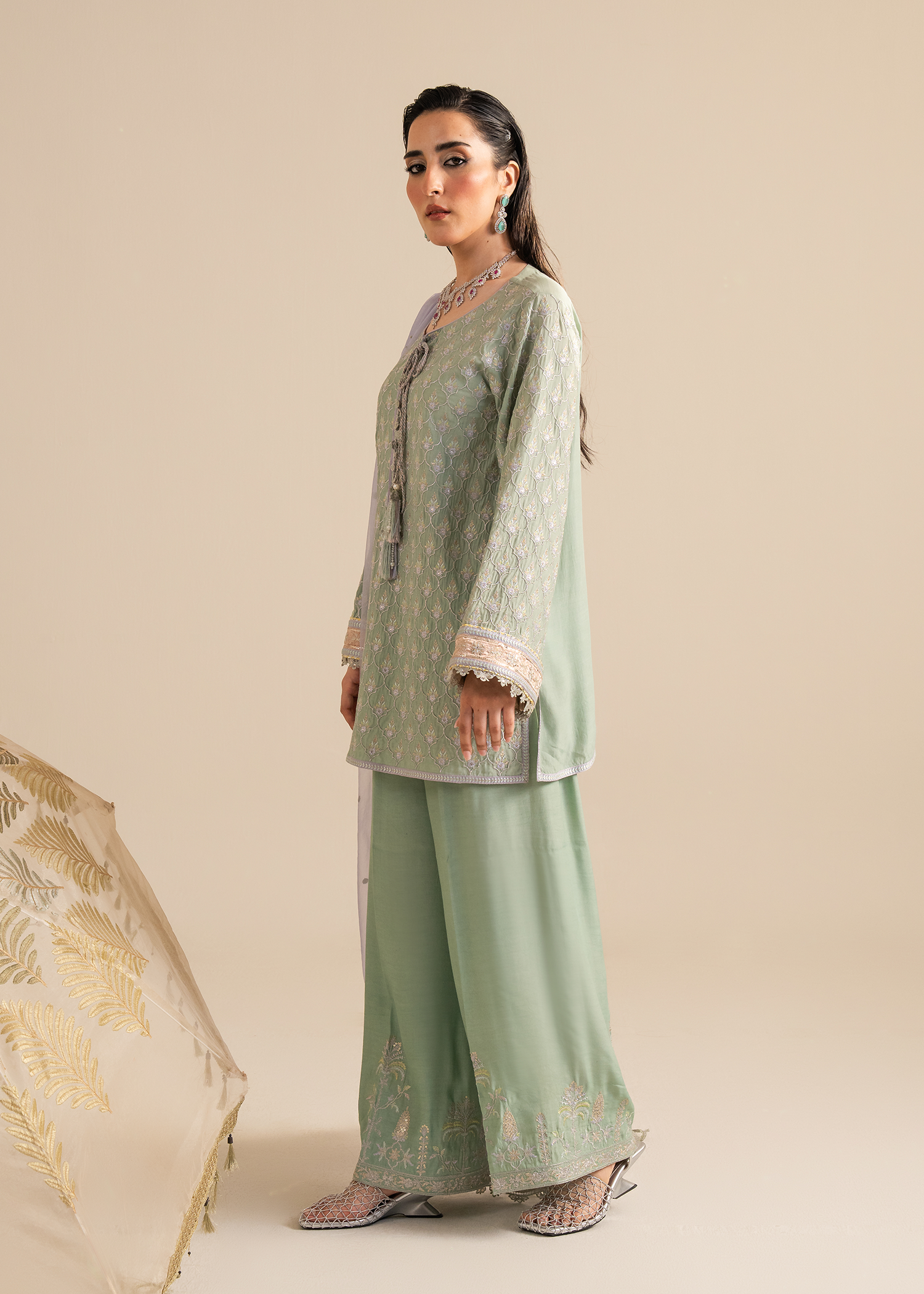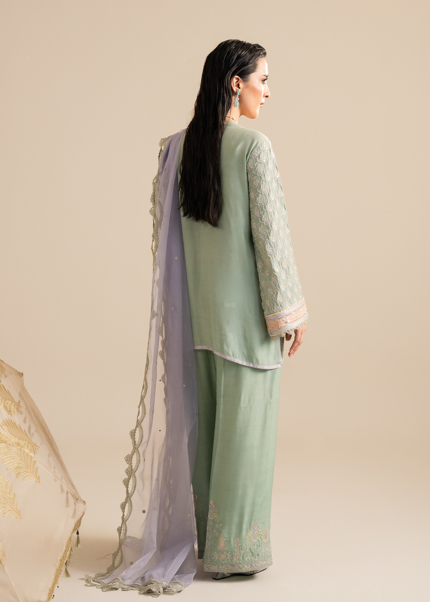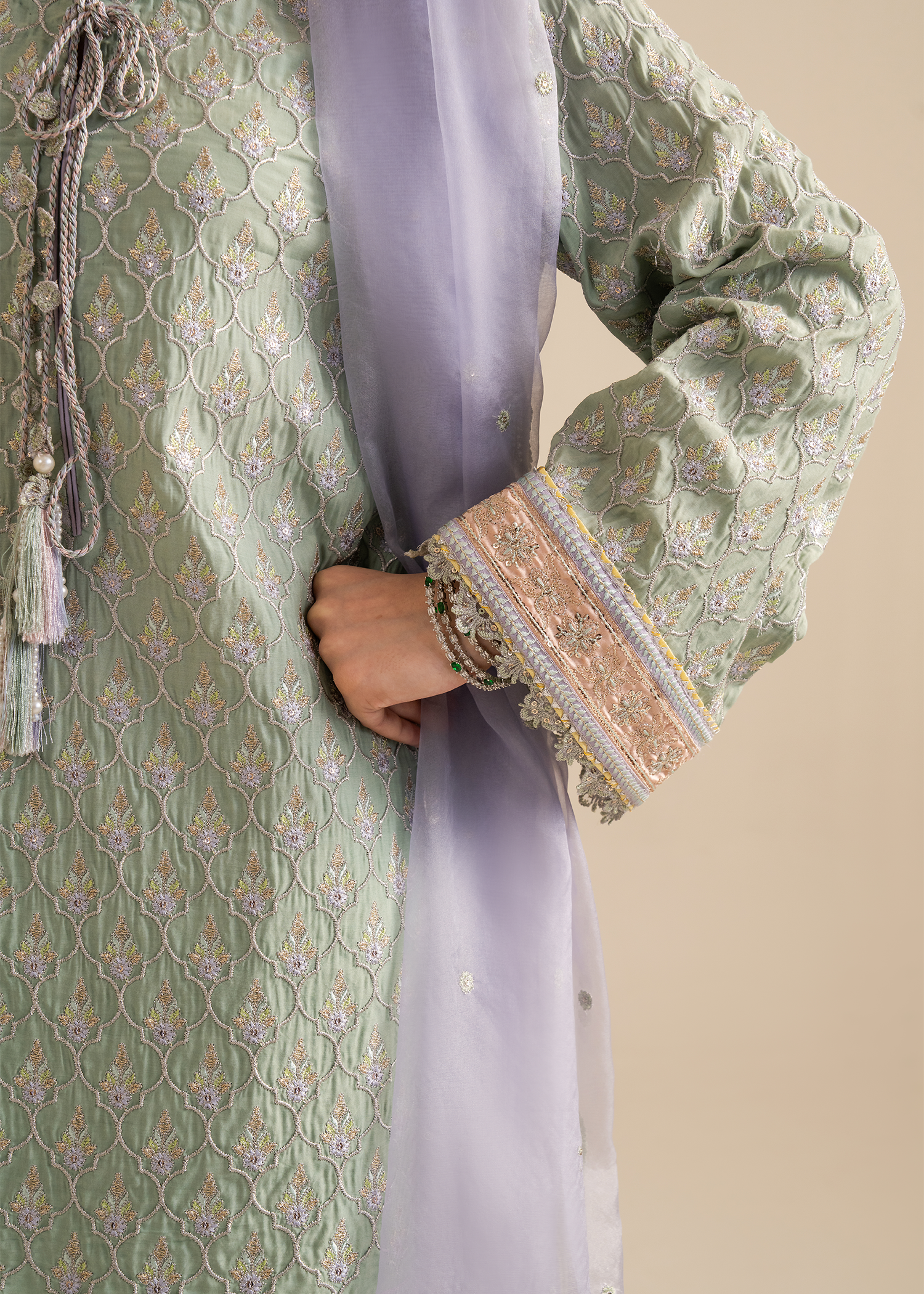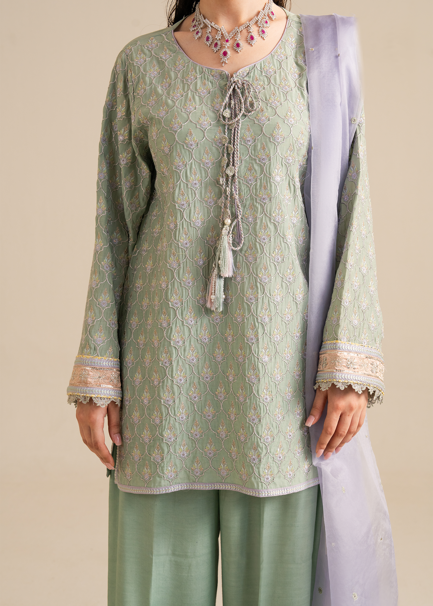 Turn heads with this beautifully composed ensemble, featuring a shirt adorned with all-over running embroidery, enhanced by delicate tassel details on the neckline and wide open sleeves finished with three-color borders and chatapati accents - a striking fusion of tradition and trend. The trouser boasts a unique straight cut, elevated with intricate tilla embroidery and sequins. Paired with a stunning dupatta, framed with cutwork borders on all four sides and a graceful all-over spray.
