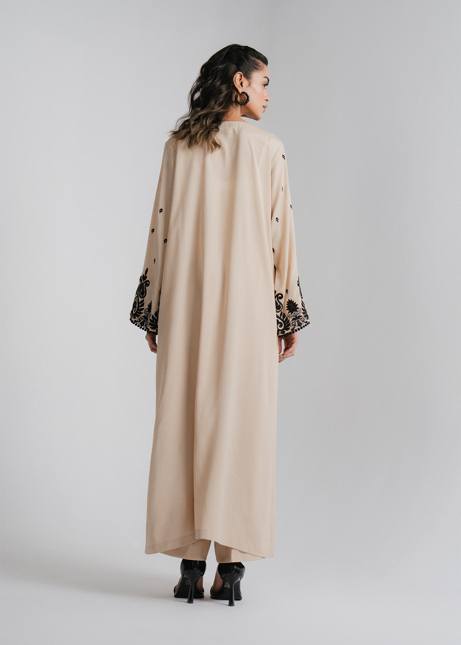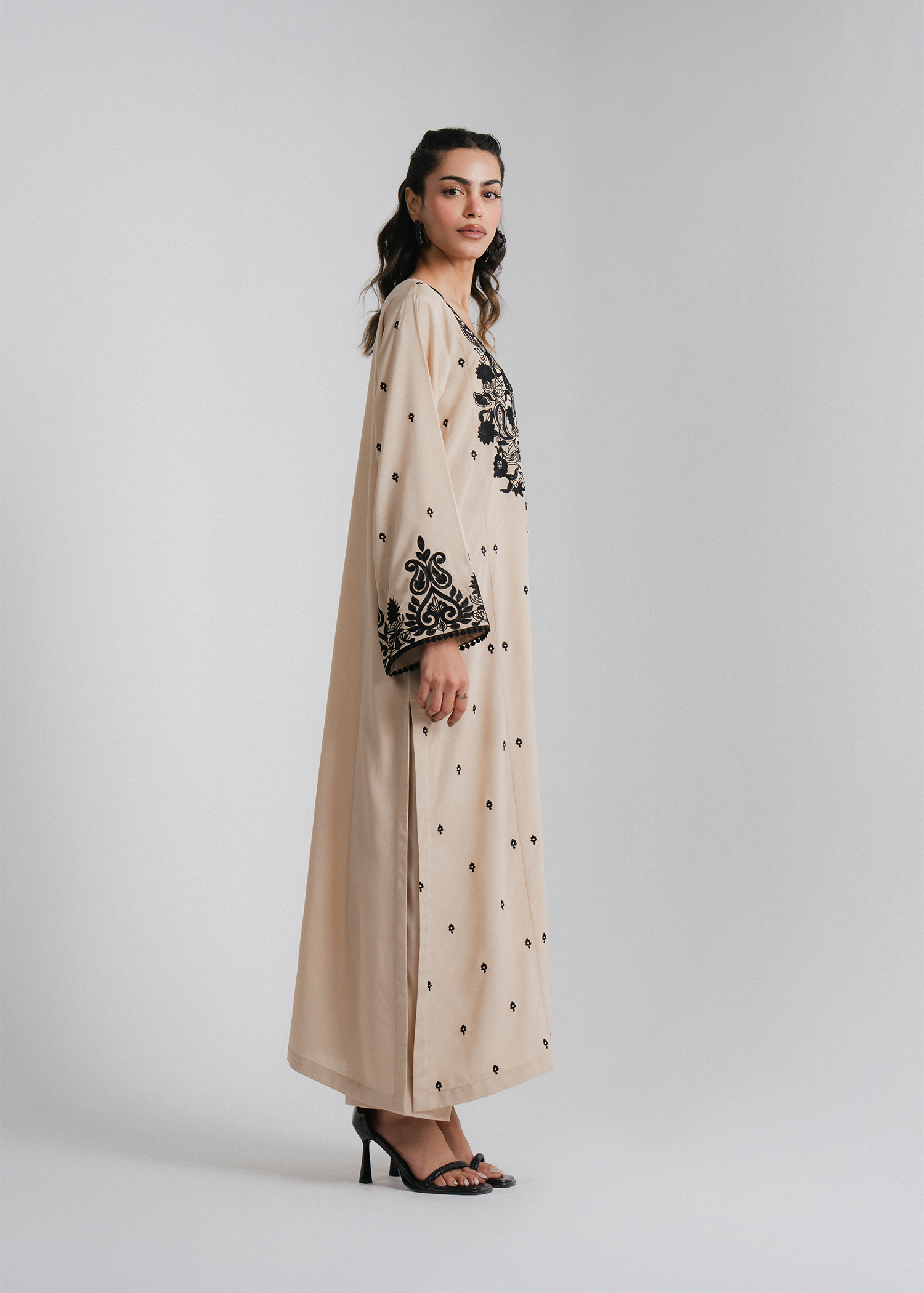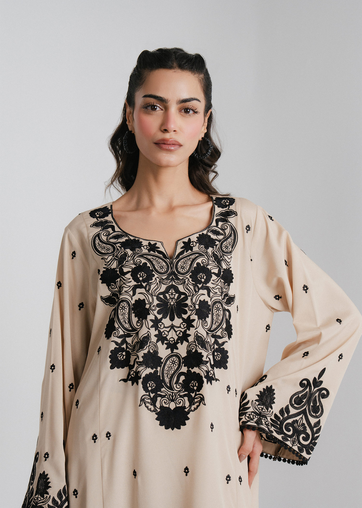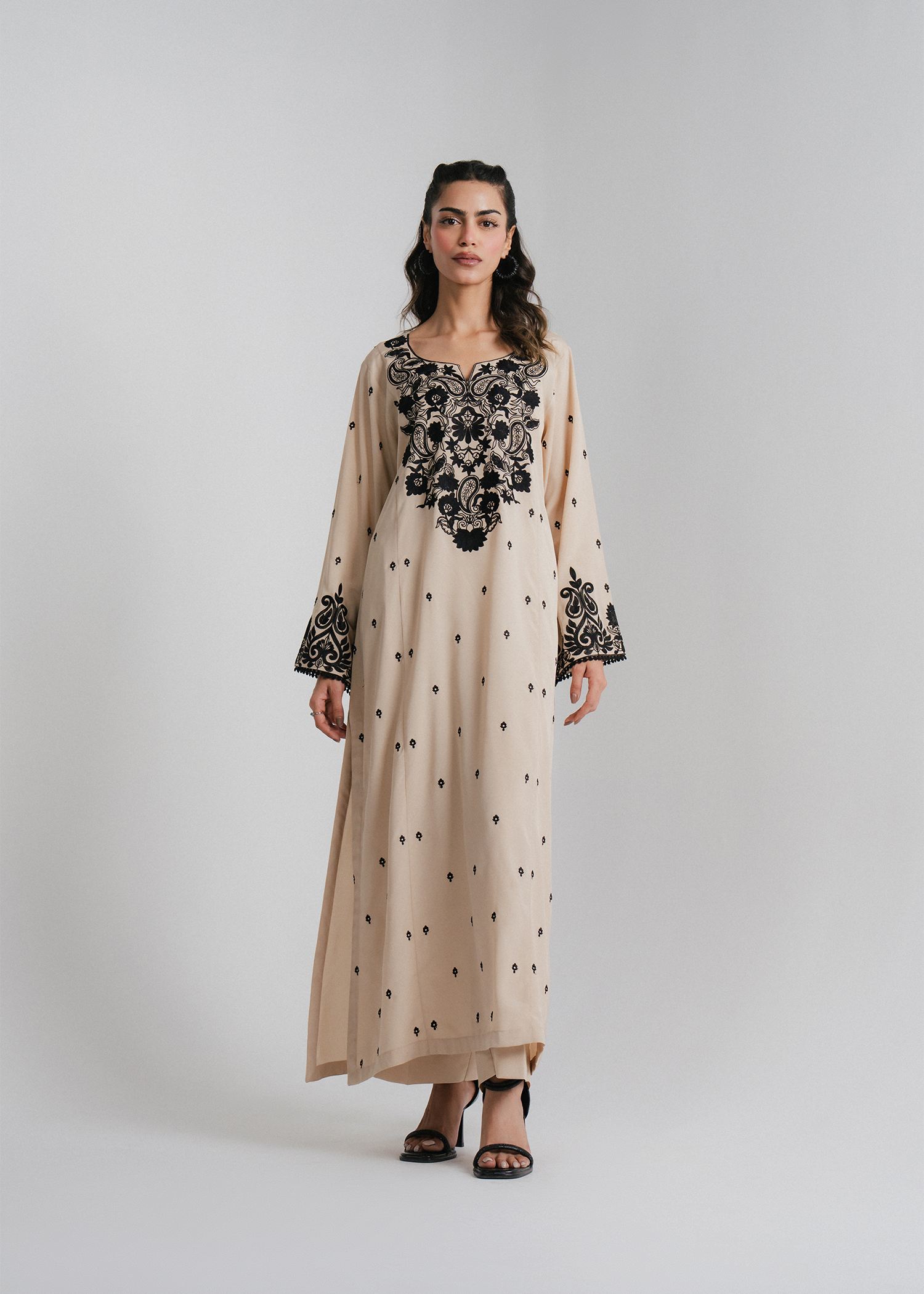 A refined two-piece ensemble crafted from malai georgette, featuring a straight three-paneled shirt with intricate black embroidery on the neckline and an all-over embroidered spray. Paired with a classic basic trouser.