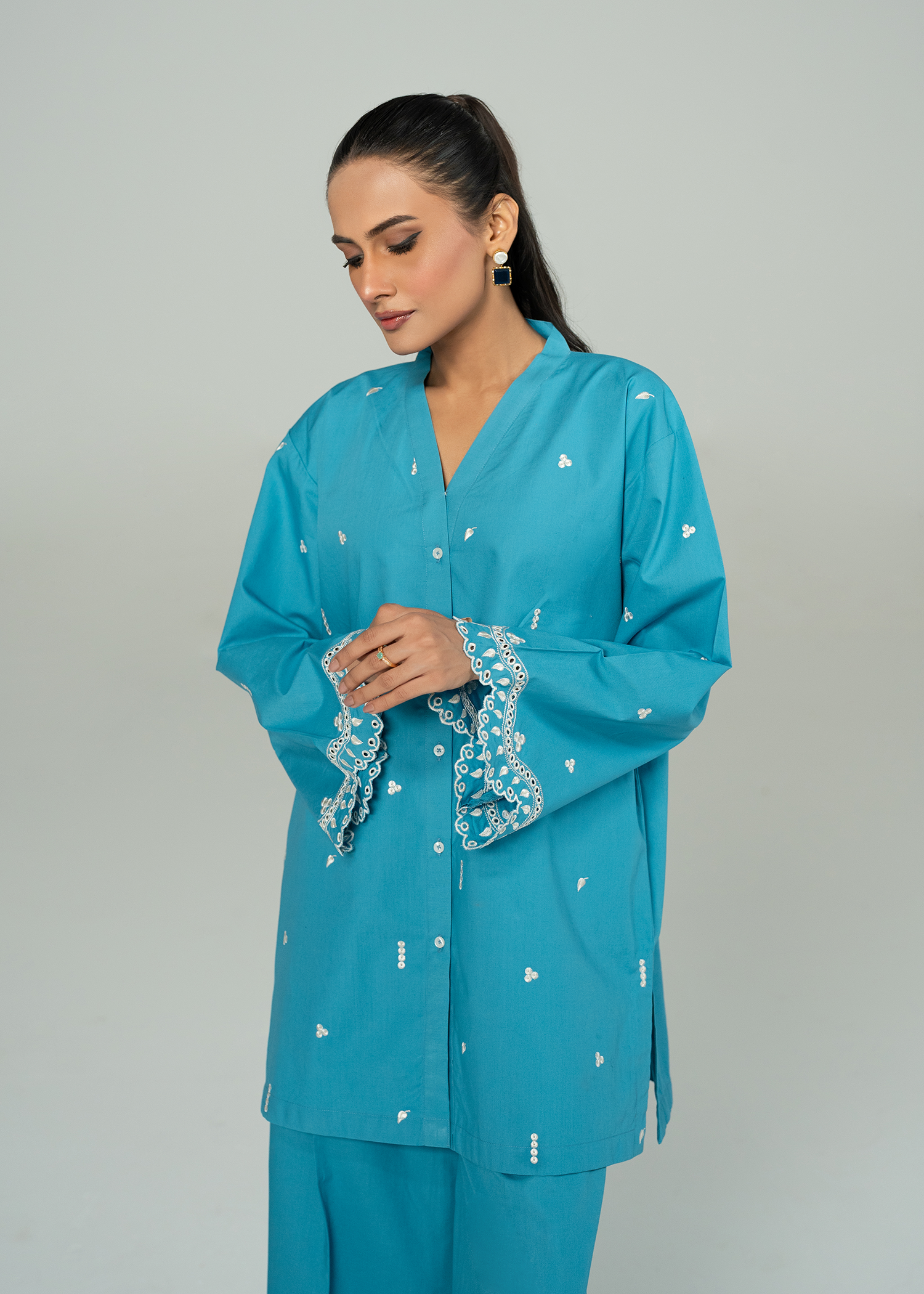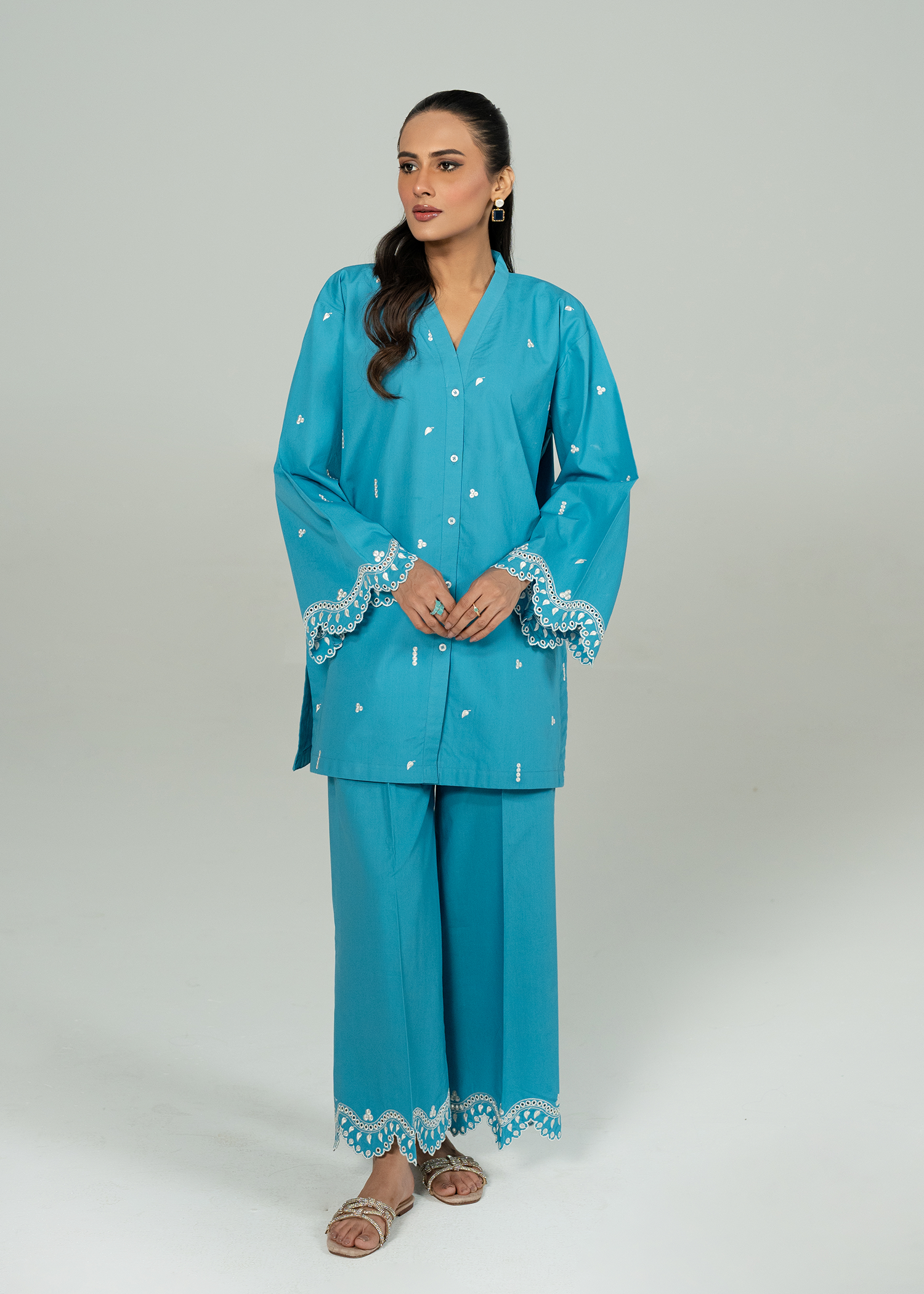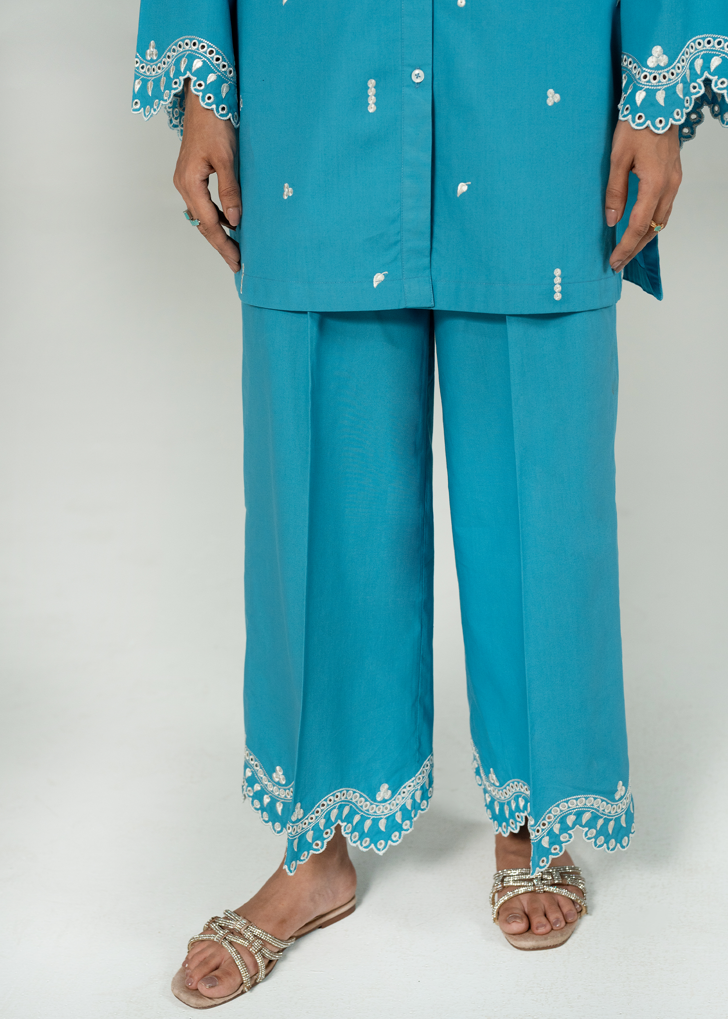 A vibrant teal co ord set with fine embroidery, and scalloped details on sleeves and trouser.