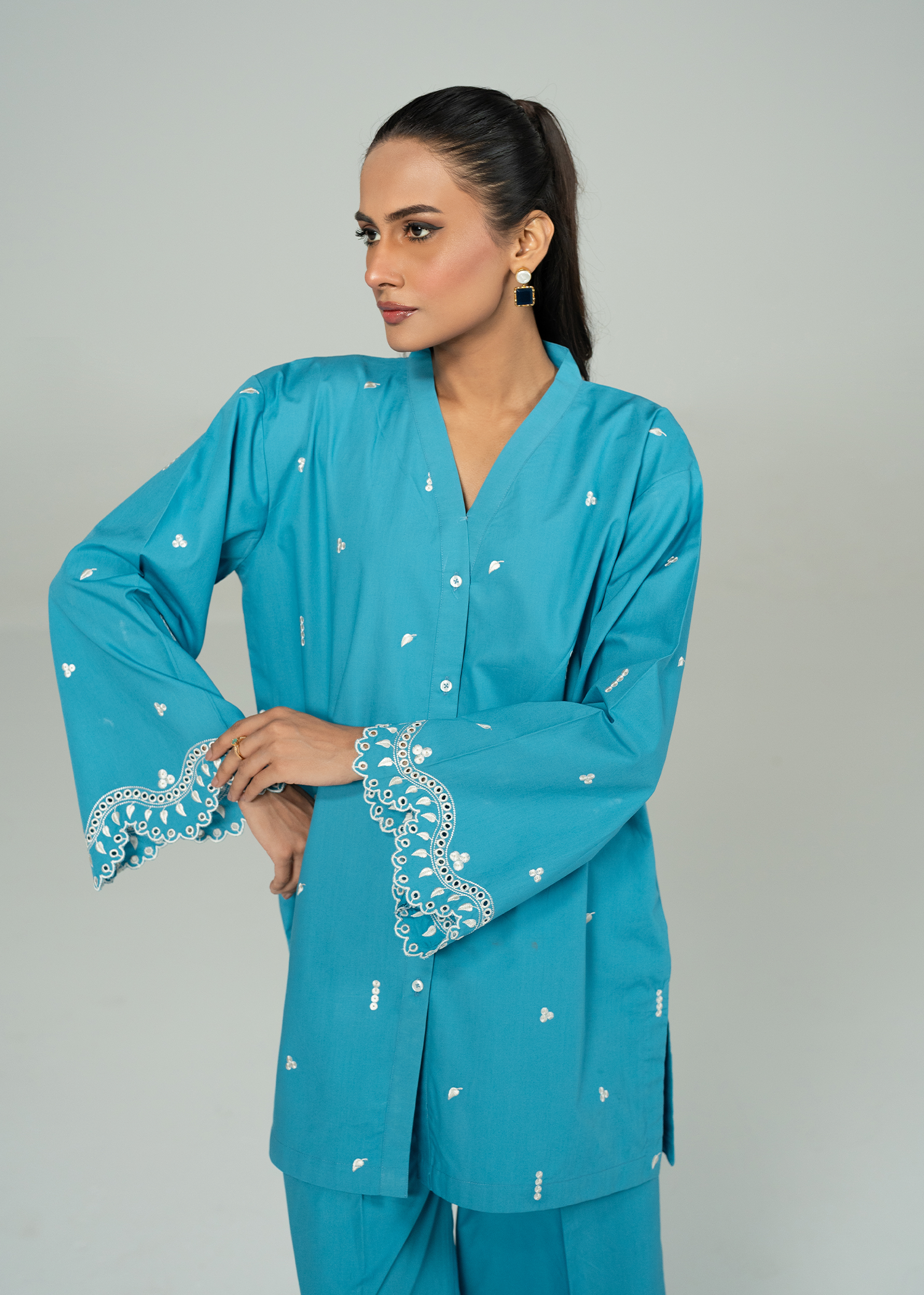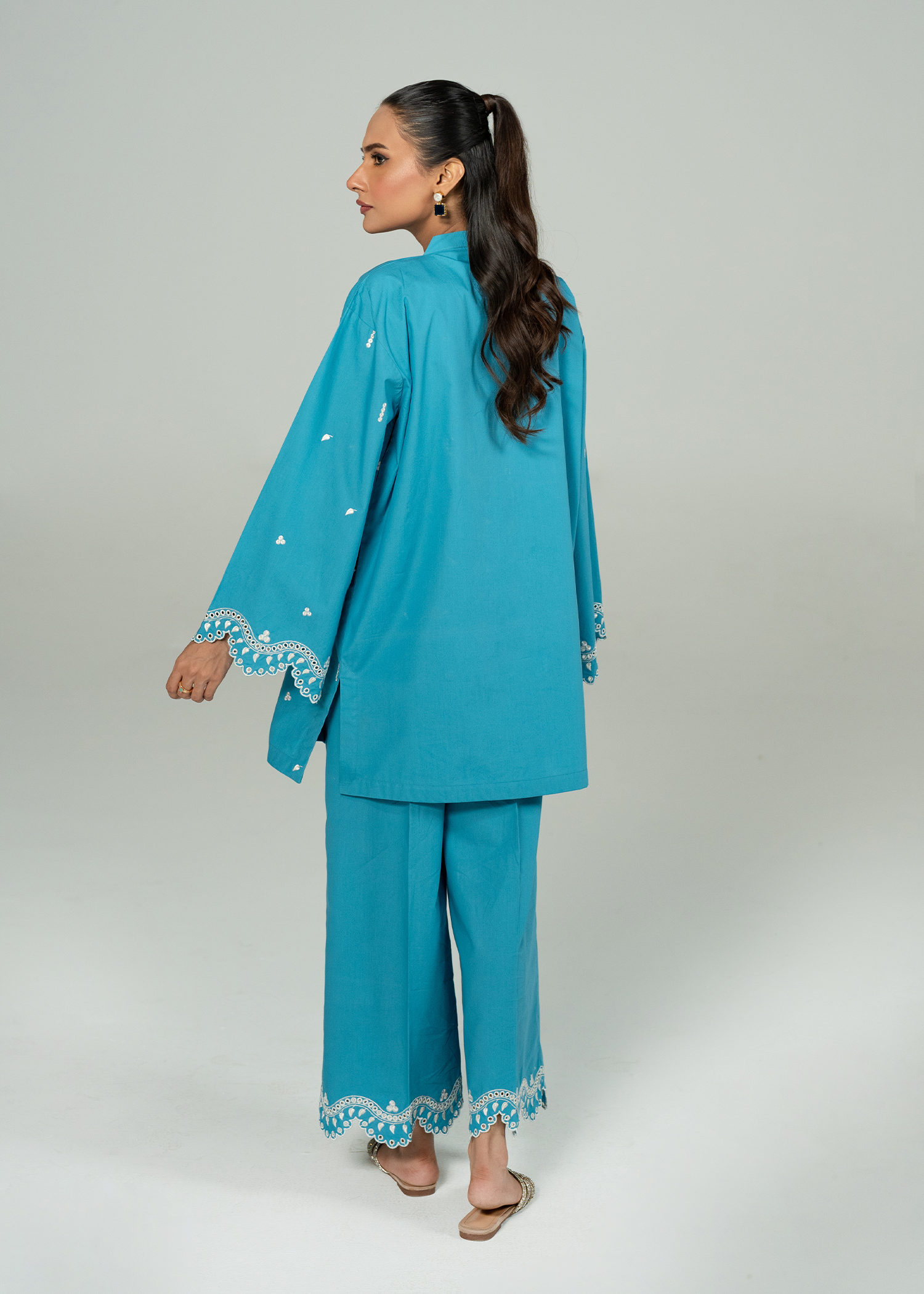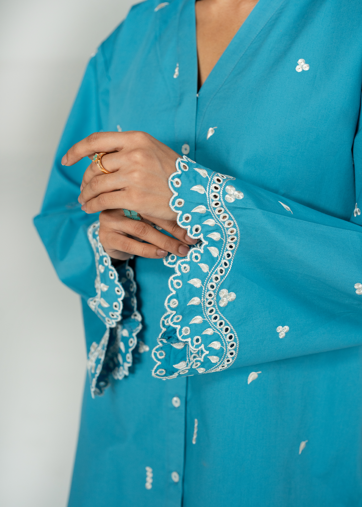 A vibrant teal co ord set with fine embroidery, and scalloped details on sleeves and trouser.