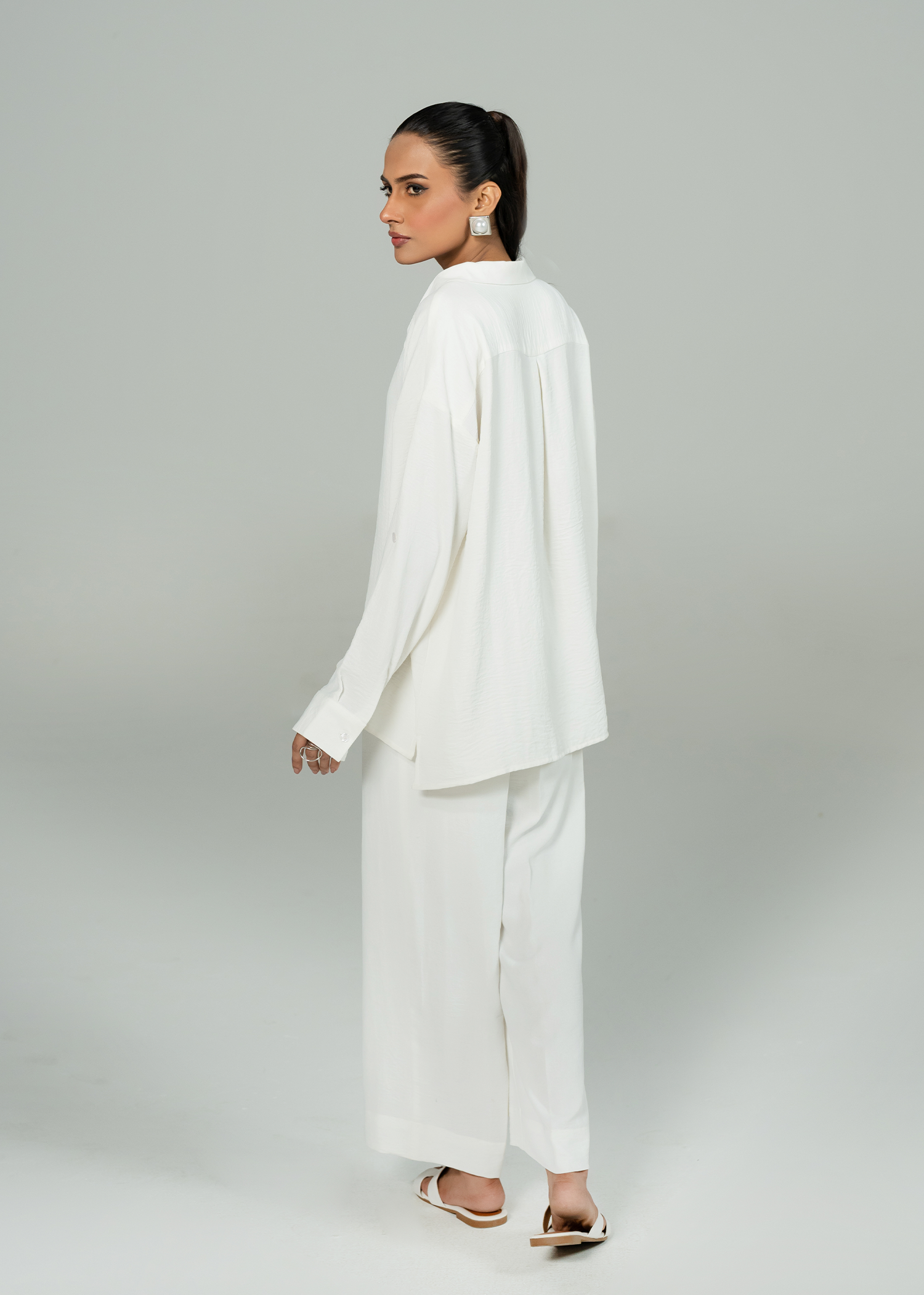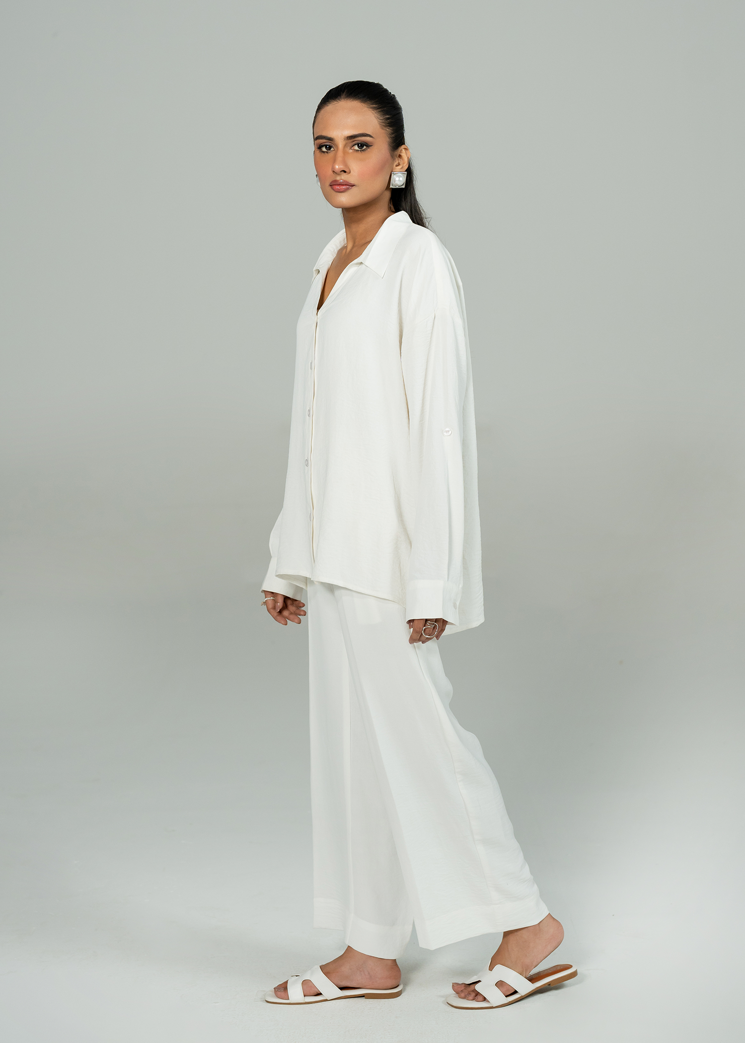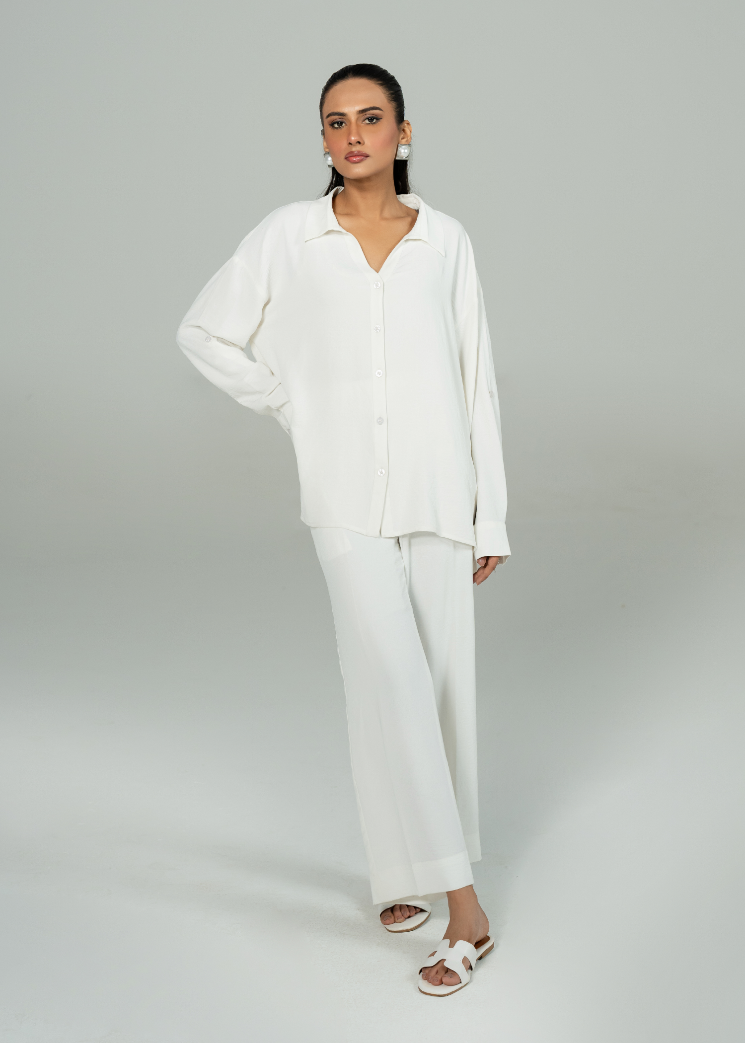 A refined co-ord set featuring a timeless button-down shirt paired with sleek straight cut trousers perfect for effortless, everyday style.