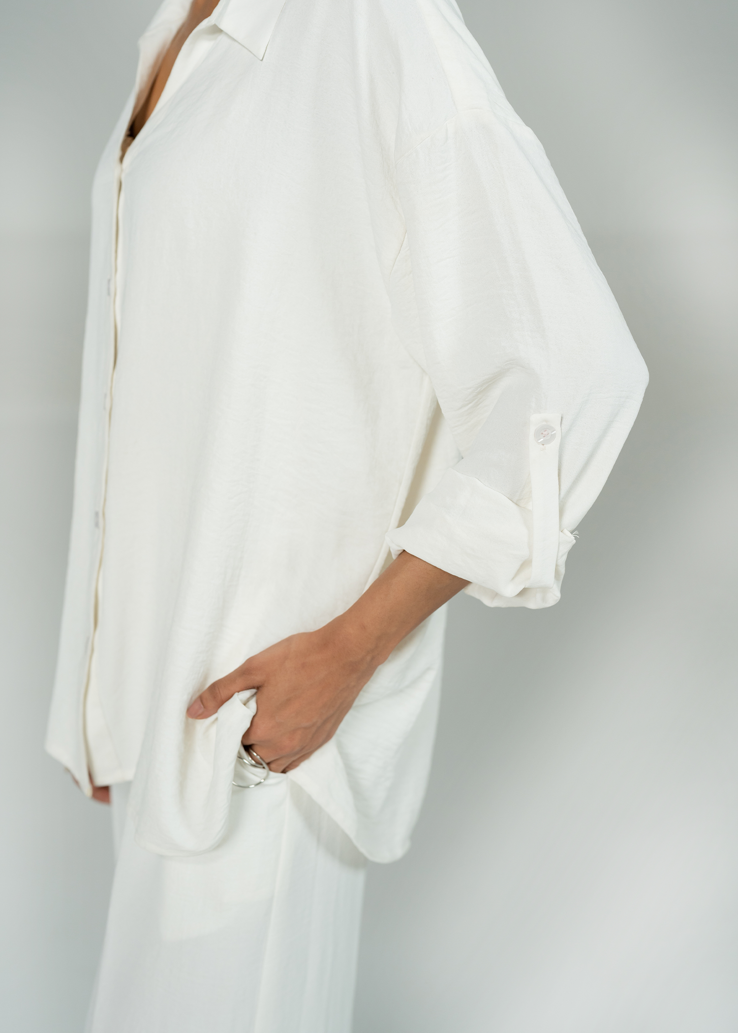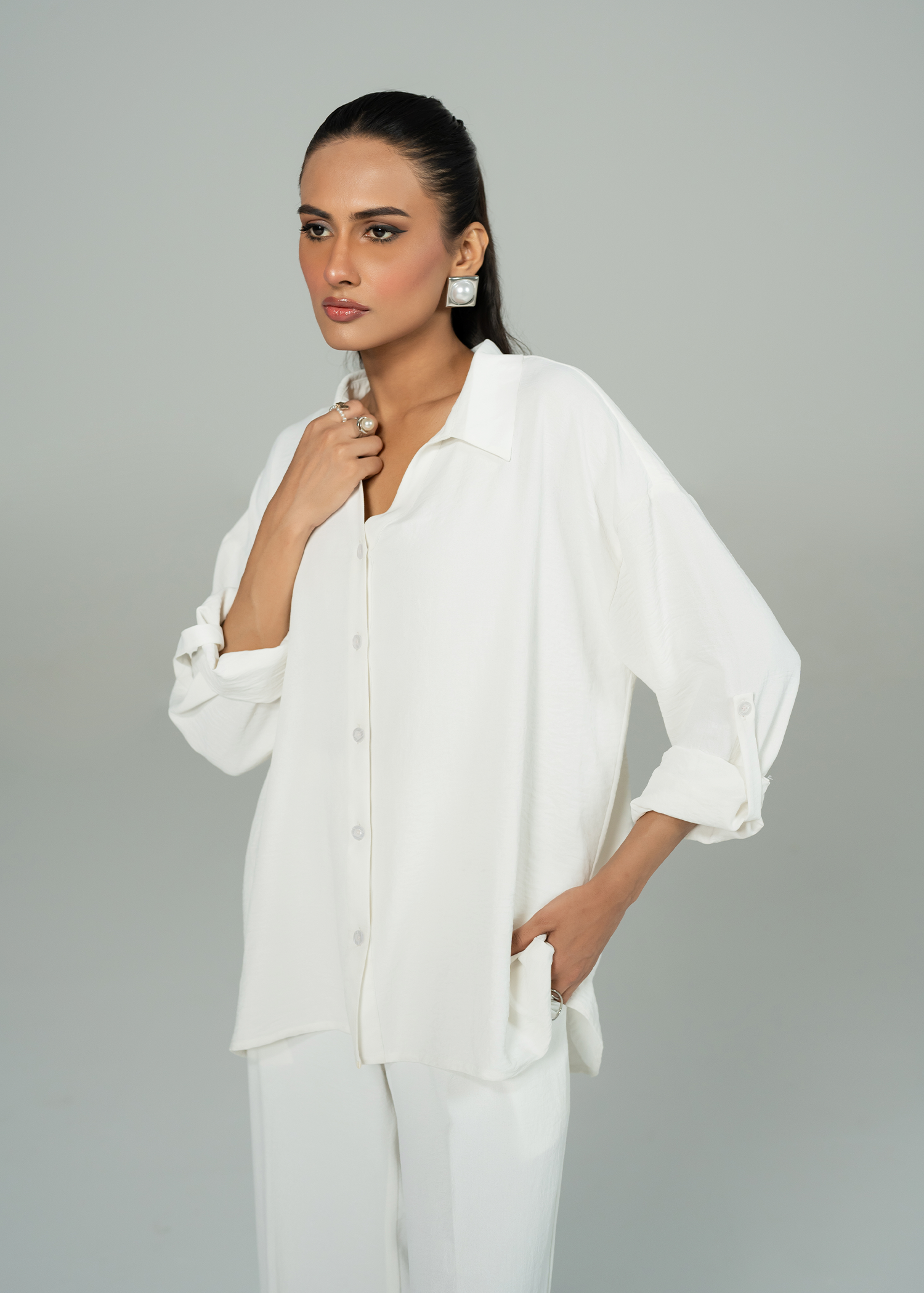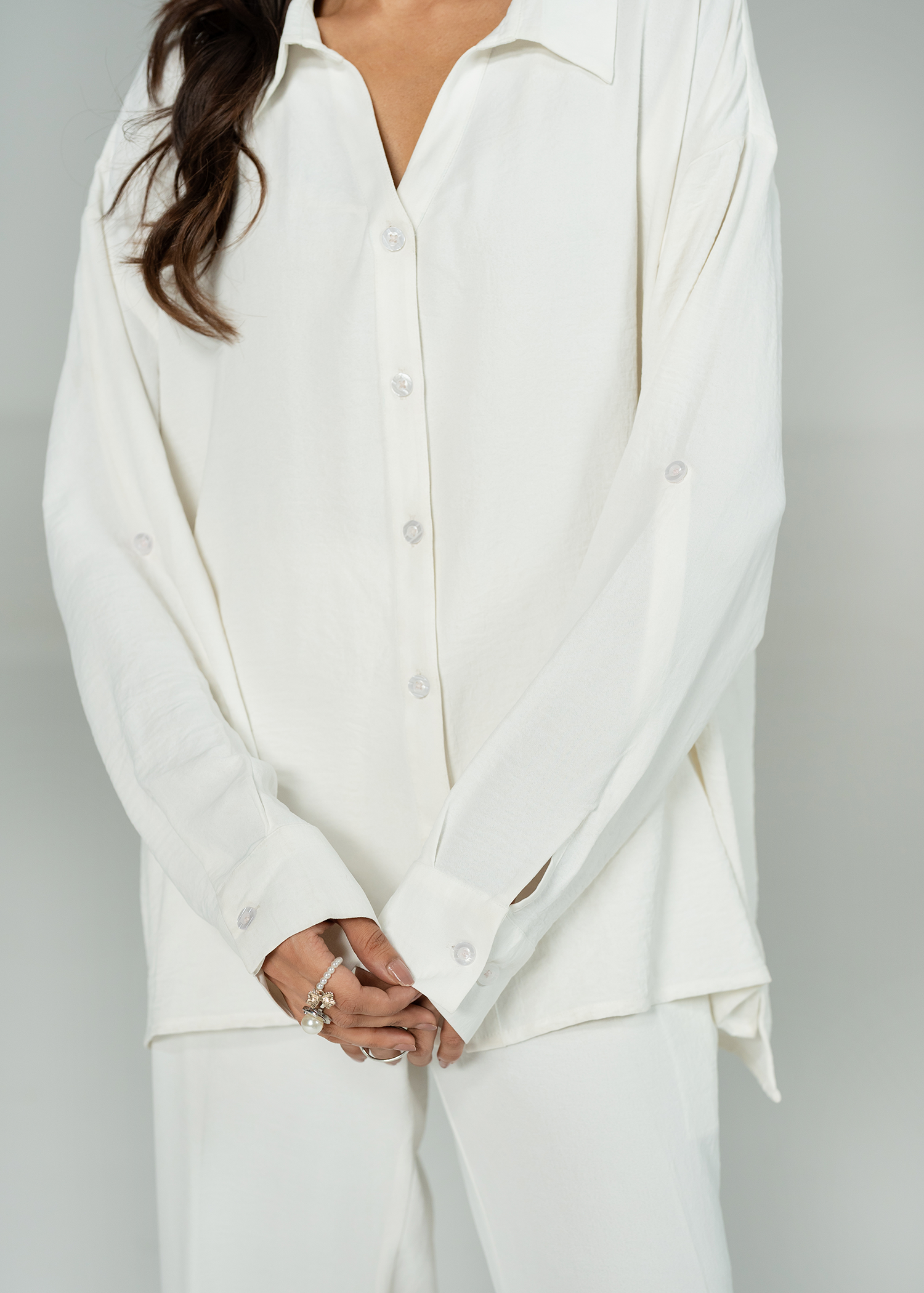 A refined co-ord set featuring a timeless button-down shirt paired with sleek straight cut trousers perfect for effortless, everyday style.