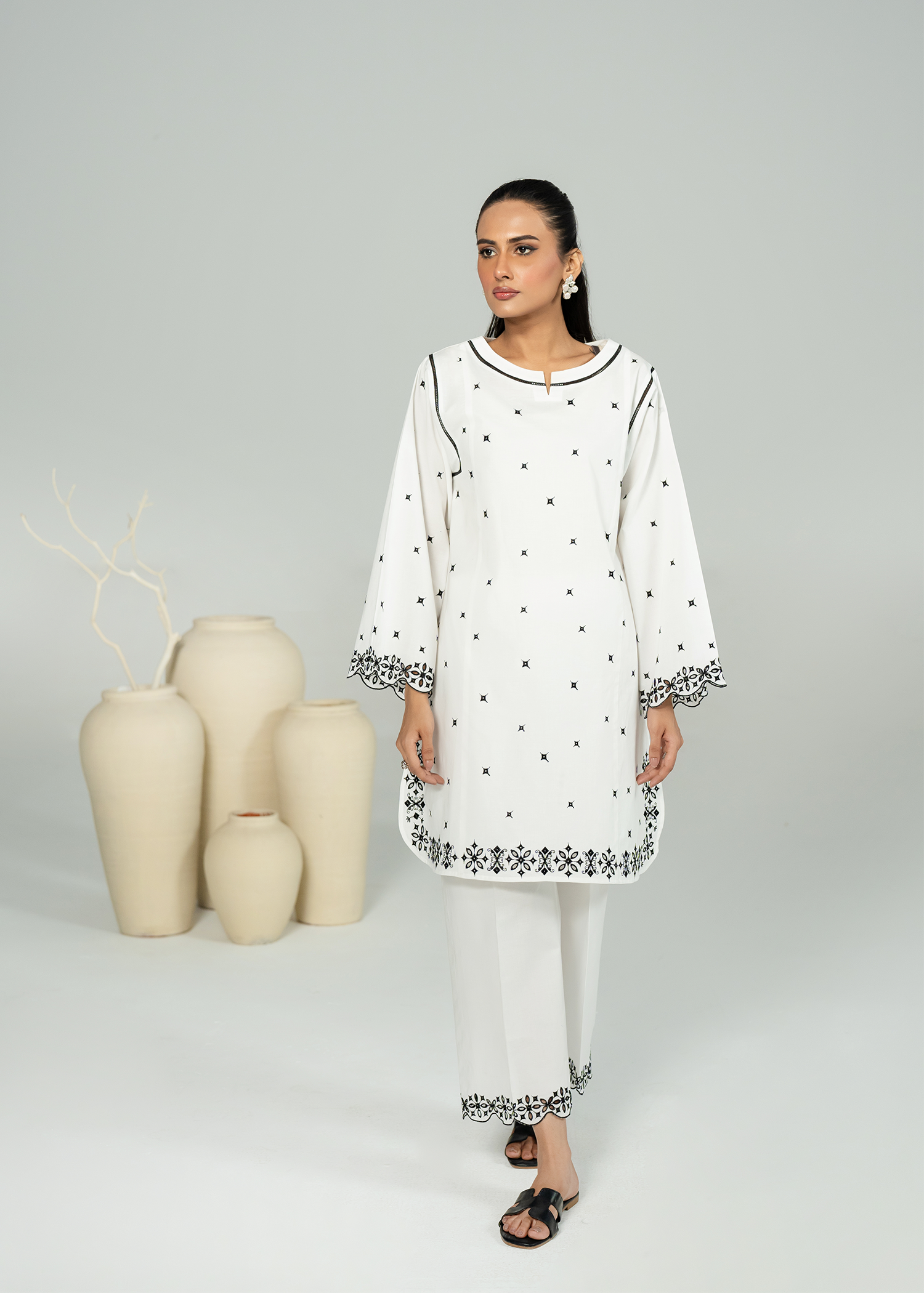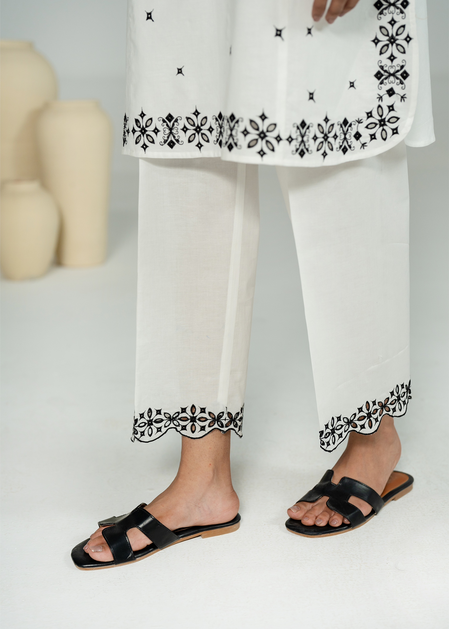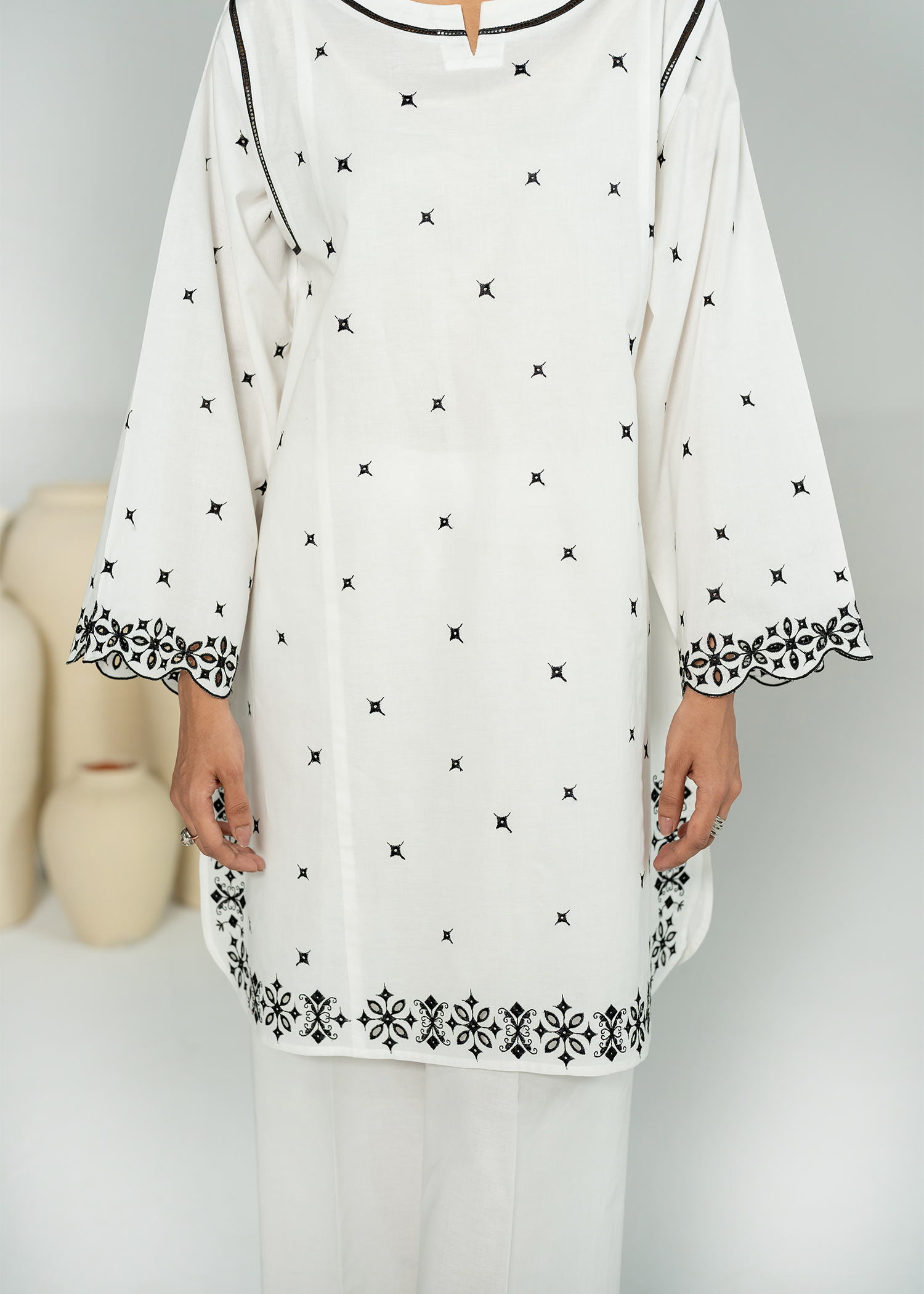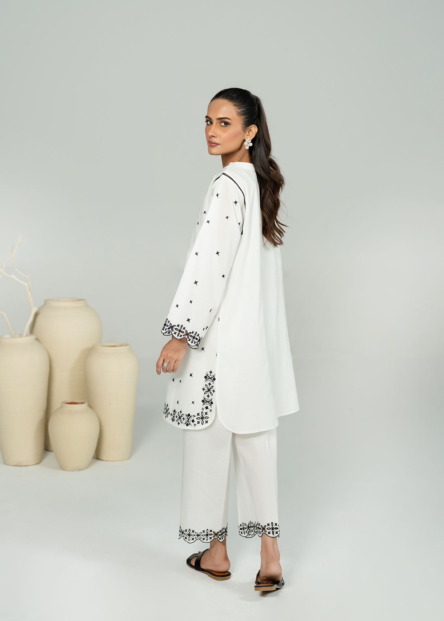White mid length shirt with all over spray embroidery, paired with matching trousers. Features delicate boring details on the hem, sleeves, and trouser openings, all embroidered in classic black for a striking contrast.
